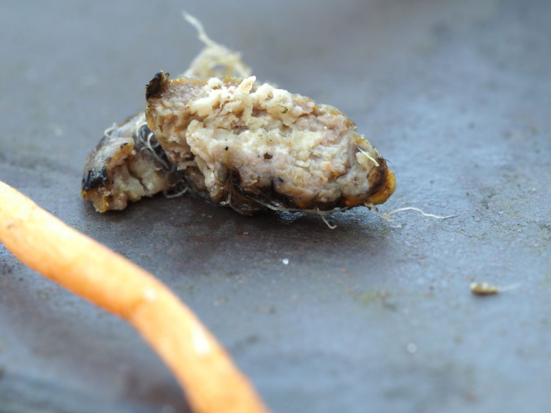 Bei näherer Betrachtung wurde mir aber klar, dass es sich um eine Raupe oder Puppe eines Insekts, evtl. Wiesenschnake Tipula, handelt.