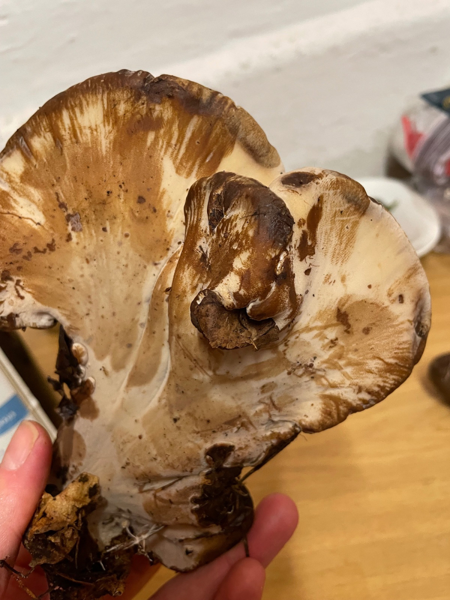 Also Laubholz Harzporling ergibt online zumindest ein paar Bilder, die dem Ganzen sehr ähneln. Riecht aber eher maronig pilzig und hier mal der Pilz im Anschnitt.