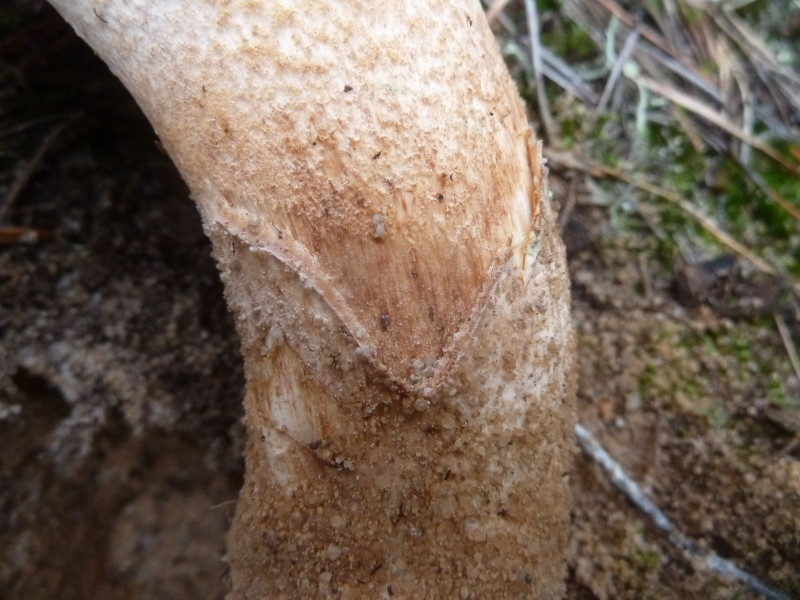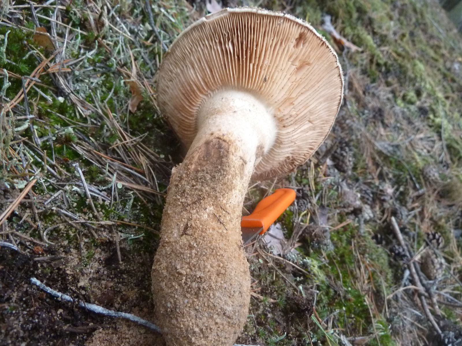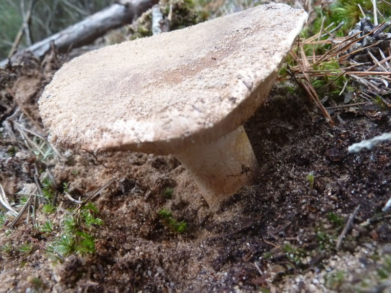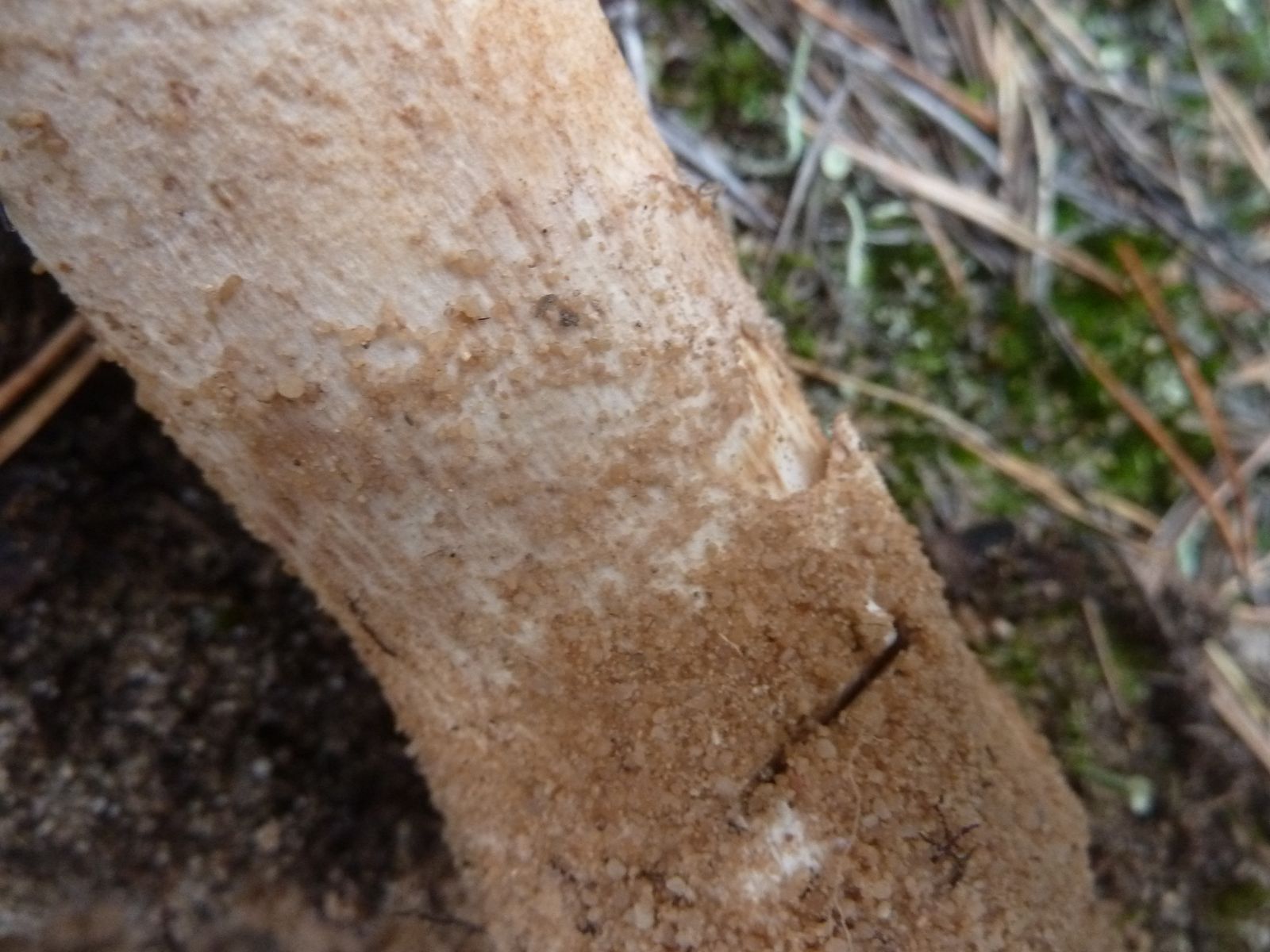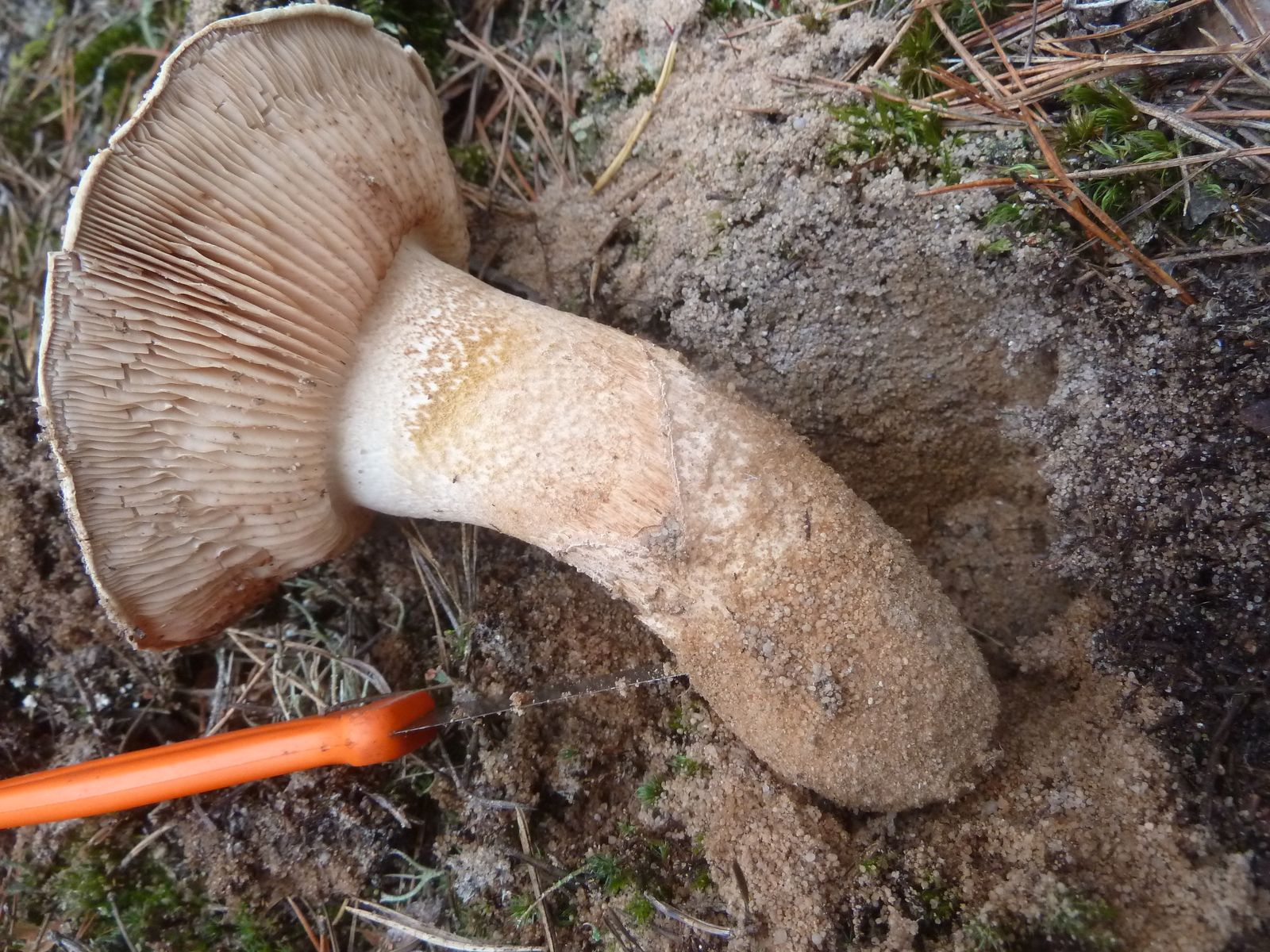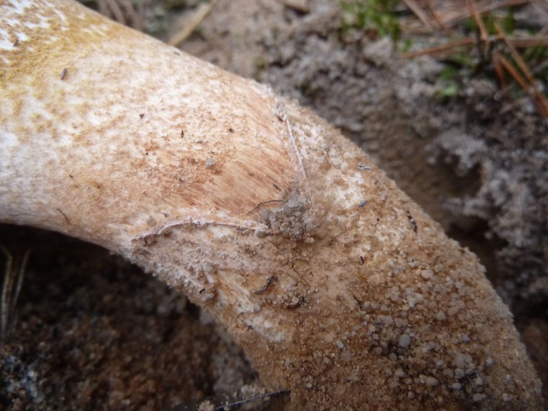 ... innerhalb einer Woche. Gut 100 Meter vom Fundort vergangener Woche habe ich heute einen einzelnen Fruchtkörper aus dem sehr sandigen Boden herauslugen sehen.