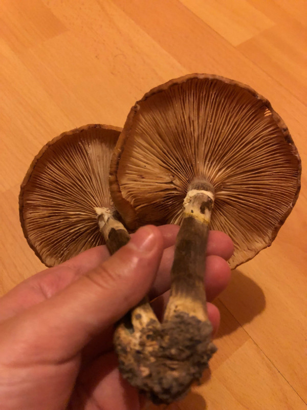 ich denke, dass ist schon ein Hallimasch, wahrscheinlich sich der Honiggelbe. Die Bilder sind aber von der Farbe her nicht gut und Farben sind ein wichtiger Hinweis. Pilzfotos werden an aussagekräftigsten bei Tageslicht. Die Fruchtkörper sind schon weit aufgeschirmt und damit wahrscheinlich zu alt zum Verzehr. Hallimasch wird von einigen Menschen schlecht vertragen, da ist es sinnvoll, sich gut heranzutasten mit kleinen Mengen. Die müssen sehr gut gegart werden, wie viele Pilze sind die roh giftig.