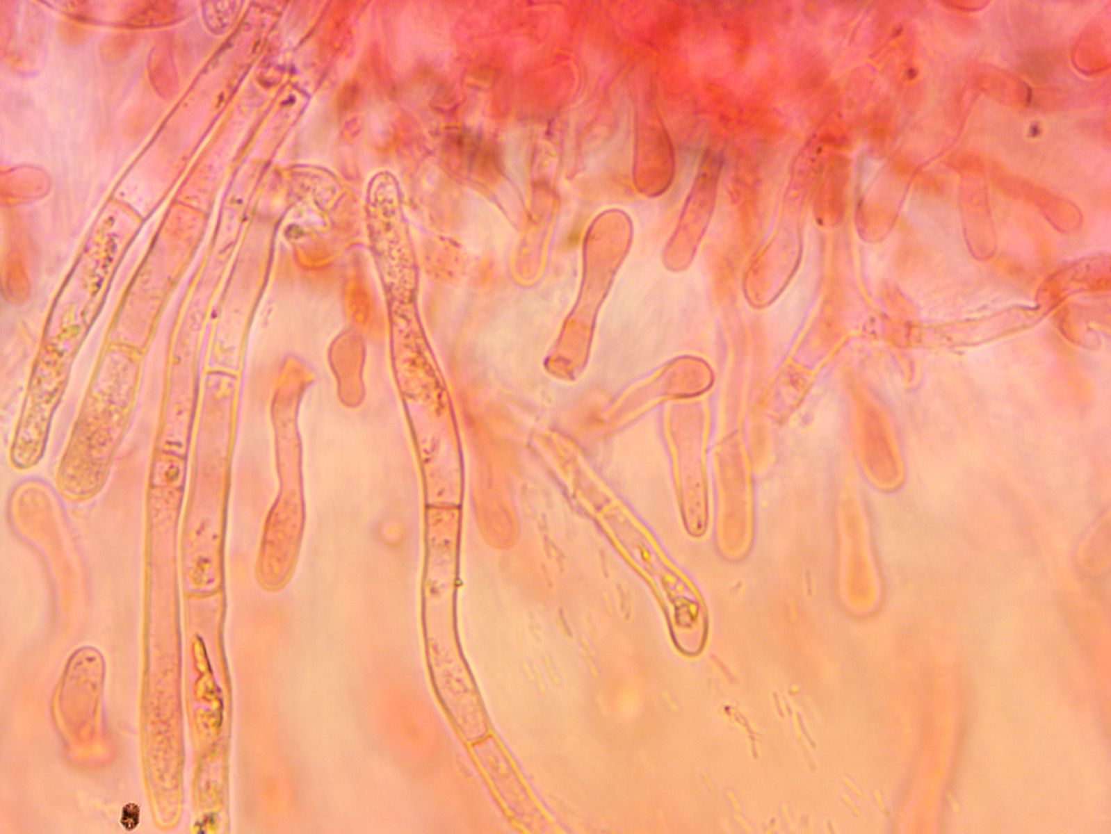 Als Bonus zeige ich euch noch eine inkrustierte Dermatozystide vom Ziegelroten Täubling Russula velenovskyi, der so 20m entfernt gewachsen ist. Dies ist das Markenzeichen des warmroten milden Ockersporers, der gerne unter Fichte, Birke oder Hainbuche steht.