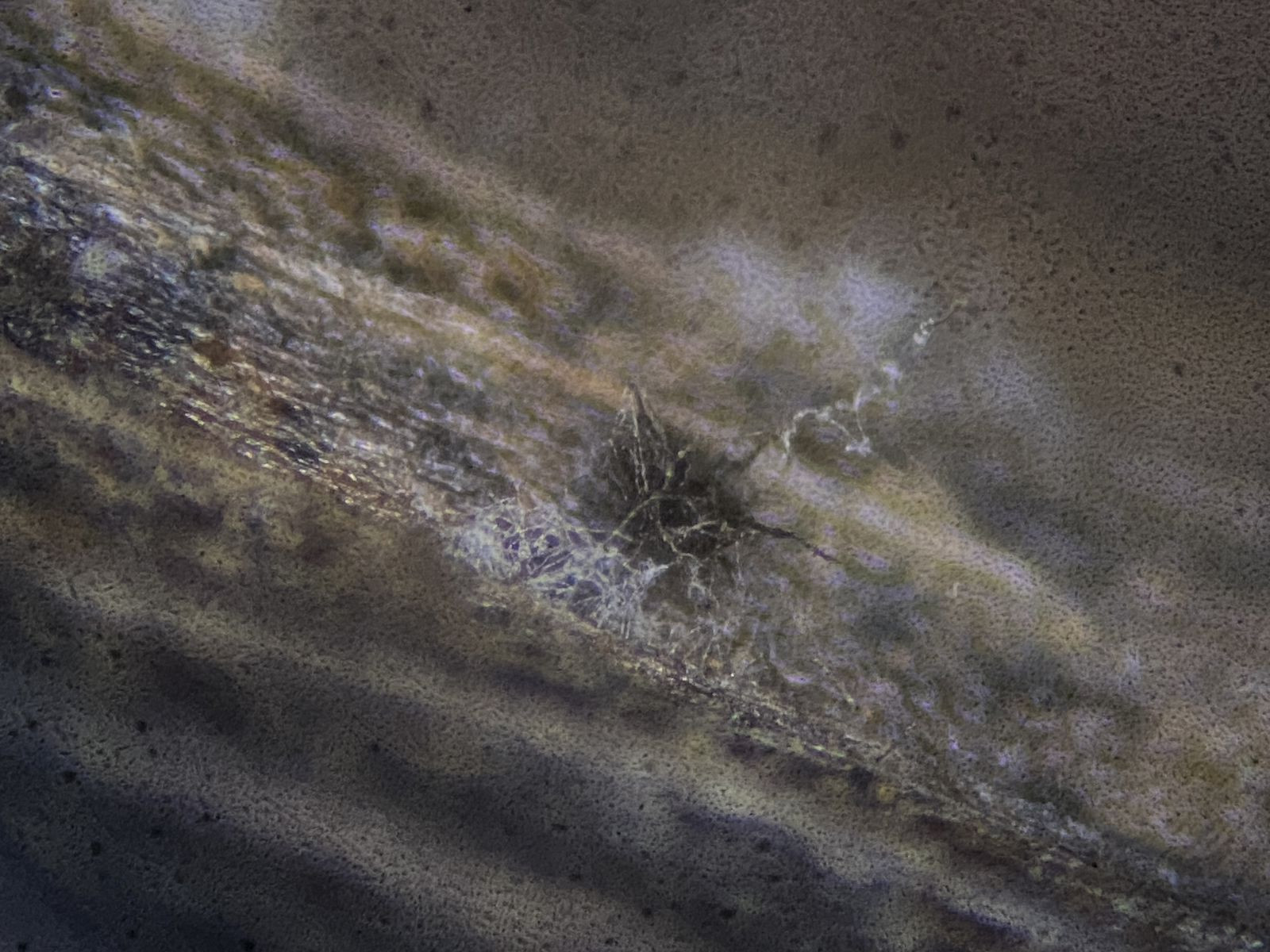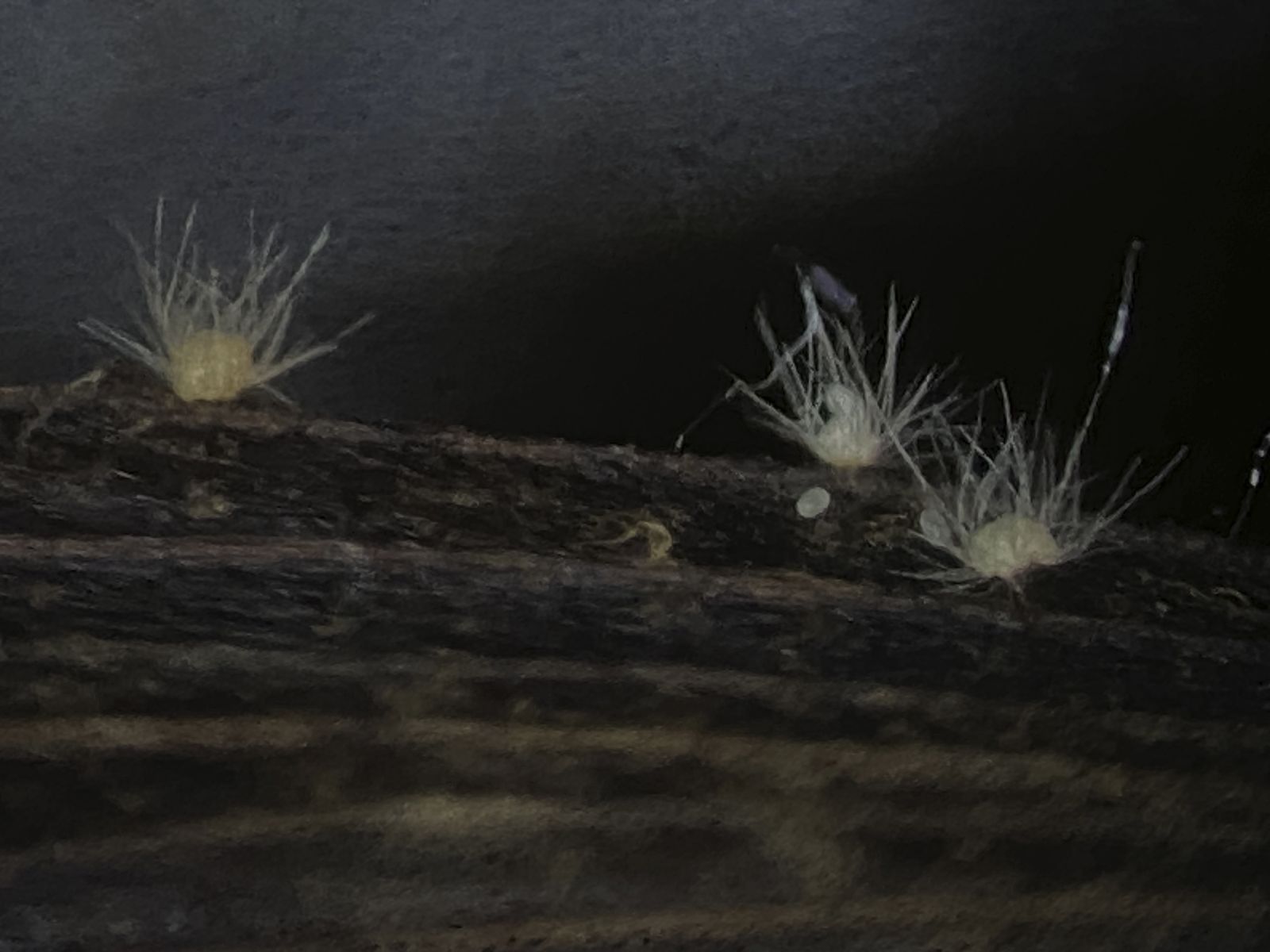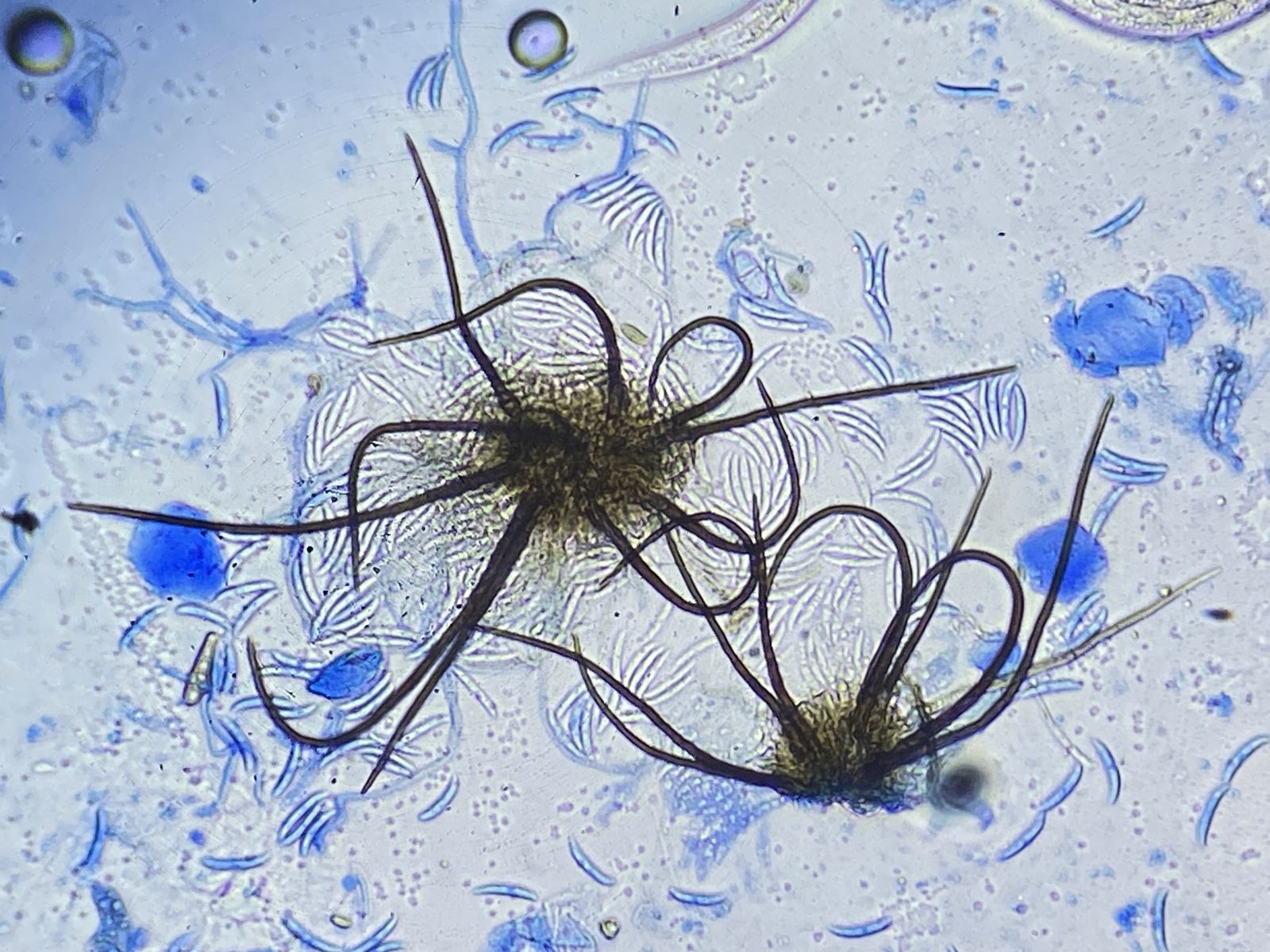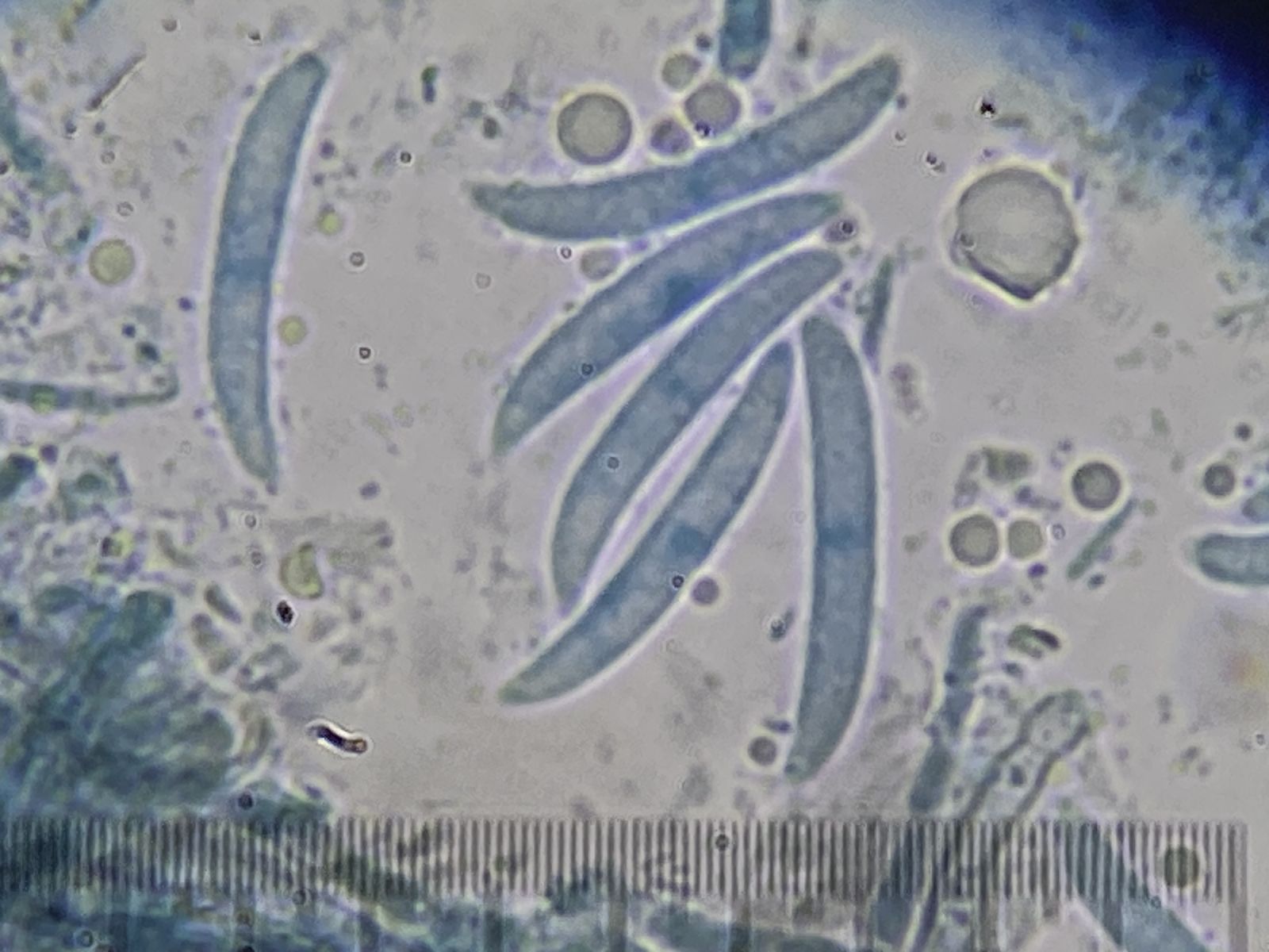 Aber daneben waren auch noch andere, auf dunklem Untergrund kaum zu sehende interessante Pilze mit dunkelbraunen Seten und hyalinen, sichelförmigen Konidien. Diese identifizierte ich als Rattania sp. (2). Mein Problem mit dieser Bestimmung ist, dass sie nicht mit der Beschreibung bei Seifert et. al. (Eine Species in Indien nachgewiesen) übereinstimmt . Zudem sah ich auch die Anhängsel (polar setulae) an den Konidien nicht.
