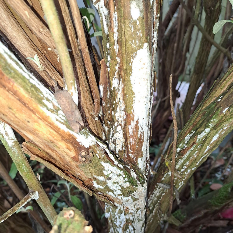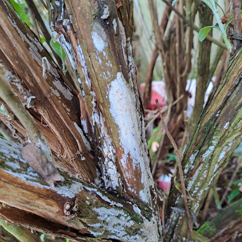 Hallo liebe Pilzfreunde, Ich habe auf einem Schmetterlingsflieder diese Weißen Pilze entdeckt: In der Nähe stehen Stühle die einen weißen Belag haben Können das 2 verschiedene Pilze sein? Etwa Weißfäule? Vielen Dank und ich freue mich über Info. Pilzige Grüße Lila