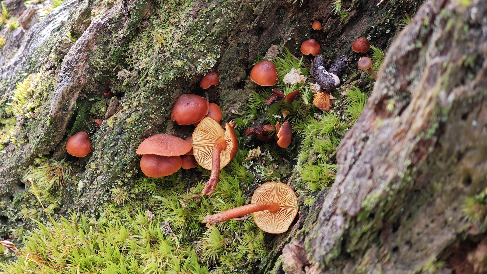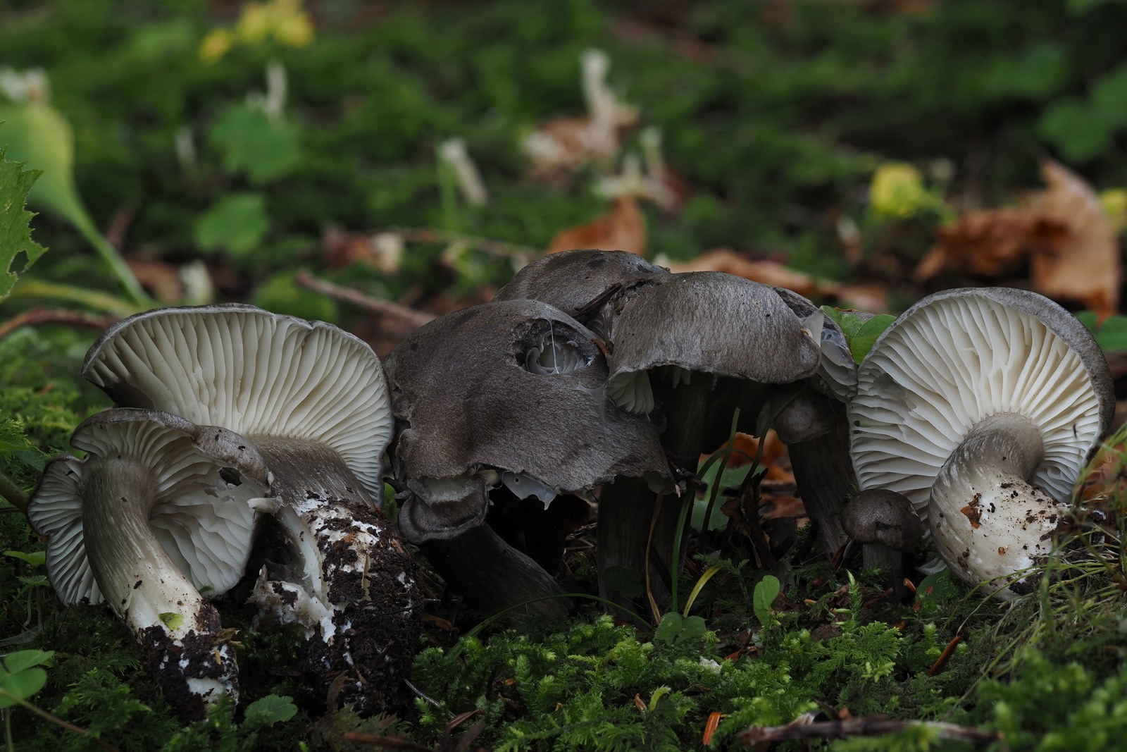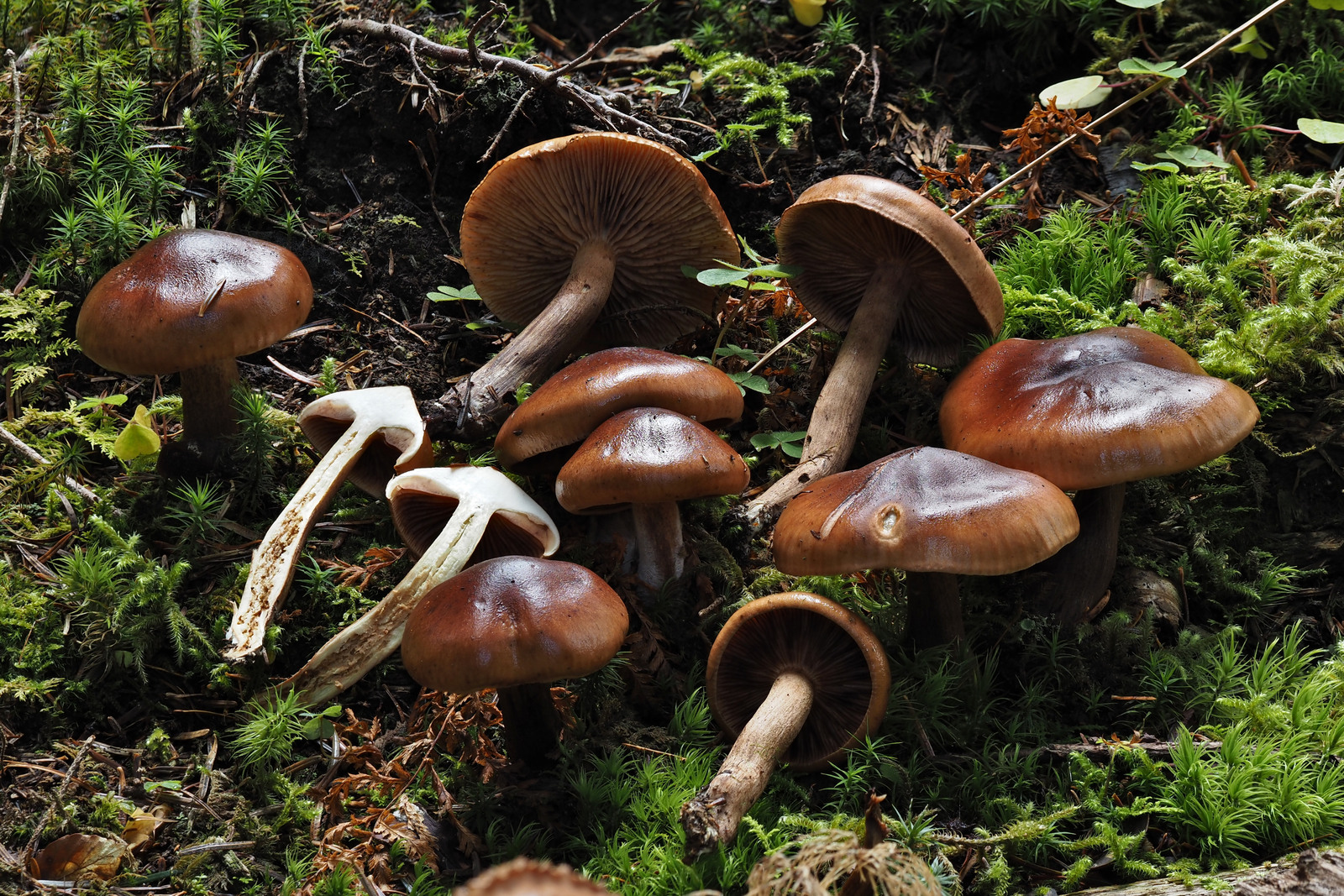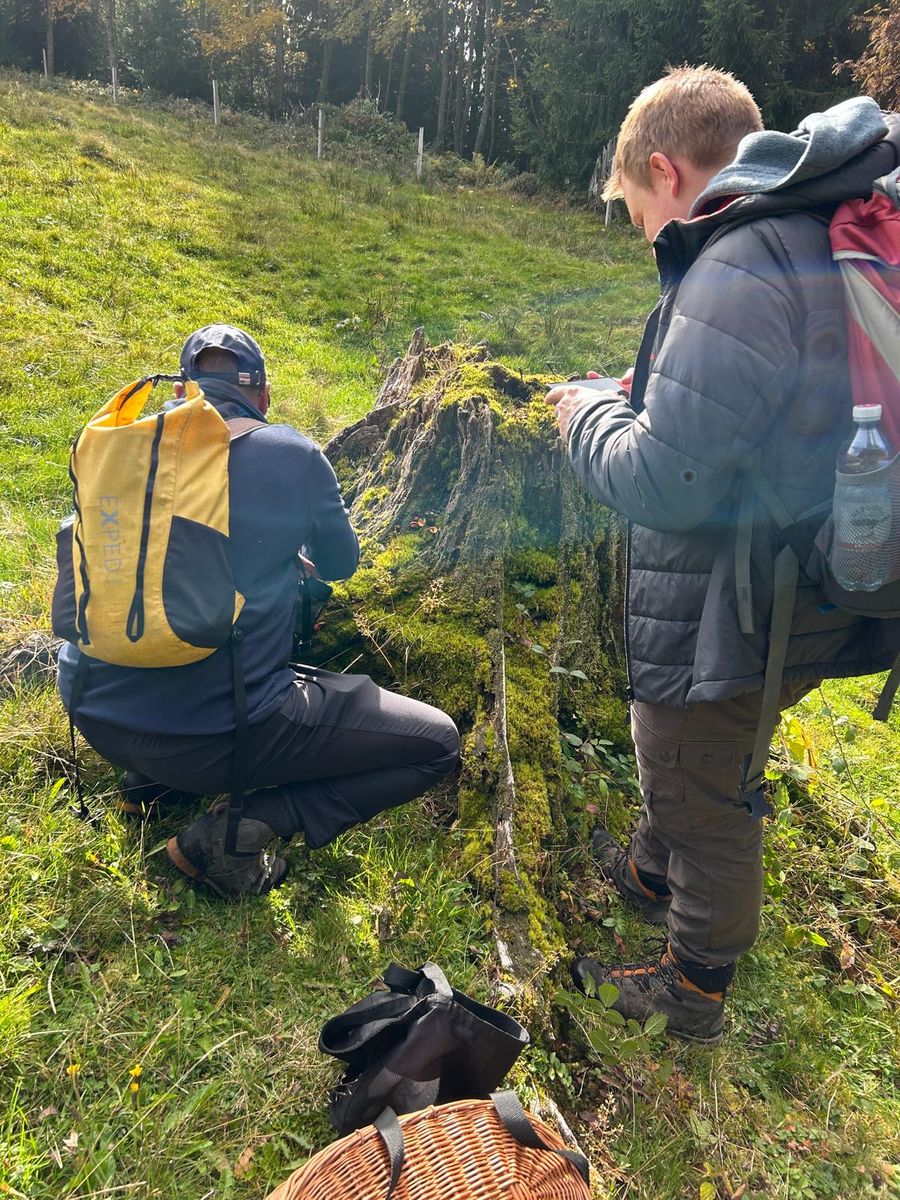 12. Zum Schluss möchte ich noch mit dem aus meiner Sicht Highlight unserer Exkursion abschliessen. Diese schöne Gruppe Schnecklinge liess sich schon ziemlich am Anfang blicken. Vor Ort haben wir schon einmal kurz nachgeschaut, was das sein könnte und wir gaben ihm schon mal den Arbeitsnamen Schwarzfaseriger Schneckling (Hygrophorus atramentosus). Wir haben abgemacht, dass wir uns das ganze zuhause dann nochmal genau anschauen werden.
