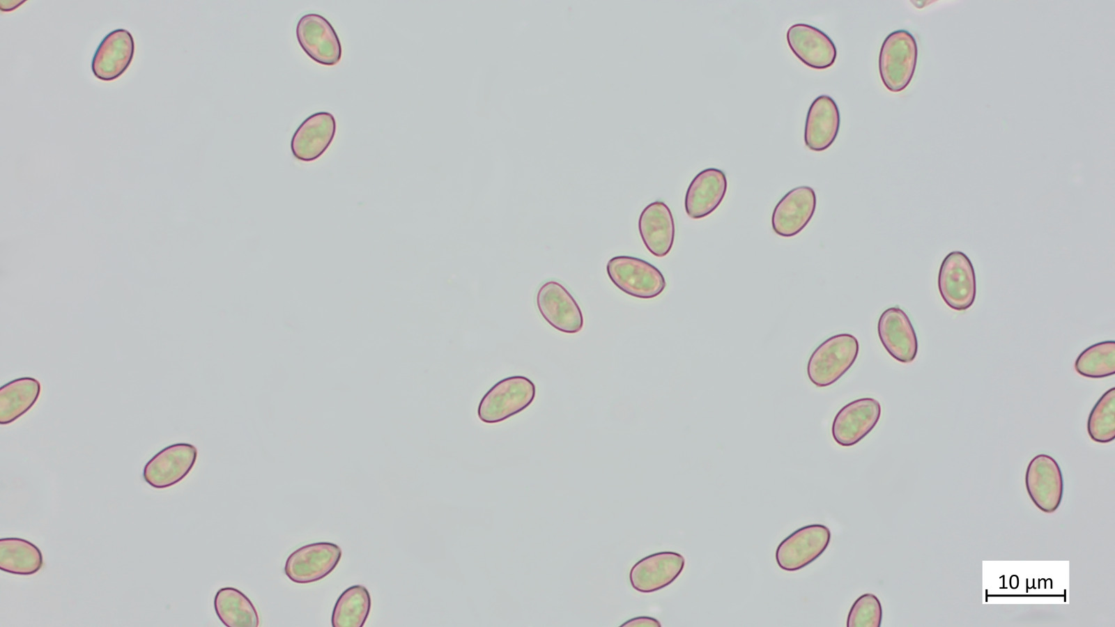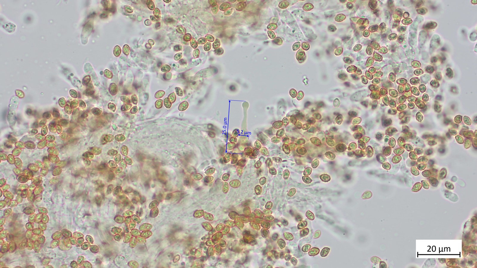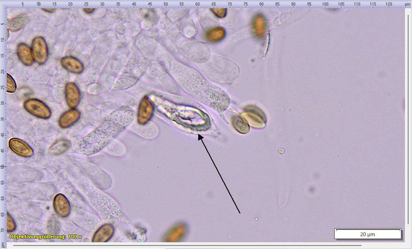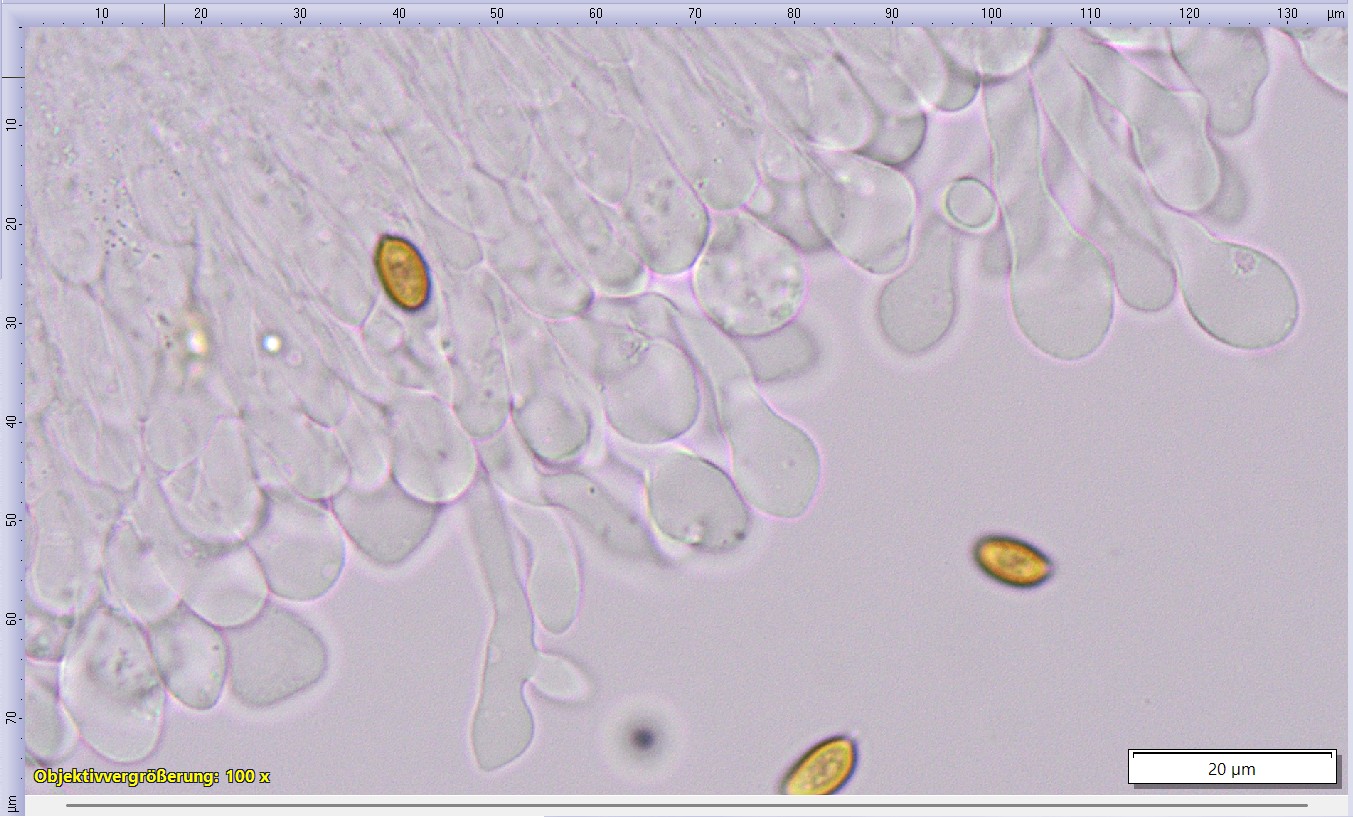 Ich habe noch die Sporen angeschaut: 8.1 µm (7.0–10.0 µm) × 5.4 µm (4.3–6.0 µm), Q = 1.51 (1.31–2.00), 35 Sporen gemessen