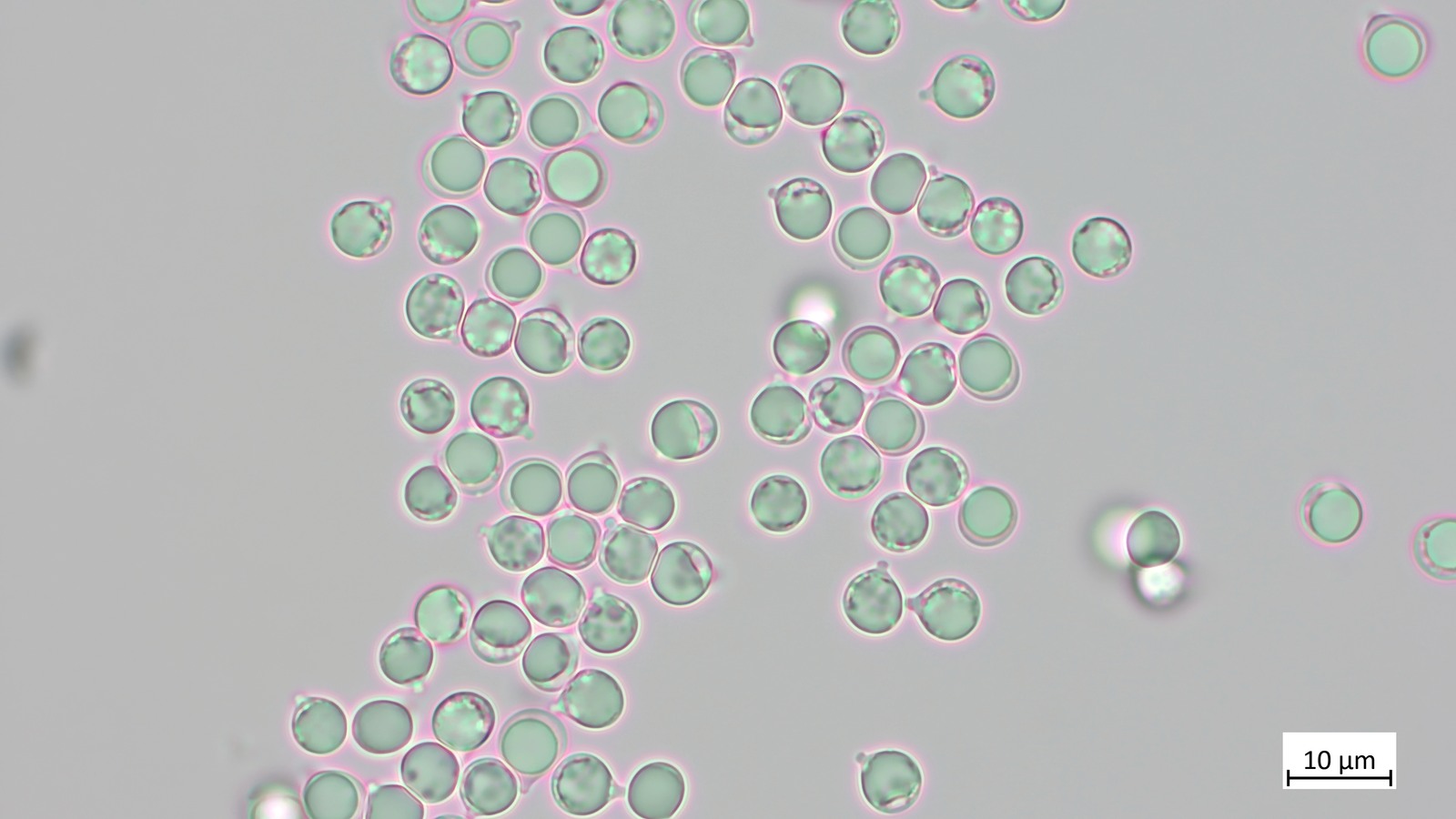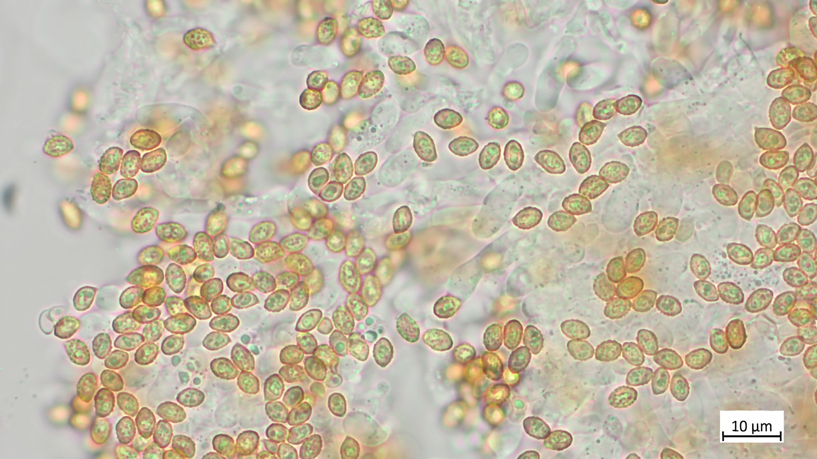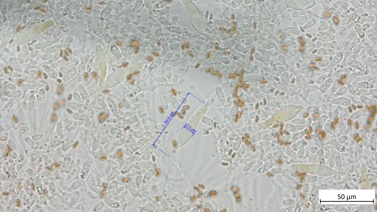 Ich habe noch die Sporen angeschaut: 8.1 µm (7.0–10.0 µm) × 5.4 µm (4.3–6.0 µm), Q = 1.51 (1.31–2.00), 35 Sporen gemessen