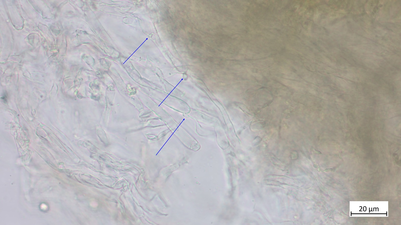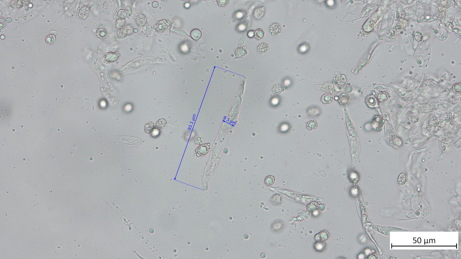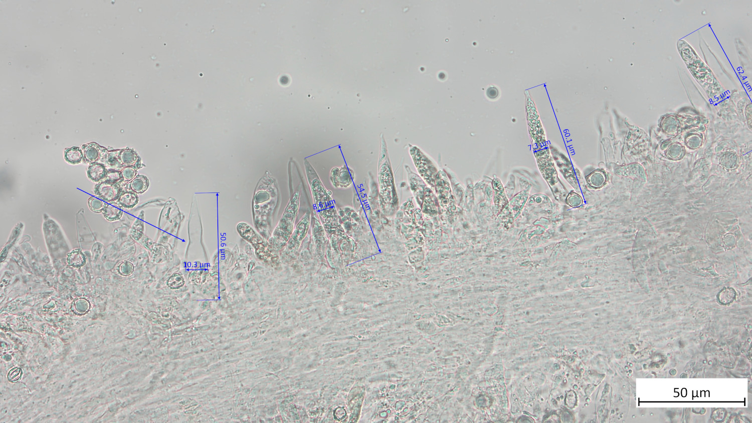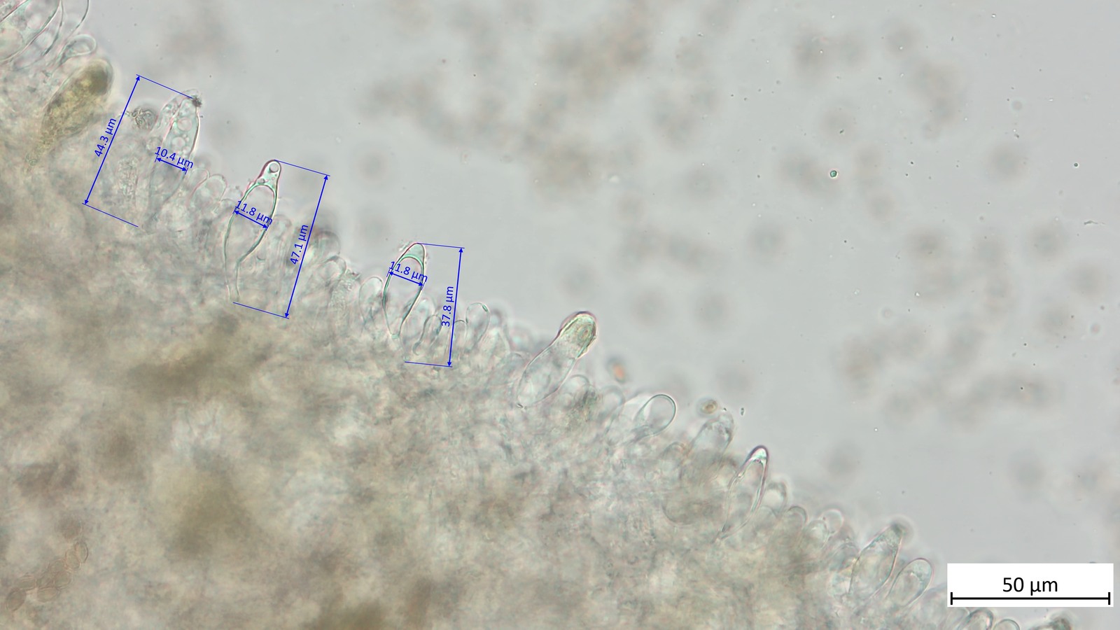 Zystiden im oberen Teil gelblich in KOH. Hier bei den Pleurozystiden zu sehen: