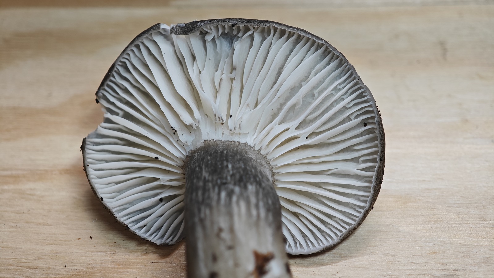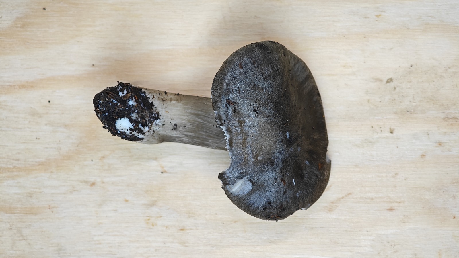 Ich habe mich dann mal gemeldet und geschrieben, dass mich der fettgedruckte Teil im Ludwig Stiel schlank, 1.2 bis 1.5cm etwas verunsichert. Da mir der Stiel eigentlich nicht besonders schlank vorkam und etwa 2cm mass. Die in Frage kommende Alternative Russbrauner Schneckling (Hygrophorus camarophyllus) passte aus meiner Sicht aber schlechter, da ich den von Ludwig beschriebenen deutlichen Braunanteil bei unseren Pilzen nirgendwo sehen konnte. Zudem soll sich der Standort unterscheiden, H. atramentosus auf basischen Böden, H. camarophyllus auf sauren Böden. Wir gingen eher von basisch am Fundort aus.