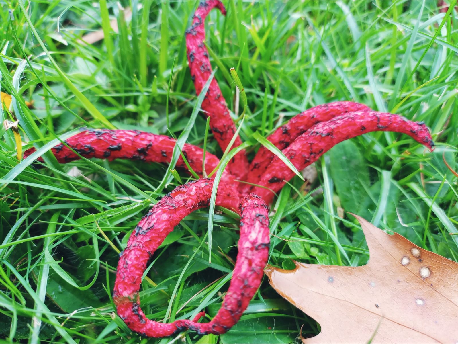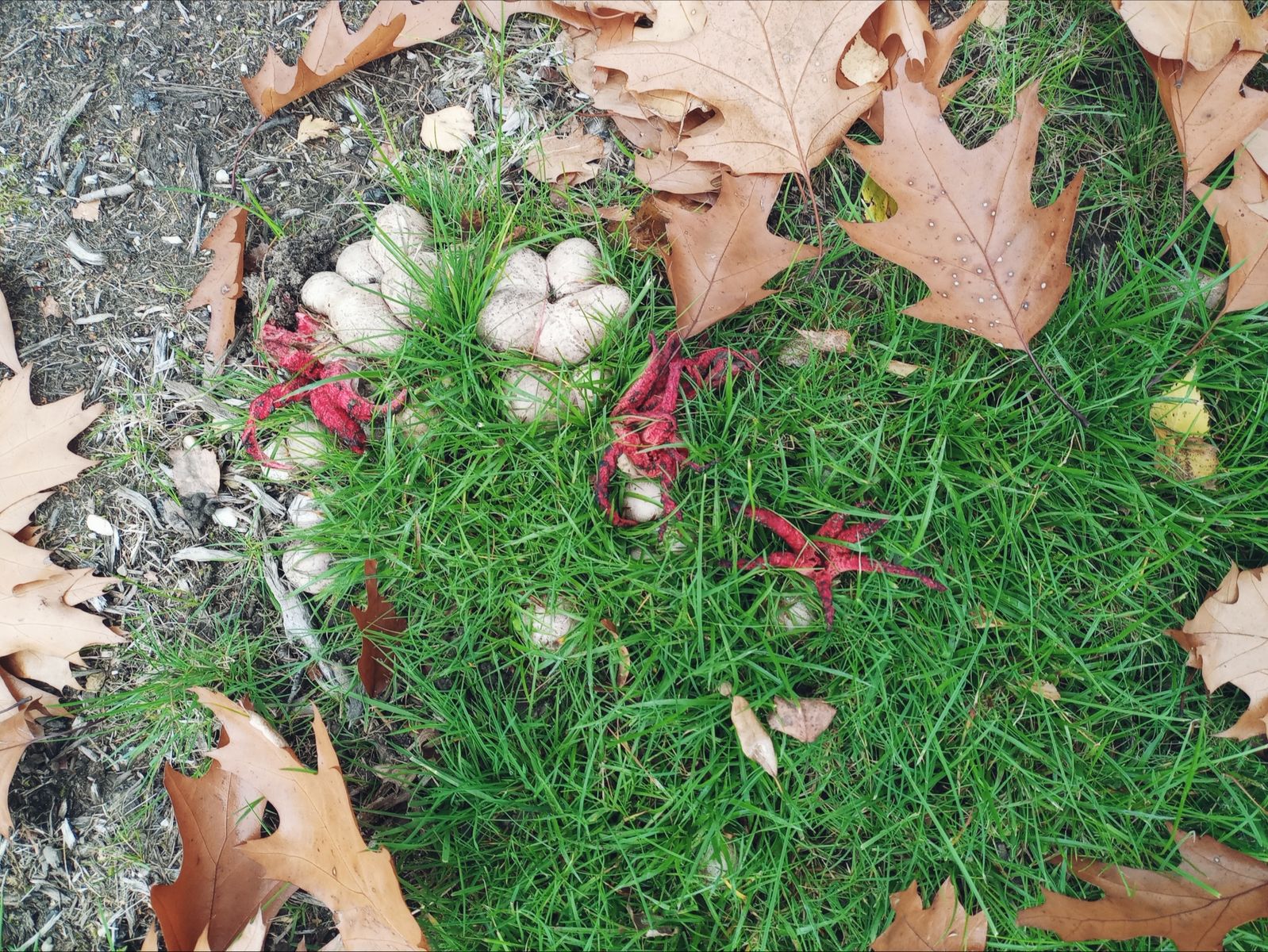 Die Menge an Hexeneiern und Fruchtkörpern ist unüberschaubar, auf einer aufgeschütteten Fläche, aber auch im Gras darum herum. Es werden mindestens 300 sein, eher mehr.