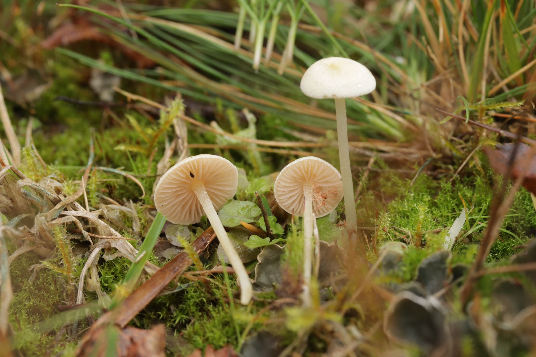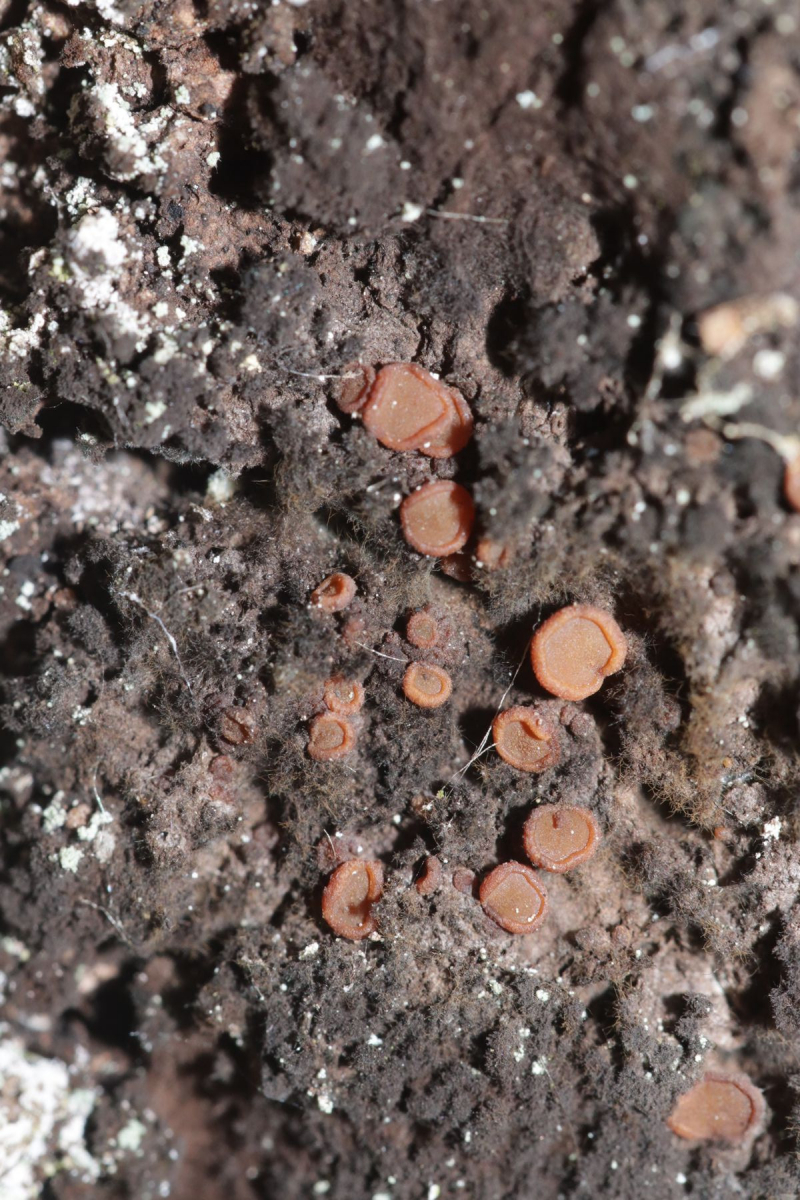 1. Der erste Fund im Herbst ist immer dieser kleine Pilz, der in der Vergangenheit als Arrhenia rustica auf der Liste gelandet ist. Als ich mir dann letztes Jahr die Sporen angeschaut habe, war schnell klar, daß es eine Lichenomphalia sein muß. Also habe ich den Pilz dieses Jahr einmal komplett mikroskopiert. Die Sporen messen 6,8±0,5 µm × 3,9±0,4 µm, Q=1,7±0,2; 6,1-7,6 µm × 3,1-4,5 µm, Q=1,5-2,1, Schnallen sind nicht vorhanden, Cheilozystiden fehlen ebenso, die Basidien sind 1- bis 4-sporig. Leider habe ich jetzt immer noch keine gute Idee, um welche Art es sich hier genau handelt; es scheint auch wenig gute Literatur zu dieser Gattung zu geben.