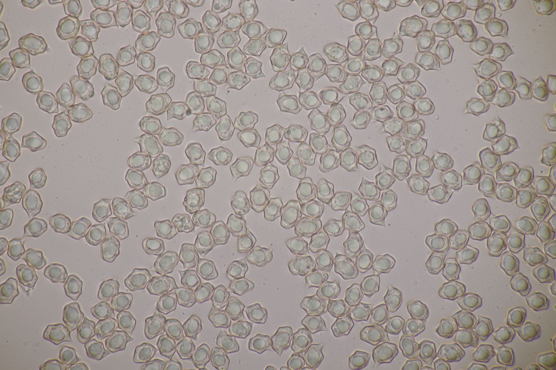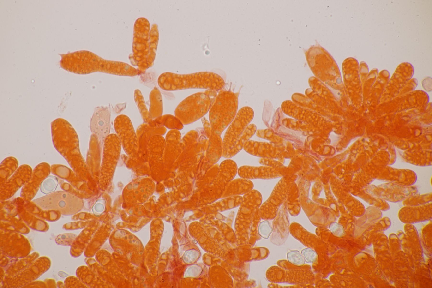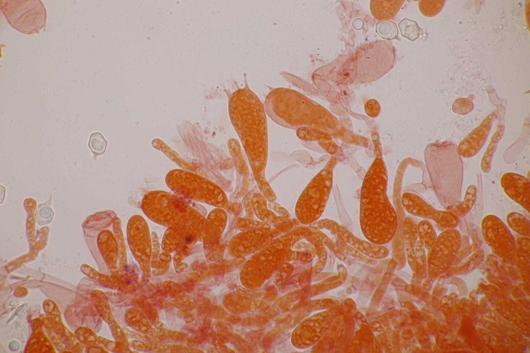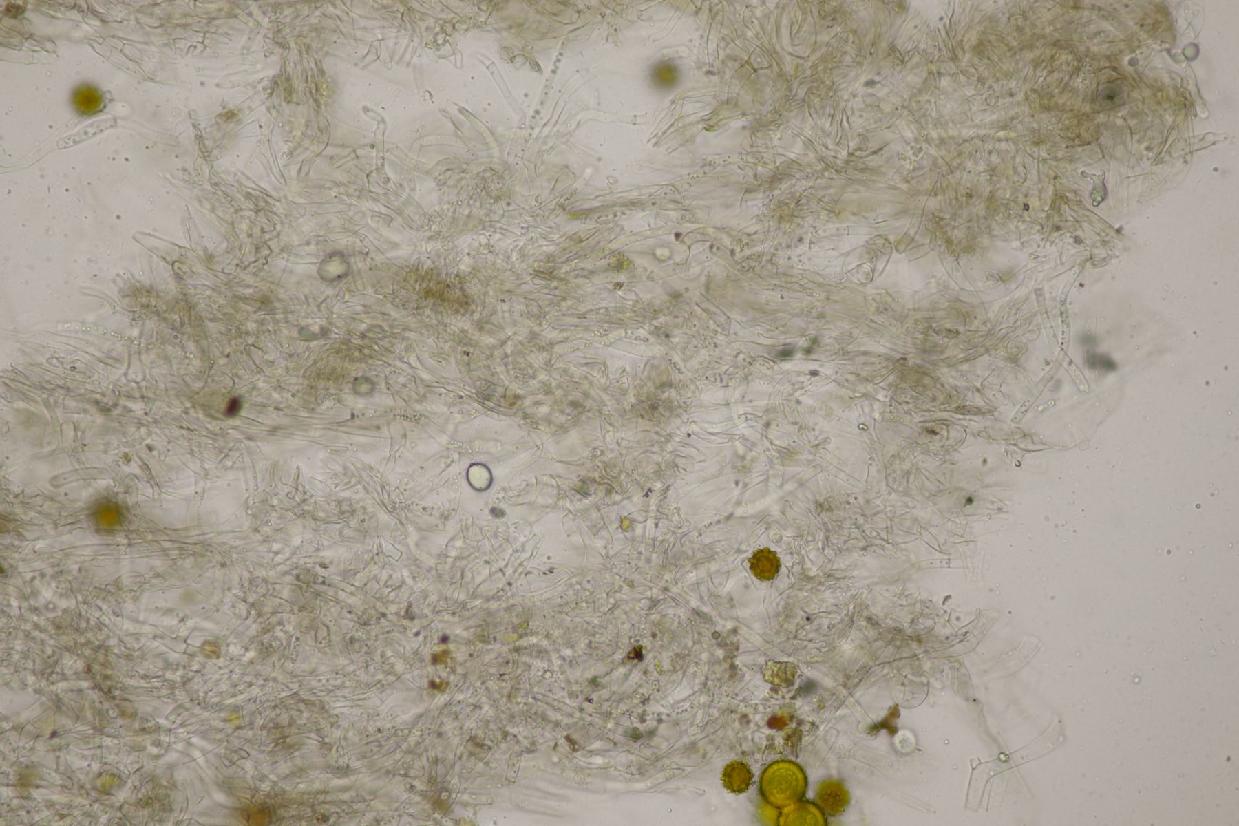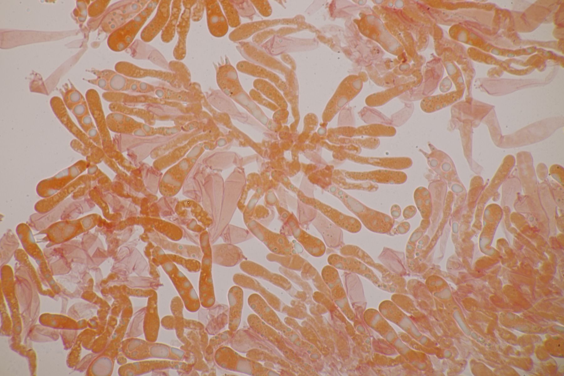 2. Der nächste mysteriöse Pilz. Eine Keule, die von den Sporen her zu C. falcata passen würde, aber die sollte ja nicht so einen Gelbstich haben. Sporenmaße 8,1±0,5 µm × 6,9±0,5 µm, Q=1,2±0,1; 6,9-9 µm × 5,6-7,7 µm, Q=1,1-1,3