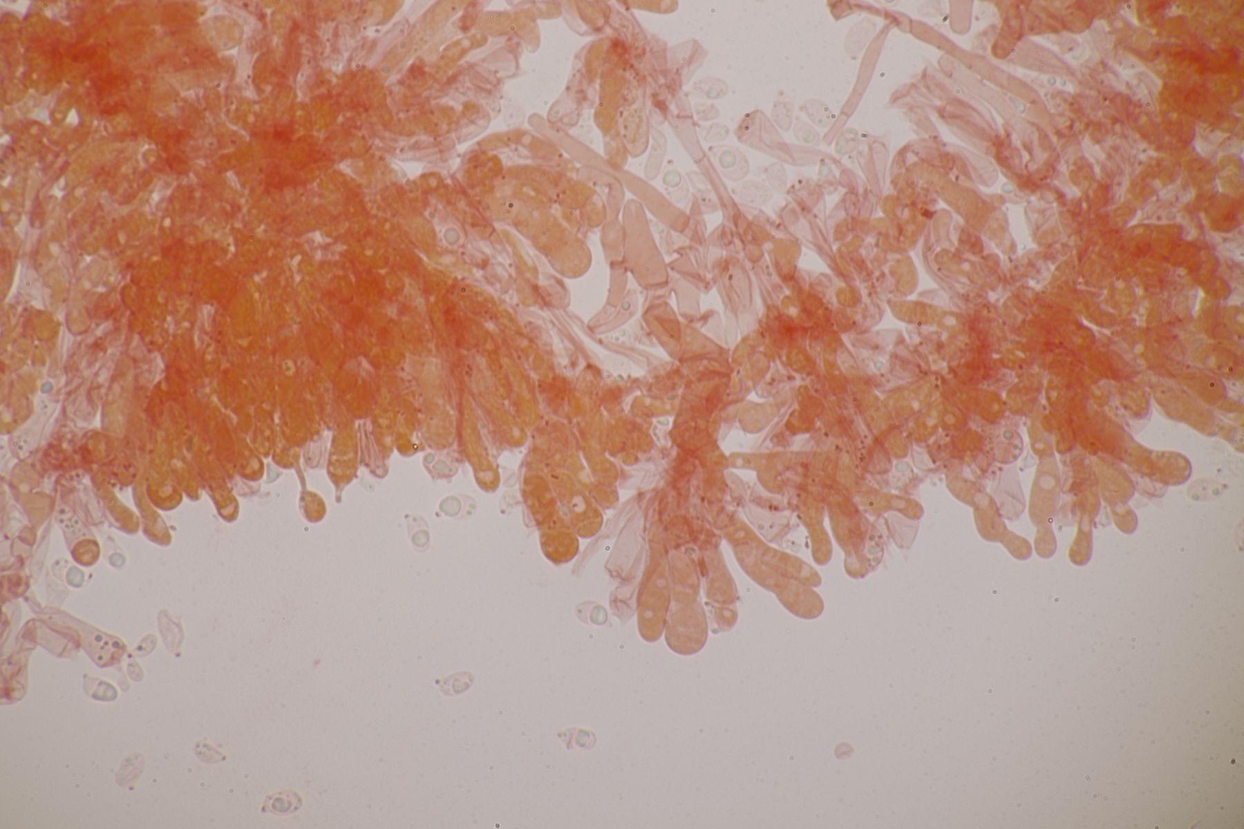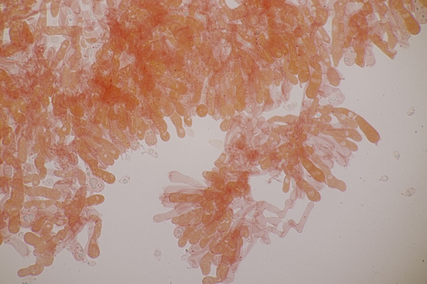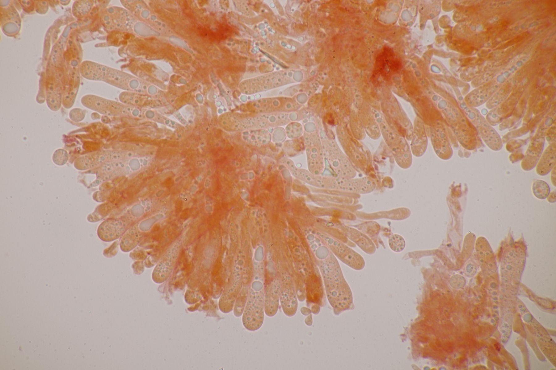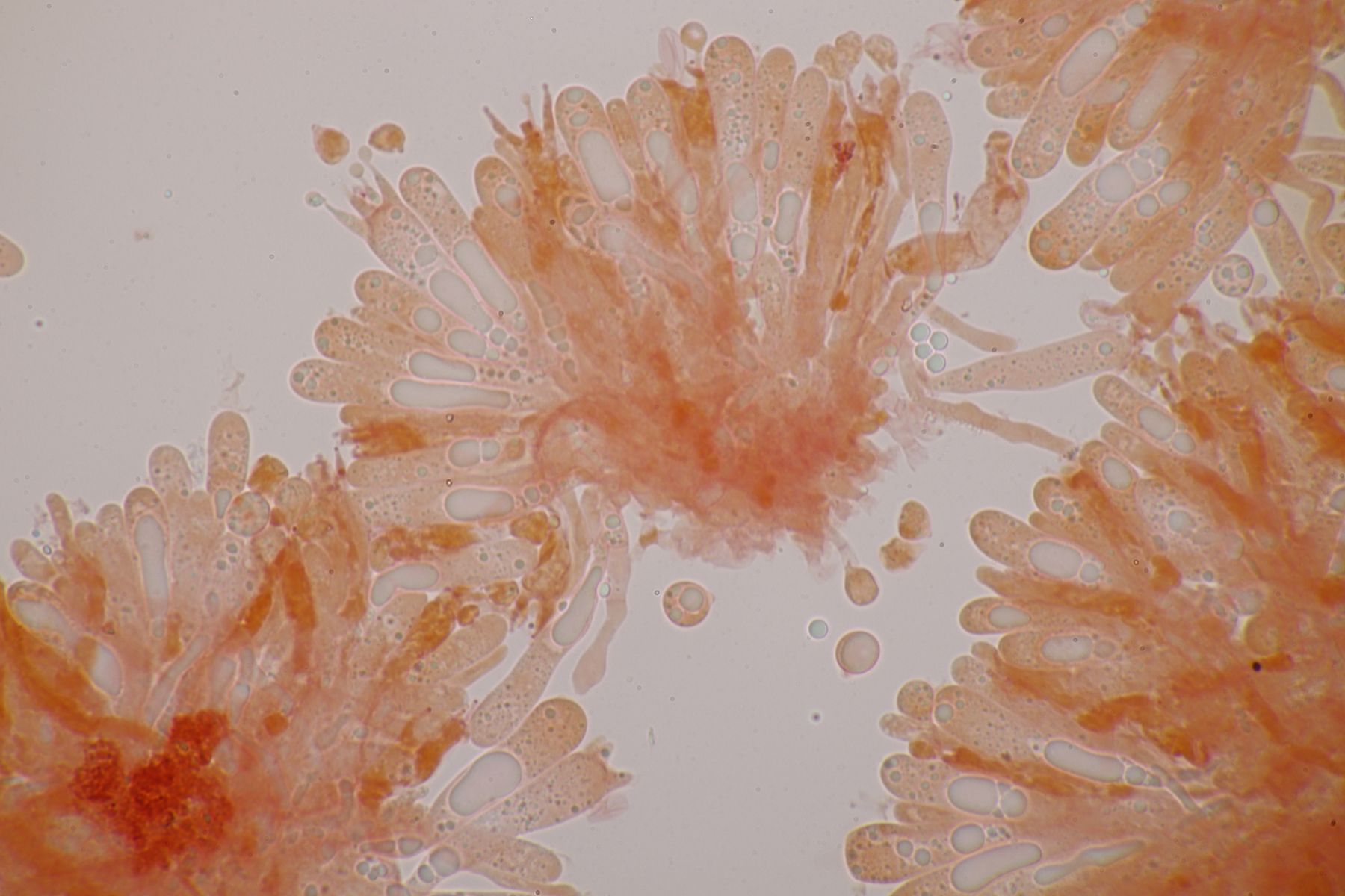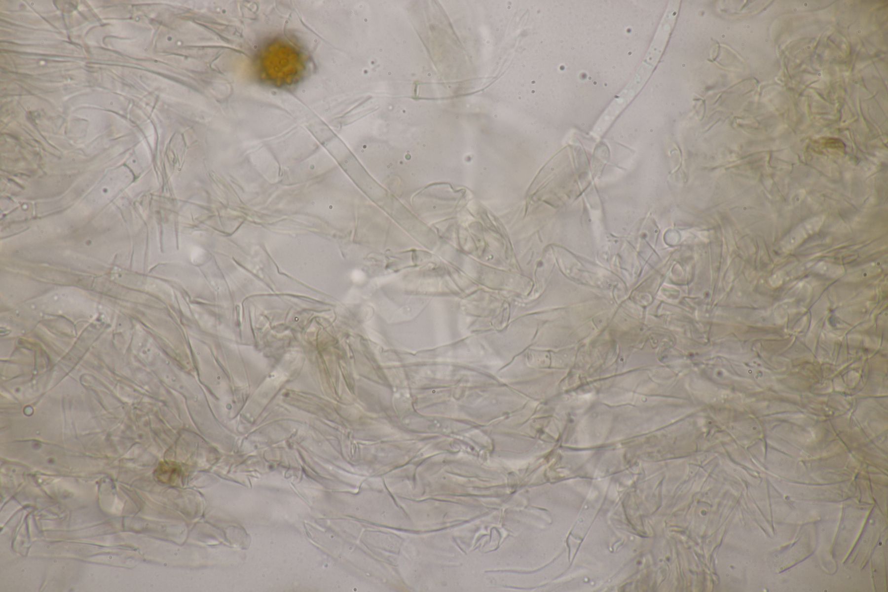 2. Der nächste mysteriöse Pilz. Eine Keule, die von den Sporen her zu C. falcata passen würde, aber die sollte ja nicht so einen Gelbstich haben. Sporenmaße 8,1±0,5 µm × 6,9±0,5 µm, Q=1,2±0,1; 6,9-9 µm × 5,6-7,7 µm, Q=1,1-1,3