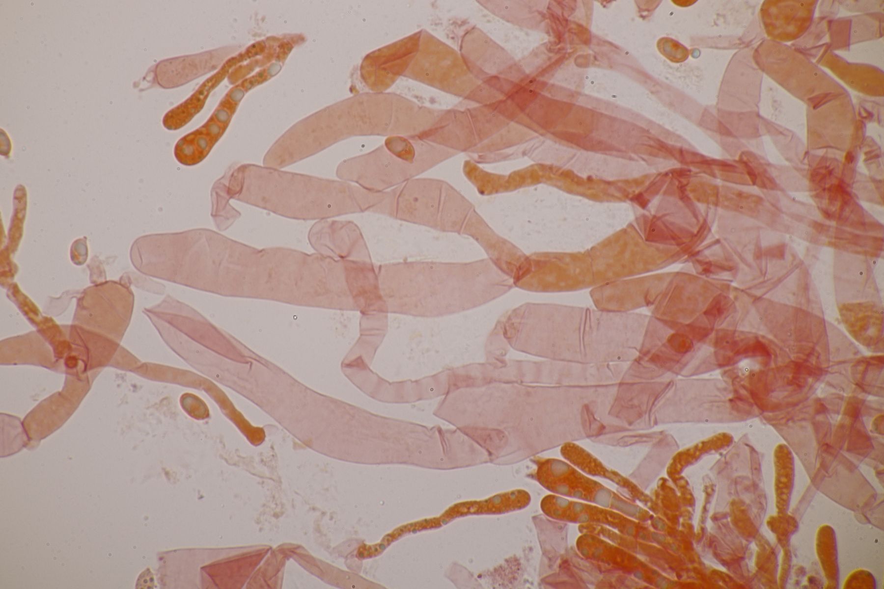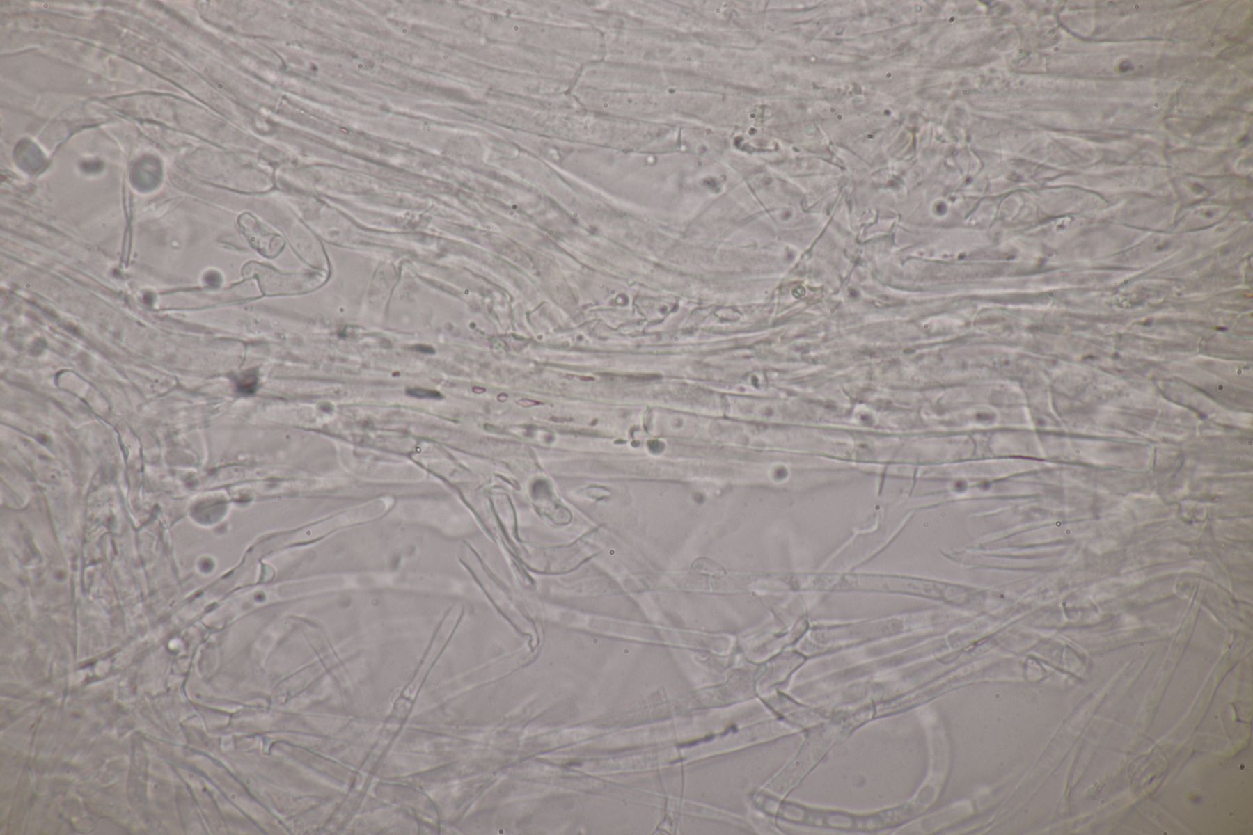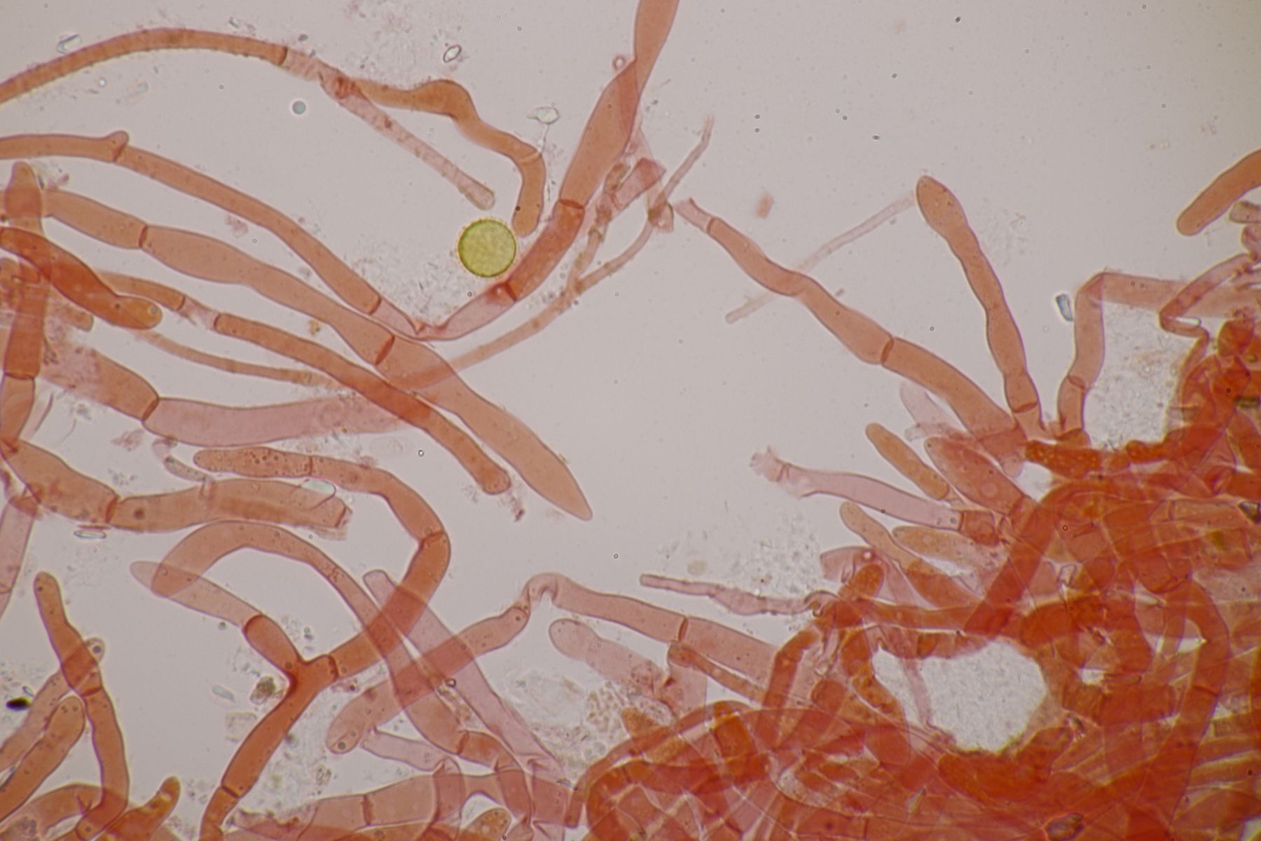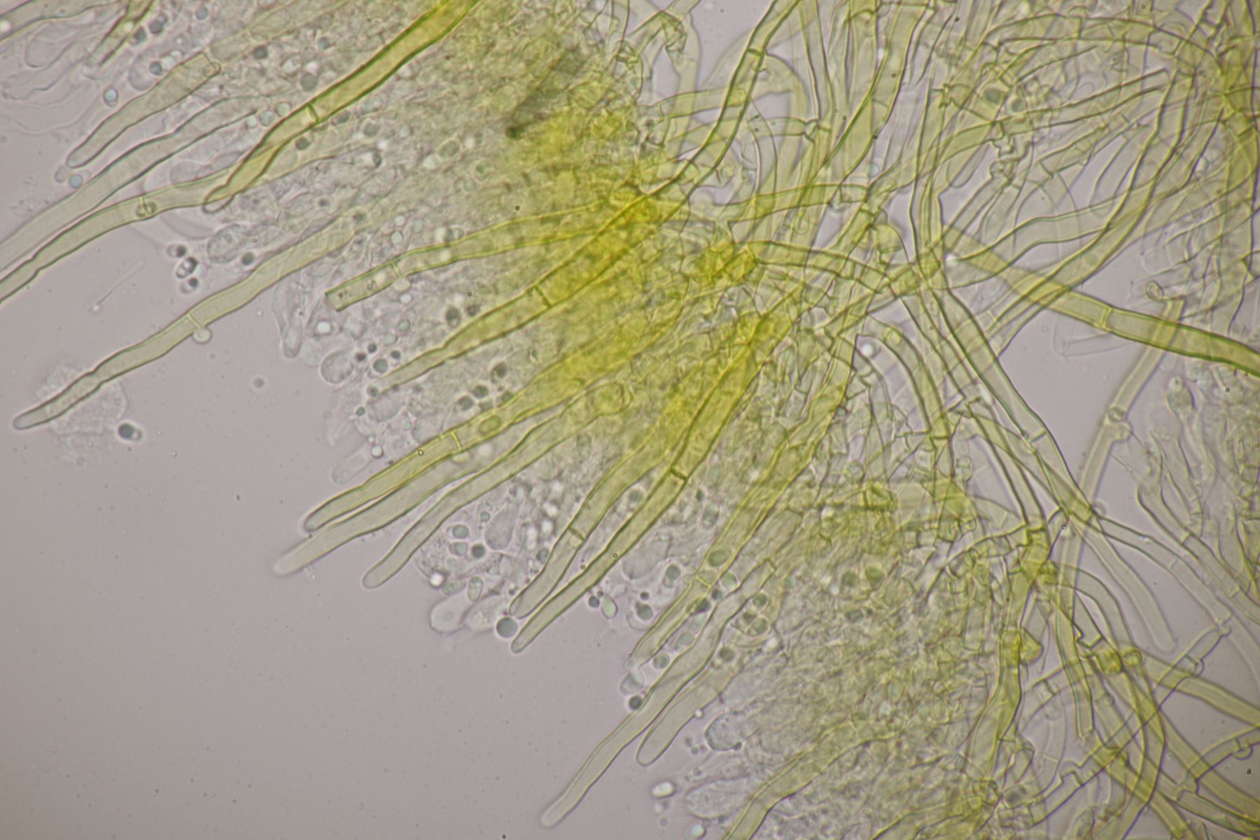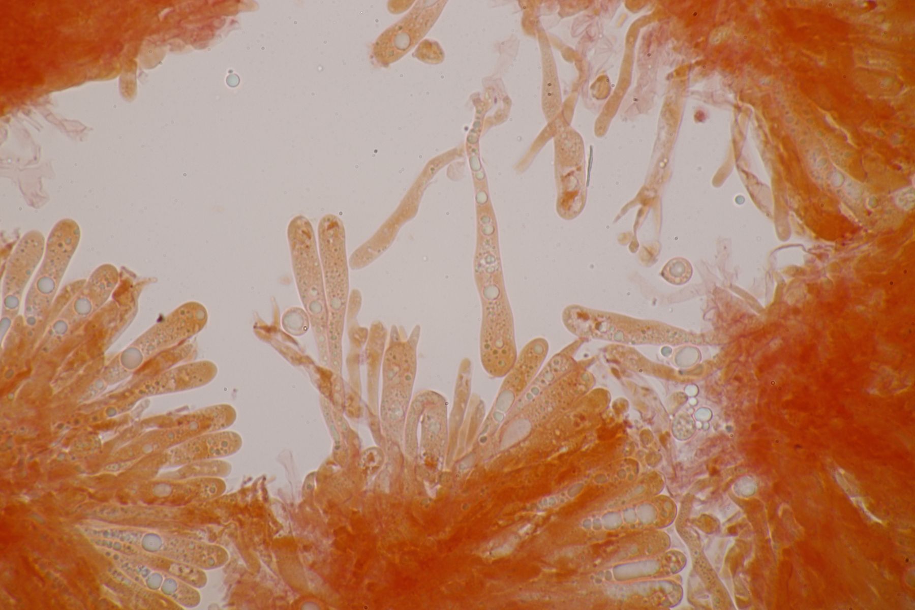 2. Der nächste mysteriöse Pilz. Eine Keule, die von den Sporen her zu C. falcata passen würde, aber die sollte ja nicht so einen Gelbstich haben. Sporenmaße 8,1±0,5 µm × 6,9±0,5 µm, Q=1,2±0,1; 6,9-9 µm × 5,6-7,7 µm, Q=1,1-1,3
