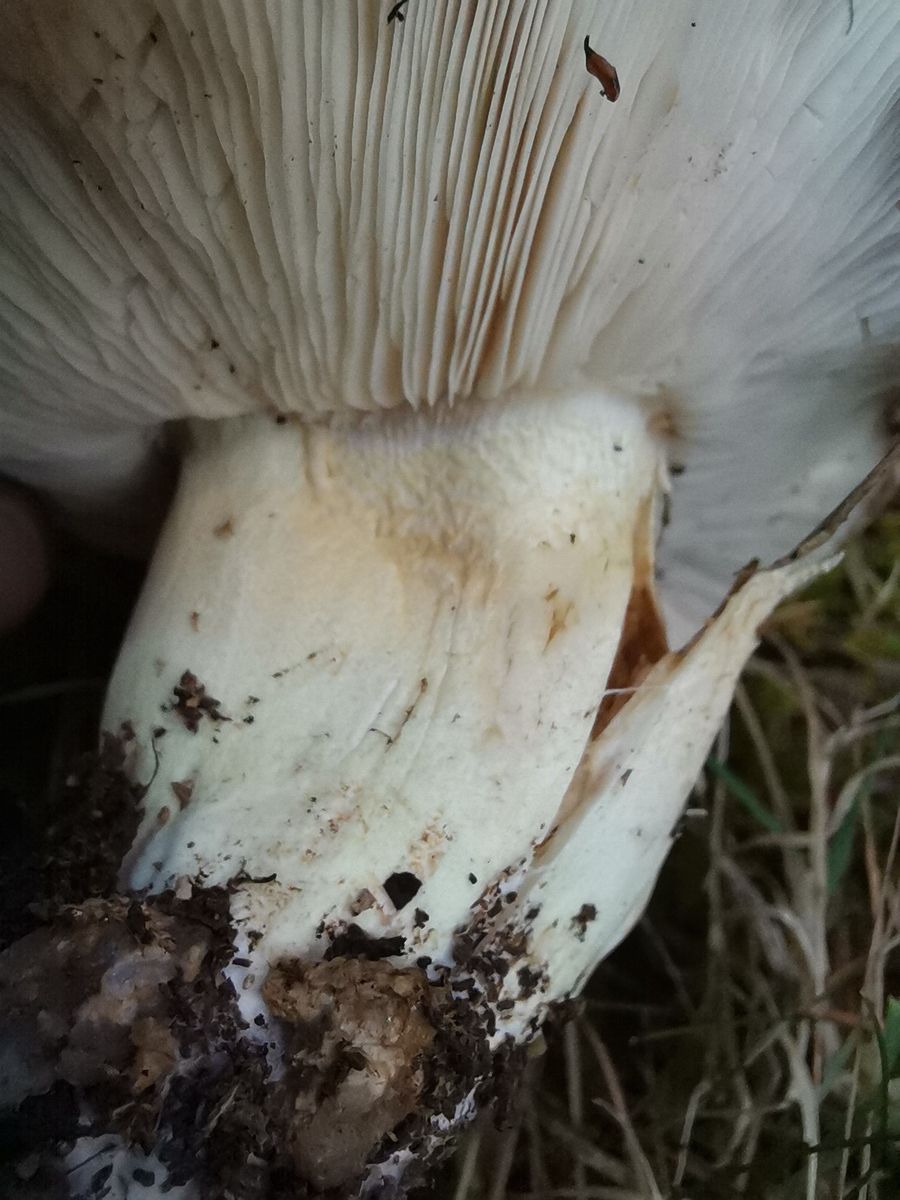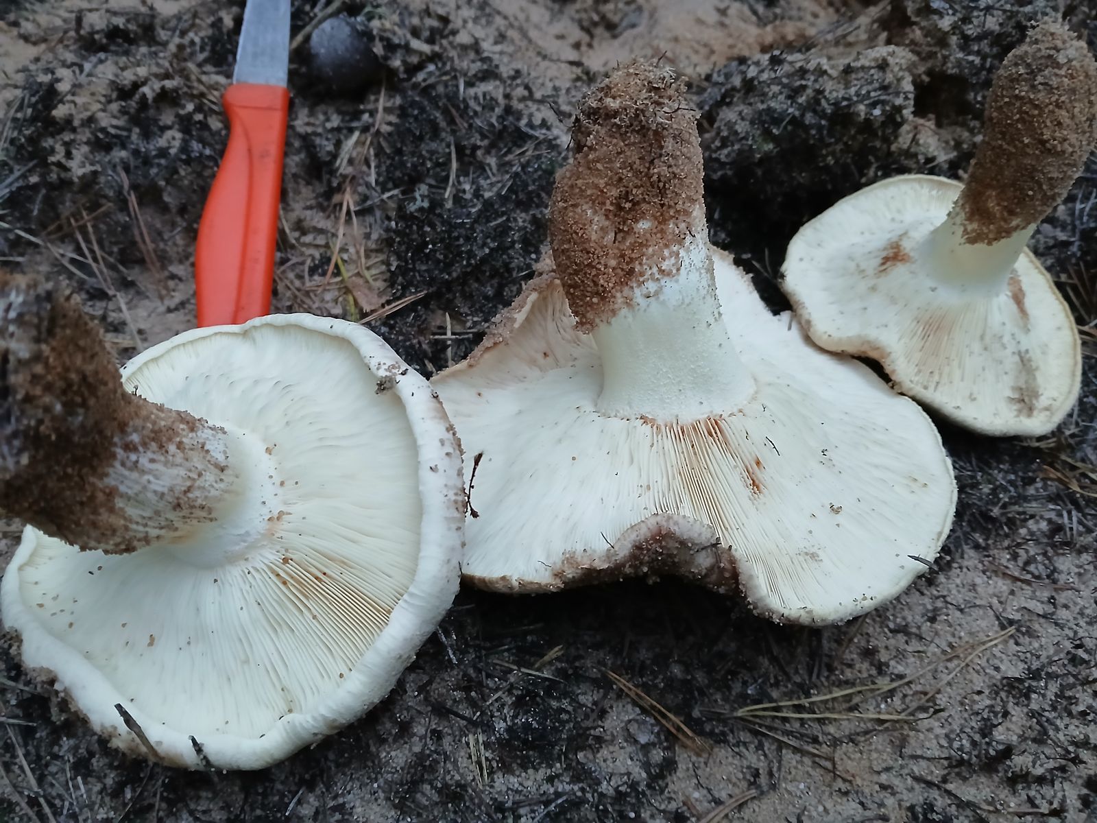 Die Exemplare sind für eine Tricholoma recht groß und kompakt und wurzeln alle sehr tief im Sandboden. Auffällig ist neben dem hellen Hut der stark eingerollte Hutrand.