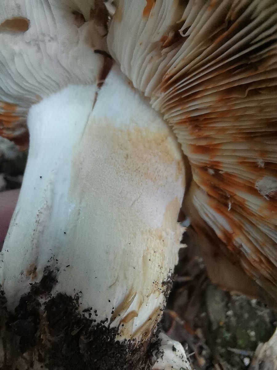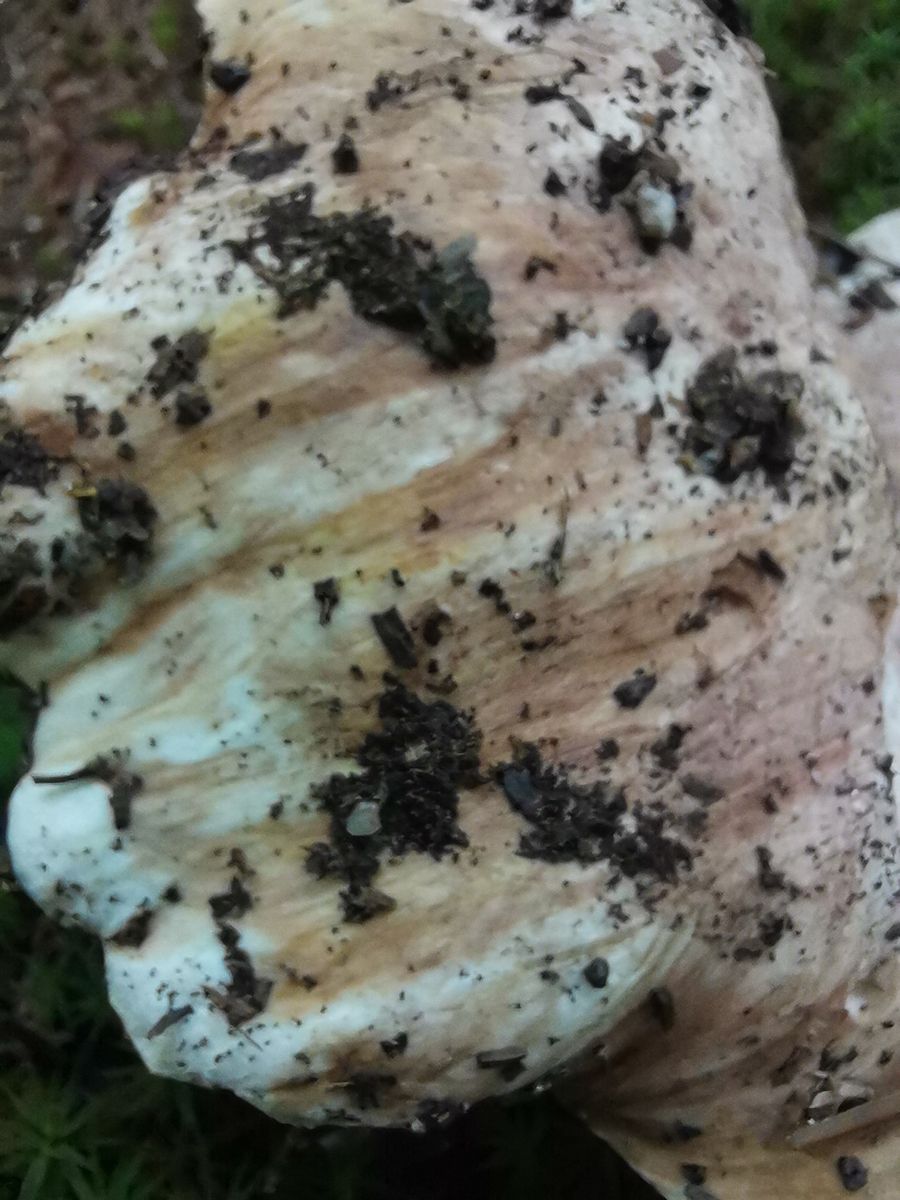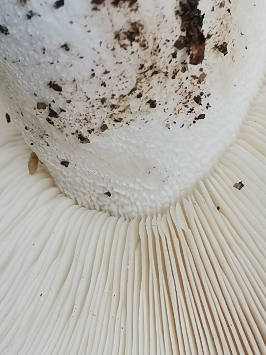 Nach mechanischer Beanspruchung verfärben sich Hut und Lamellen orangebräunlich - siehe Fotos.