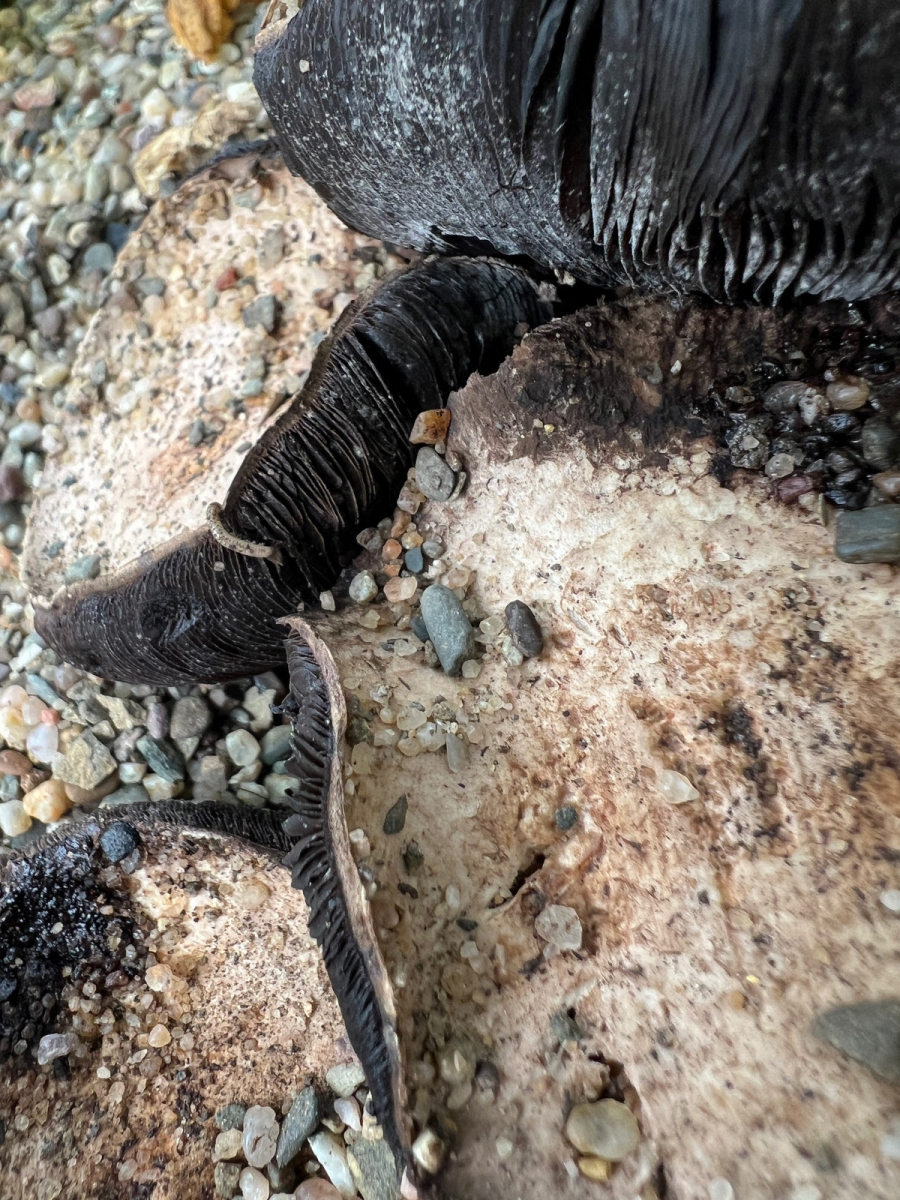 - Hut: Durchmesser ca 6cm, dünne, papierartige, leicht reißende helle/grau-beige Haut, Außenkante schalenartig nach oben wölbend (es liegen noch einige Sandkörner darauf, die sich nicht abpusten ließen)