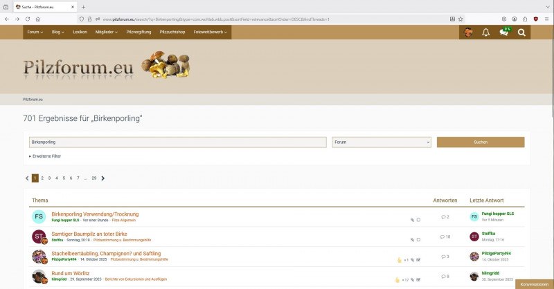Auf der Hauptseite findet man 701 Beiträge wenn man nach Birkenporling sucht
