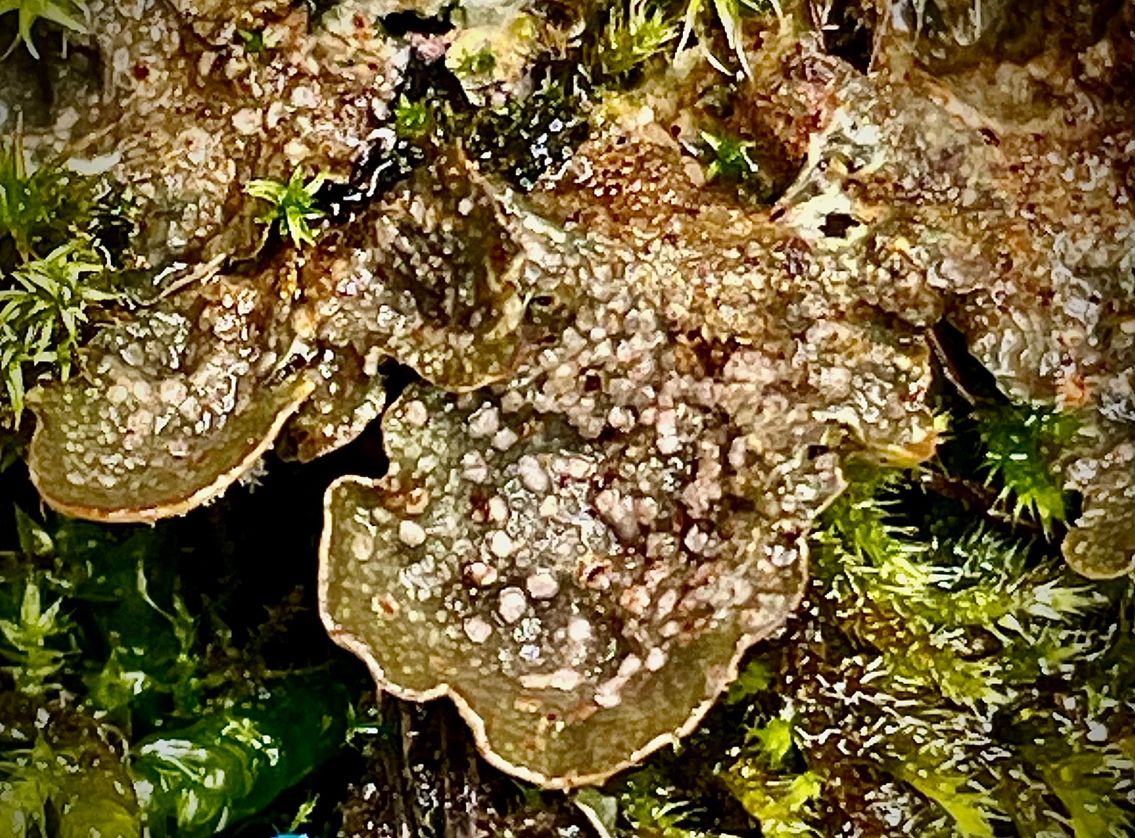 aufbrechen und erhabene Krater hinterlassen. Diese Gebilde sind fest mit der Oberfläche der Peltigera verwachsen