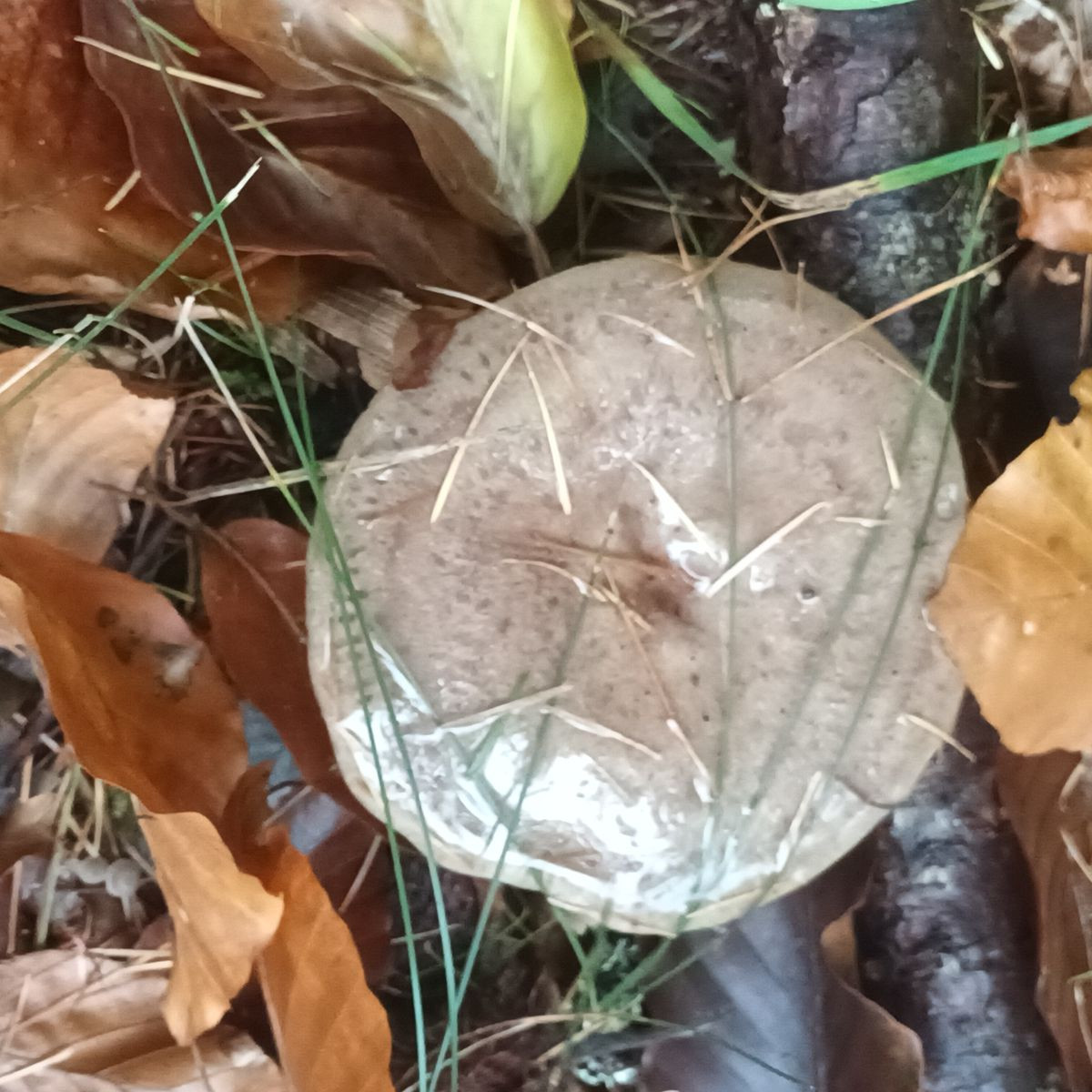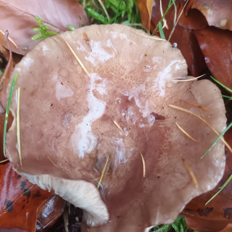 es ist ein Milchling, soweit bin ich gekommen. Gefunden am Straßenrand mit Laubwaldanteil. Buchen, Lärchen. Es hat dieser Tage geregnet; deshalb war die Huthaut schmierig und auch glänzend. Oder es ist von Haus aus so. Die Farbe ist graubraun. Keine Zonen auf dem Hut.