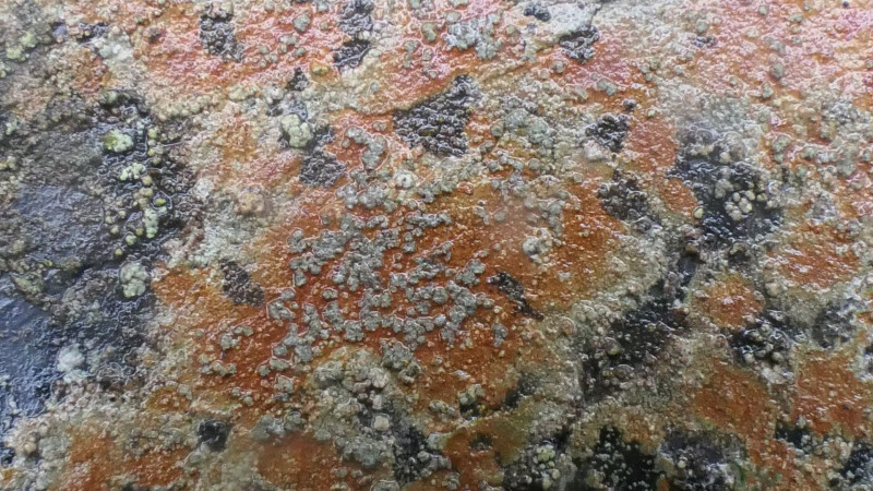 Bild 24 Das könnte Lecidea silacea sein, sie zeichnet sich u.a. durch die gewölbten, orangen Areolen aus.