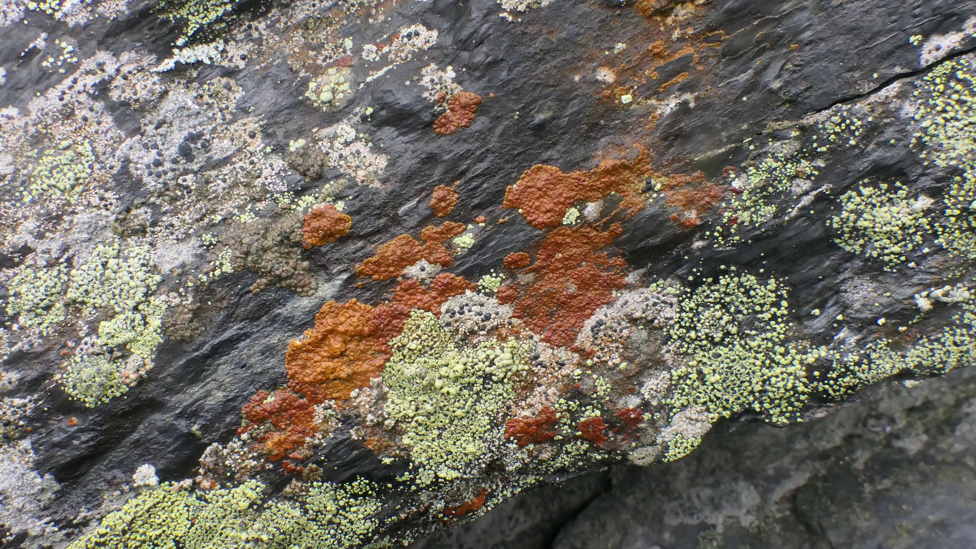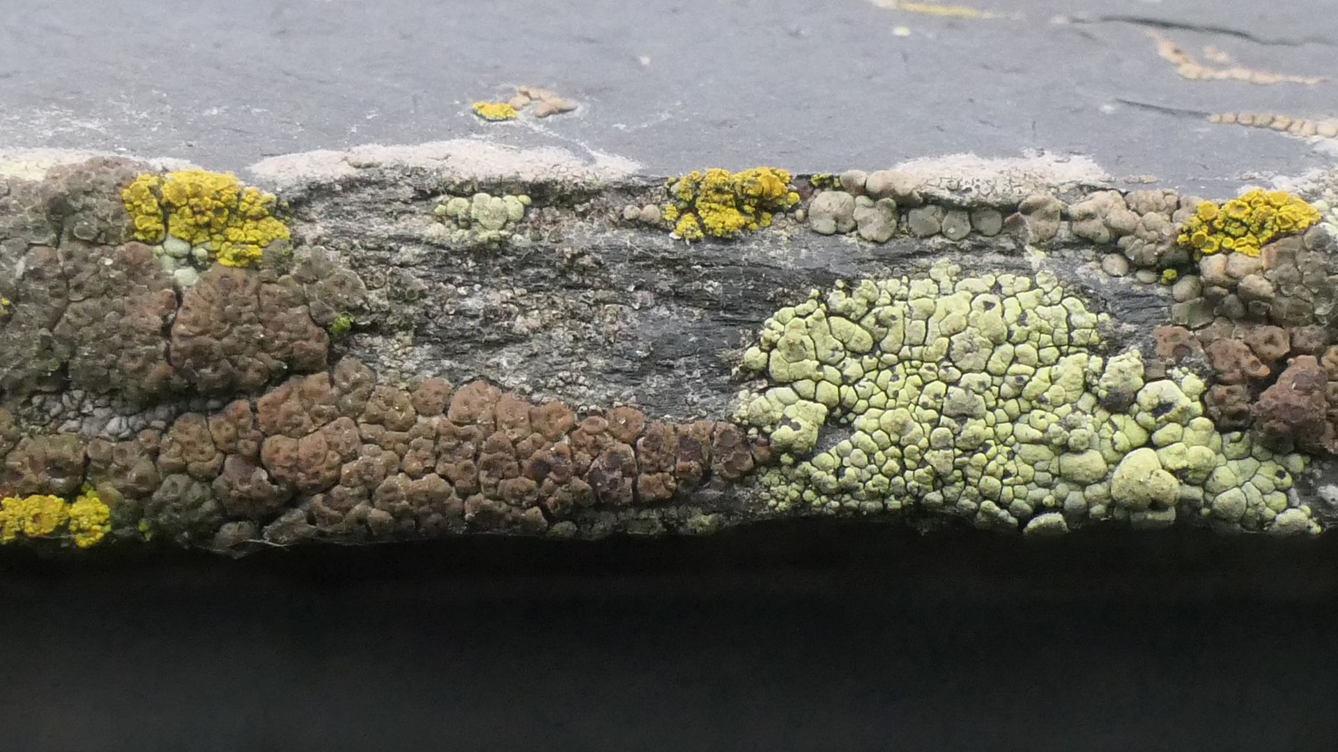Besonders bei Nässe bringt der Schiefer sie Flechten so richtig zum Leuchten!