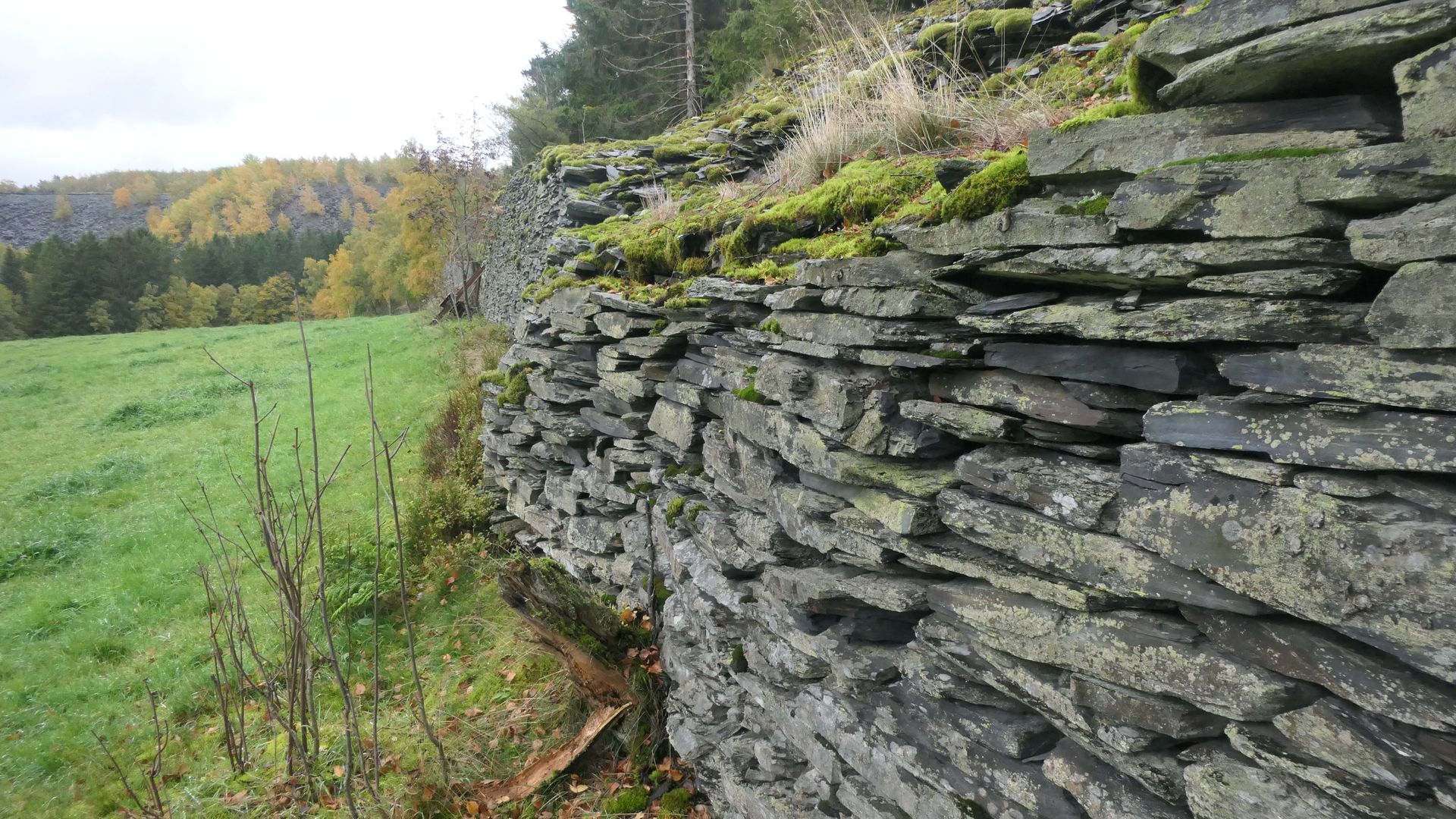 Bild 36 Beispiel für Flechtenbewuchs auf Schiefermauer am Viehstall beim Modelldorf.