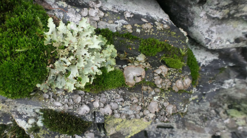 Bild 23 Tags darauf, eine andere Mauer: Rentierflechten obenauf und wieder viele bunte Krusten an der Vertikale: