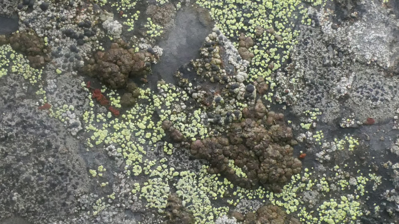 D'rum herum gelbe, sorediöse Lecidella scabra und vieles andere.