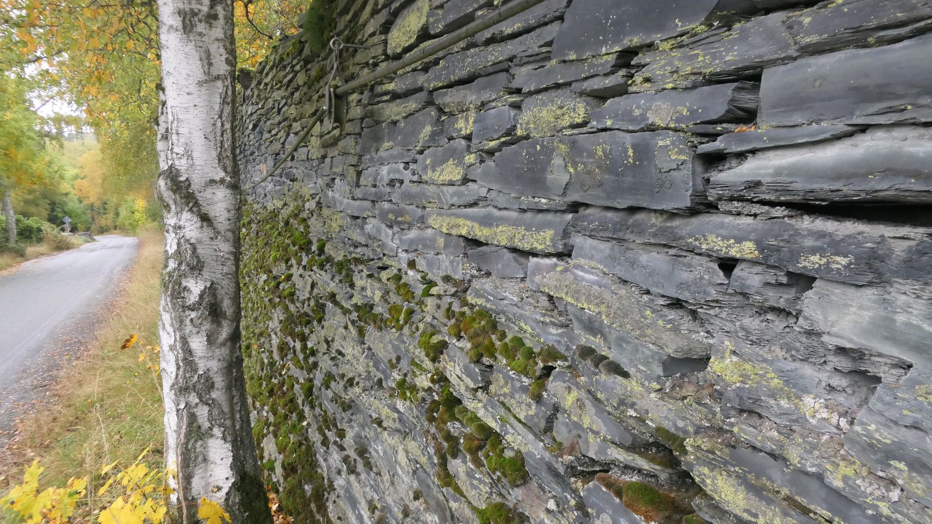 Bild 2: Ergiebig von Flechten und Moosen besiedelt sind die Schiefermauern direkt am Wegrand.