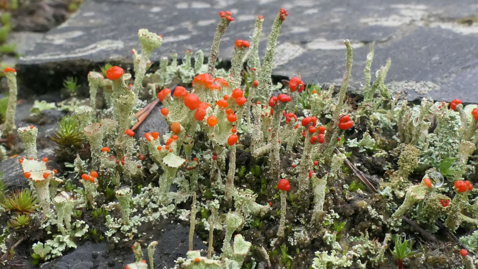 Bild 9 Gleich daneben auf dem Schieferschutt quadratmeter-große Cladonienrasen, vermutlich aus der Coccifera-Gruppe.
