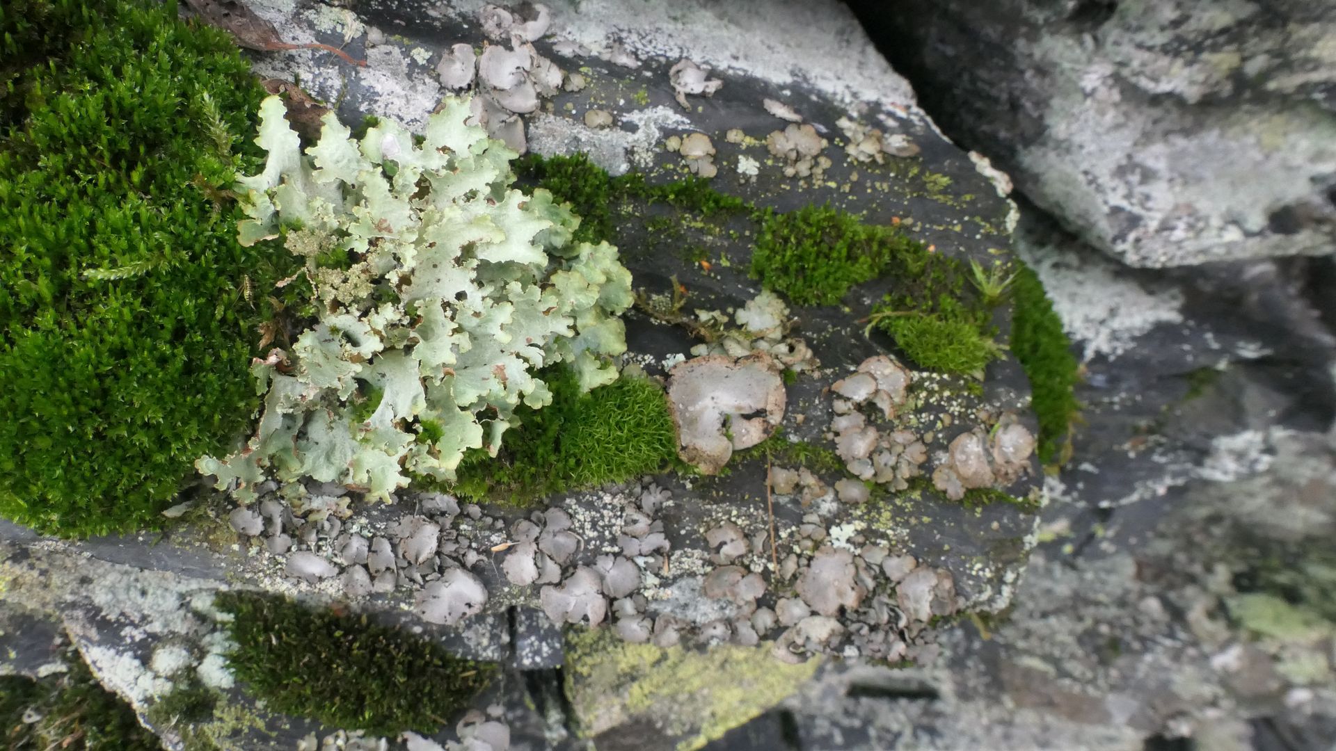 Bild 33 Blattflechten auf Schiefer. Links eine hellgrüne Platismatia glauca, daneben viele graue Nabelflechten der Art U. hirsuta.