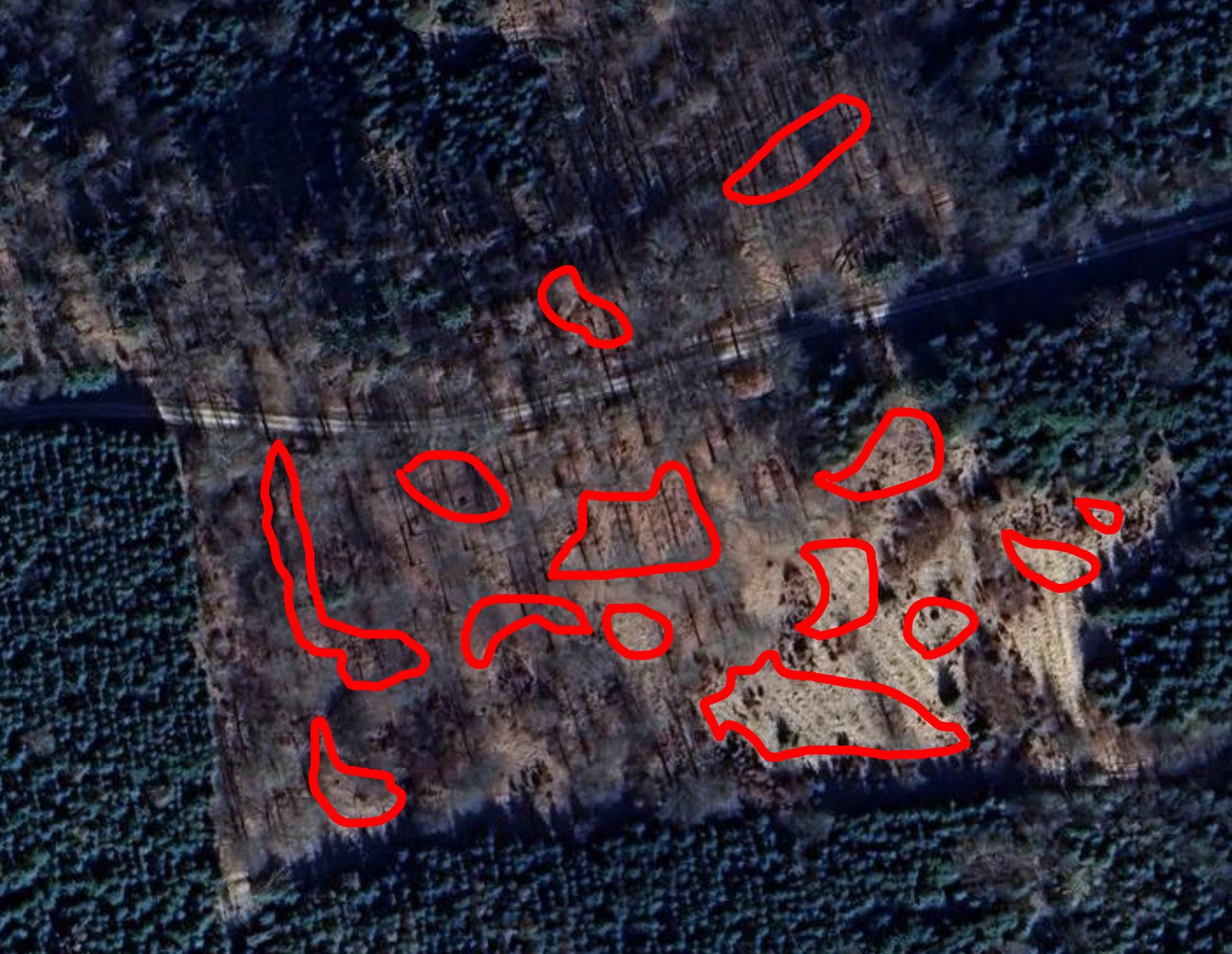 Was die manuelle Verbreitung von Pilzen angeht kann ich am Beispiel von den Herbsttrompeten mal folgendes in den Raum werfen. Meine Lieblingsstelle, weil nicht weit weg, sah vor 4 Jahren, als ich sie entdeckt habe so aus (rote Markierung ist Vorkommen der Art):