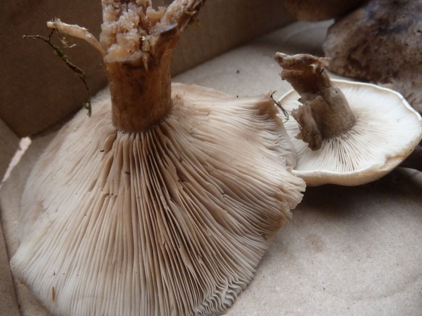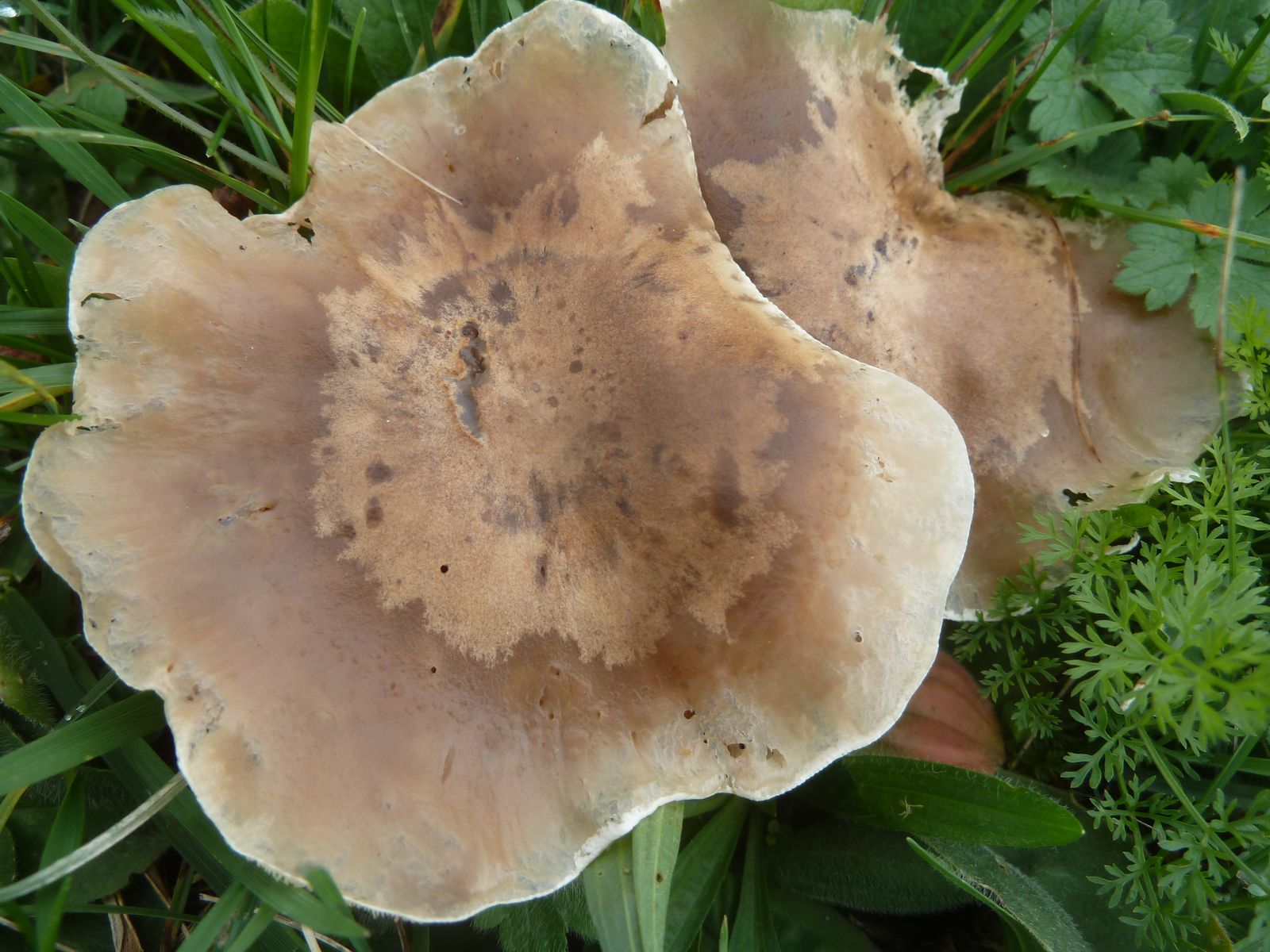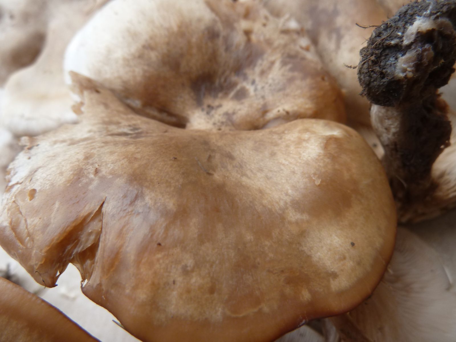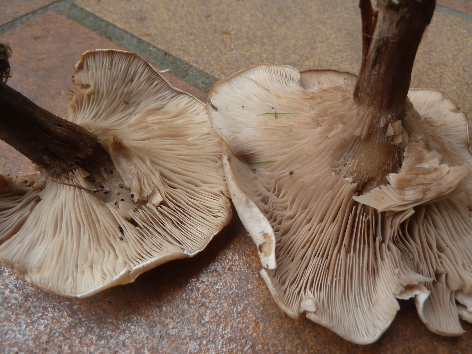 Die zweite an den Rändern und auf Druck leicht orangebräunlich verfärbende Kollektion fällt vor allem durch die lappig-unregelmäßige Hutform , dünneren Stiel und Habitus auf. Ist das überhaupt Lepista?