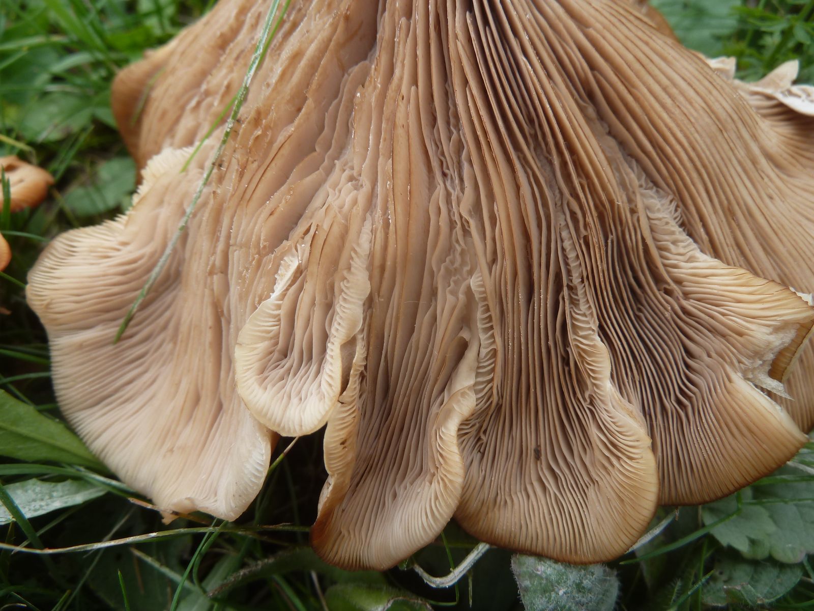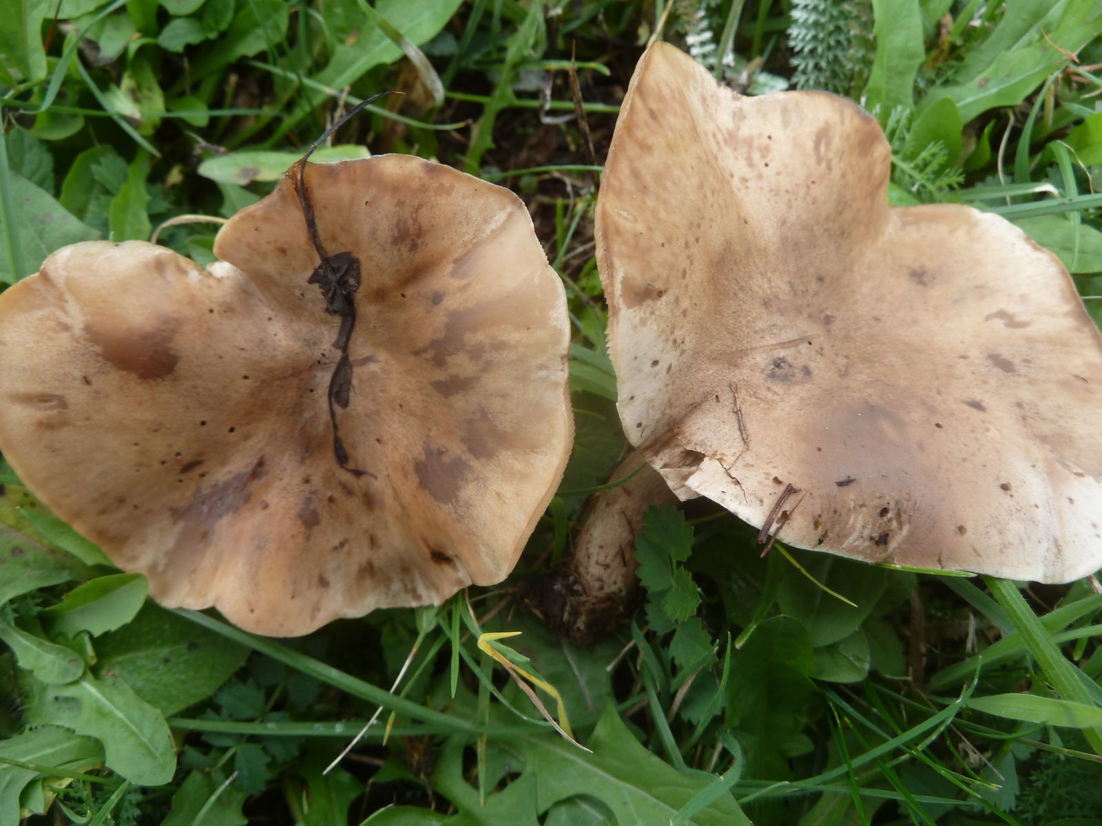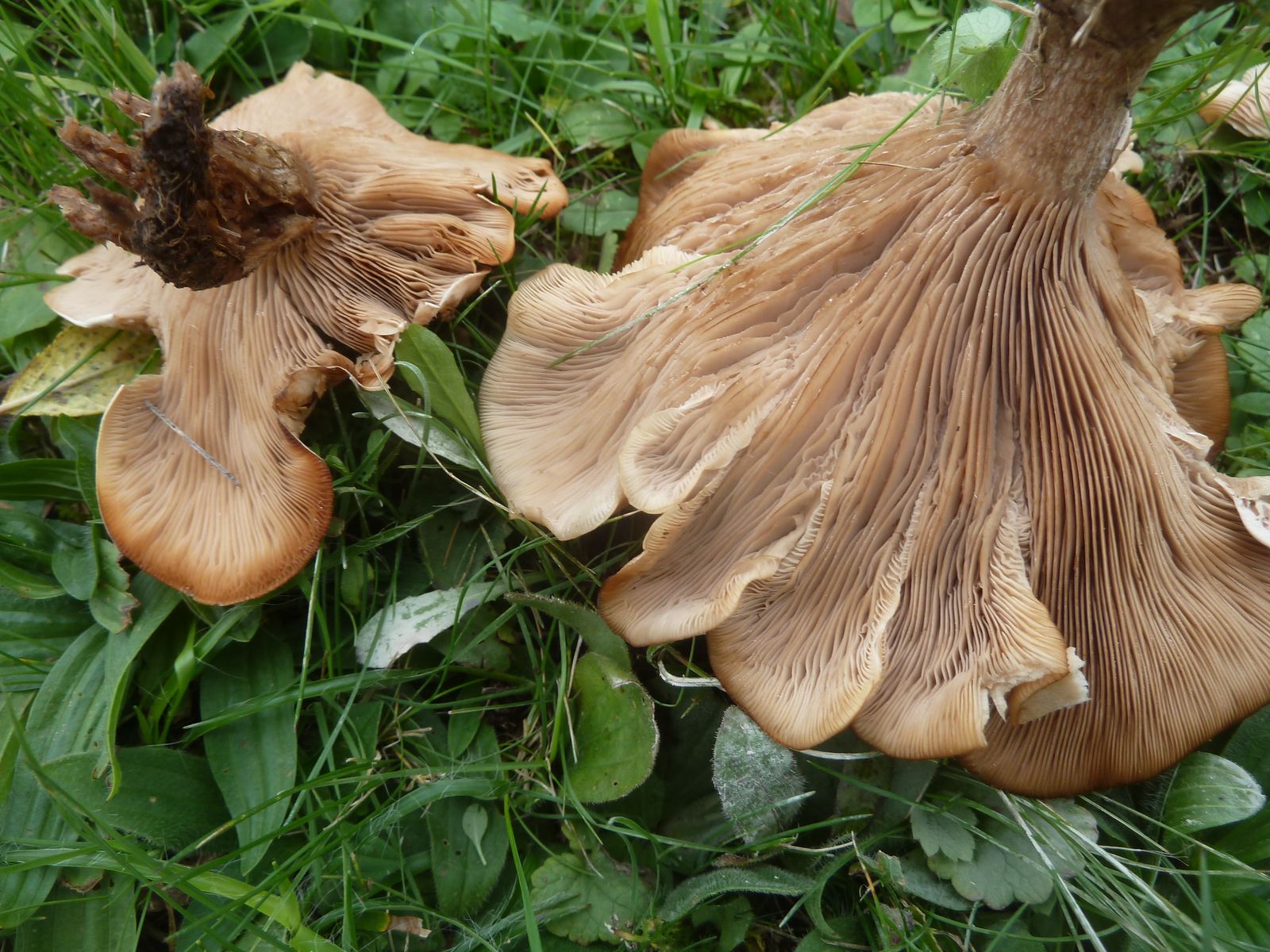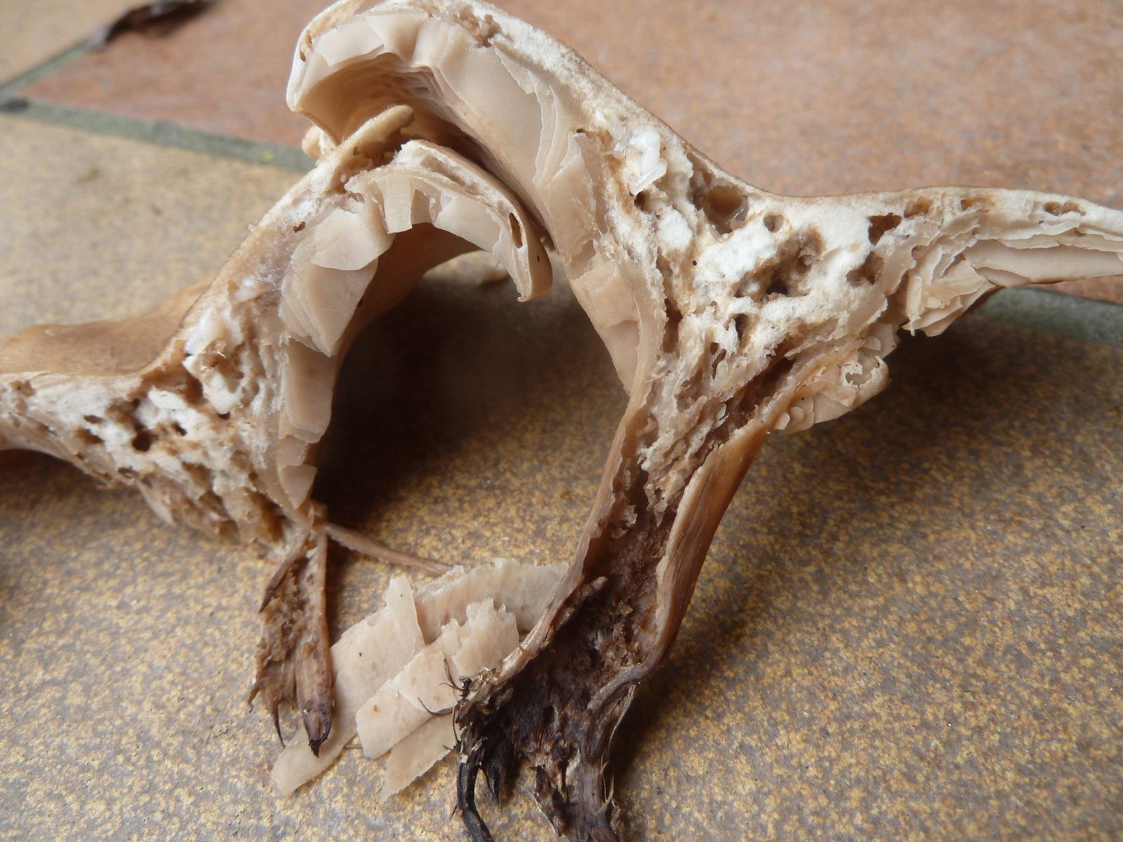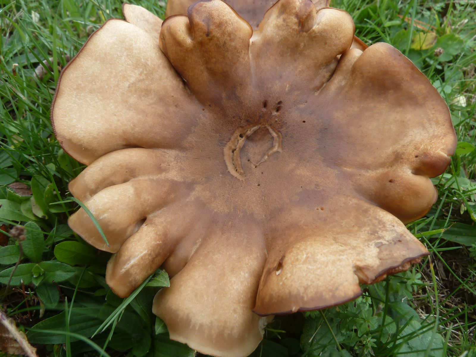 Die zweite an den Rändern und auf Druck leicht orangebräunlich verfärbende Kollektion fällt vor allem durch die lappig-unregelmäßige Hutform , dünneren Stiel und Habitus auf. Ist das überhaupt Lepista?