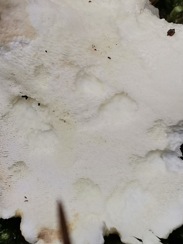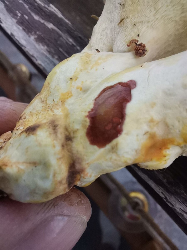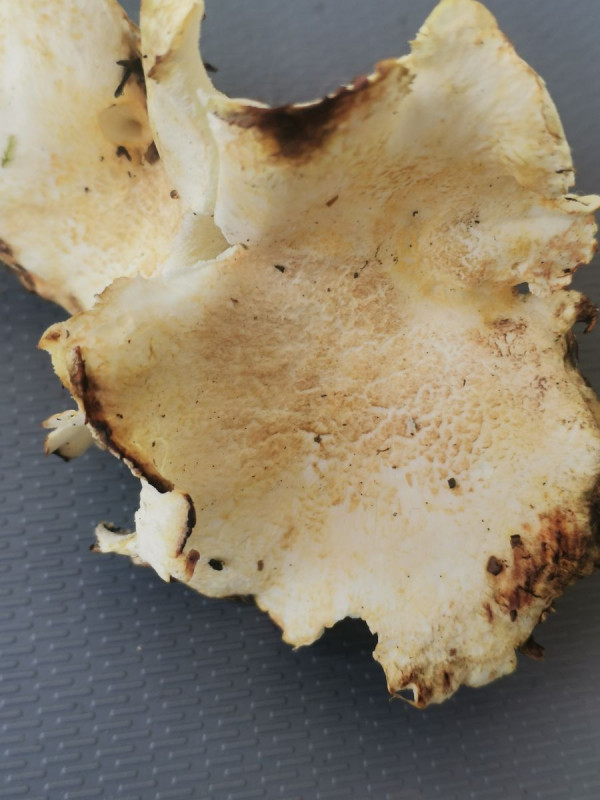 Ich habe Albatrellus citrinus im Verdacht. Schwärzt da etwas? Das würde auf ihn hindeuten. Die KOH-Probe müsstest du meiner Meinung nach auf dem Fleisch machen. Schau mal hier, ich hab letztes Jahr alles beschrieben da.