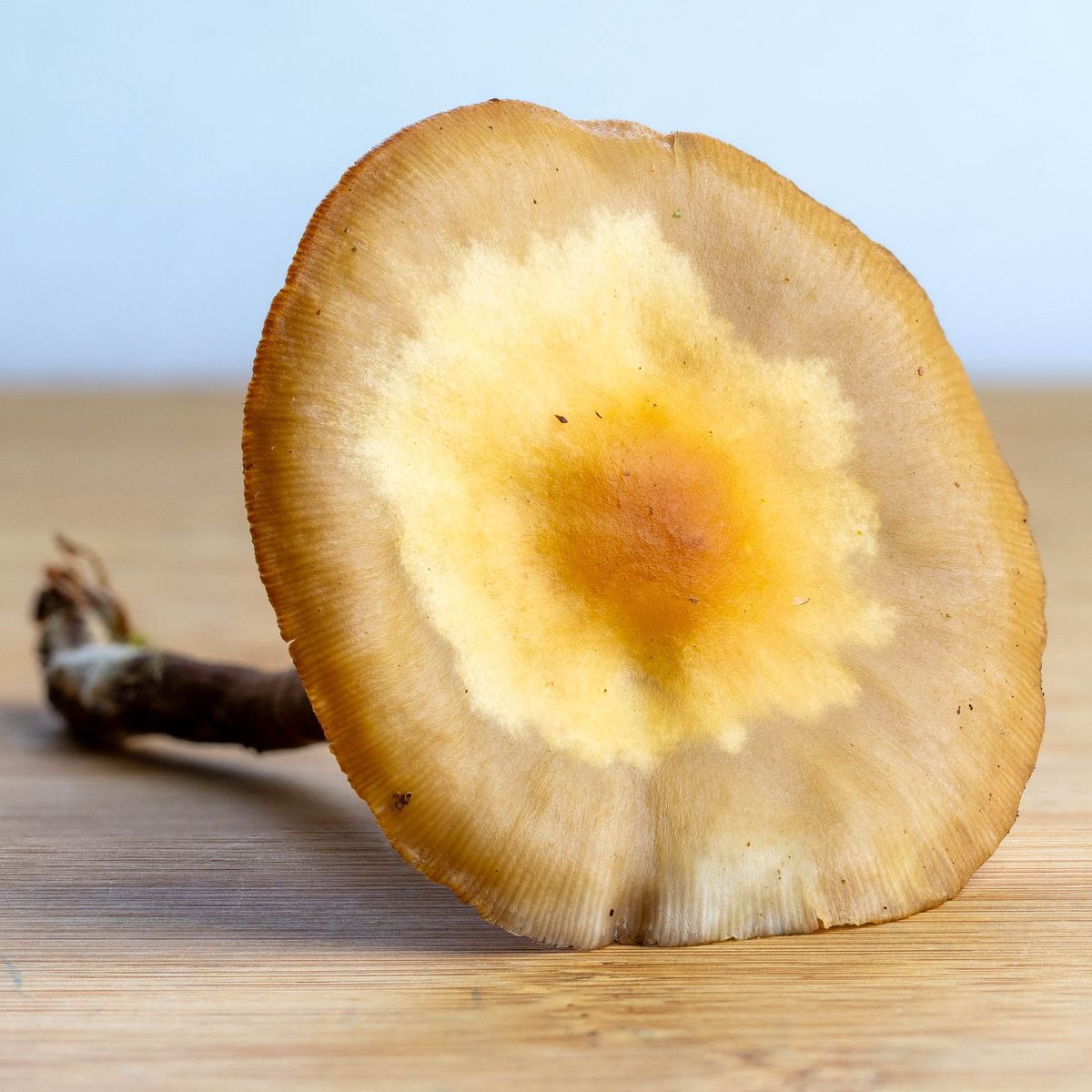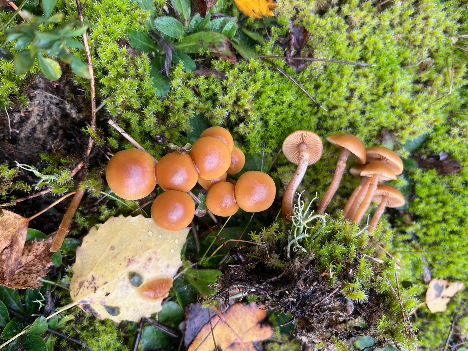 - Kappen hygrophan Ø ca. 6-7 cm, außen gerieft, Zentrum orange