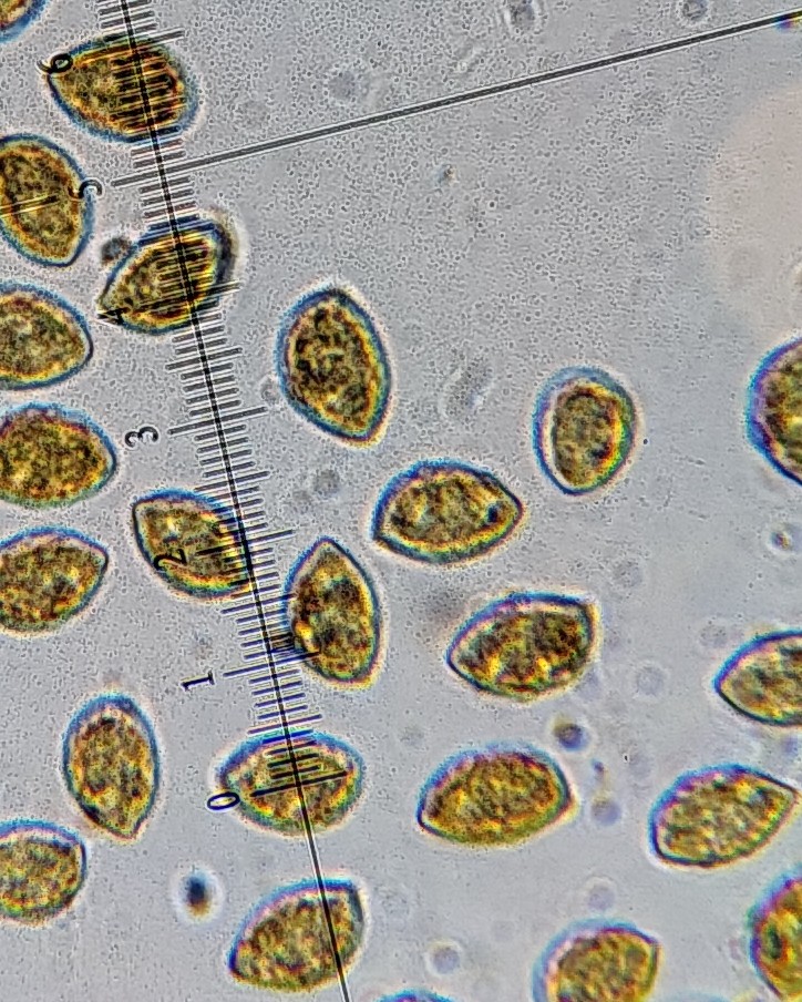 Das sind die Sporen des ziemlich frischen Fruchtkörpers von Kollektion 1 beim zweiten Pilz. Für mich exakt gleich wie die anderen, mandelförmig, bis 13 um.
