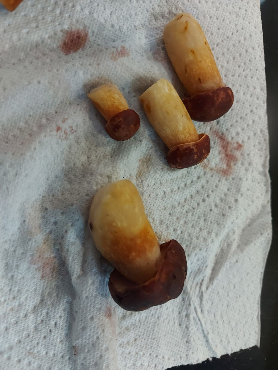 Ich habe heute im Kiefernwald vermeintlich Steinpilze gefunden. Neben Maronenröhrlingen(siehe Bild) blauen diese nicht und riechen typisch nach Steinpilz. Zusätzlich tritt leicht roter Saft aus( siehe Bild auf dem Küchentuch). Was mich irritiert die dunkle Hutfarbe aufgrund der geringen Größe (nur 1-3cm Hutdurchmesser). Das nicht weiße sondern beigefarbene Fleisch. Alle bisherigen Steinpilze die ich gefunden habe waren deutlich heller bei so einer kleinen Größe und das Fleisch war schneeweiß. Zusätzlich fehlt für mich die erkennbare weiße Netzzeichnung am Stil.