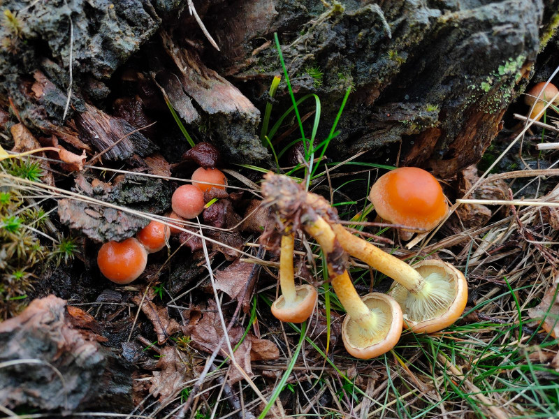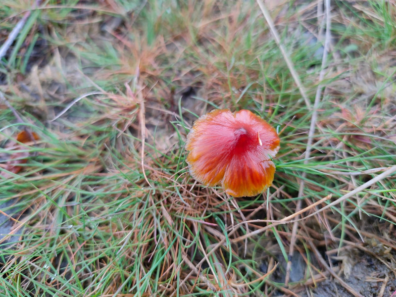 2. Hygrocybe: Dirket im Randbereich auf der Sauerwiese wurde diese rote Saftlinggruppe zu gefunden. Der Hut ist bis zur hälfte gerieft und es ist sowohl bei den den