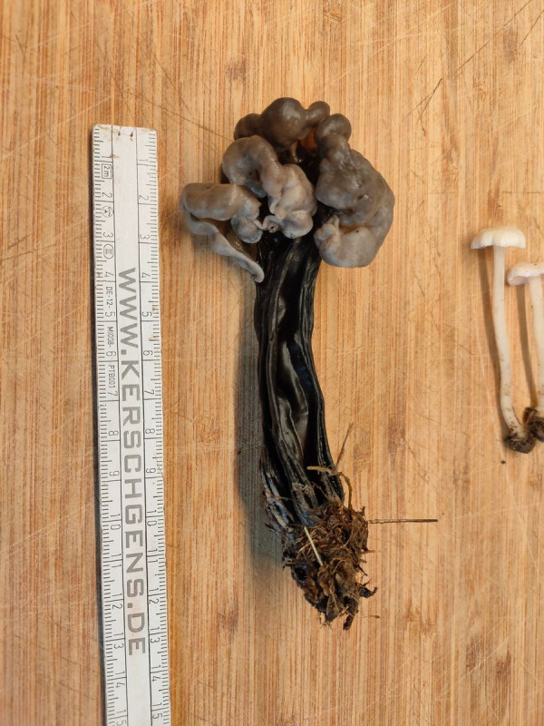 1.Helvella sp: Eine recht große Lorchel mit tief schwarz gefurcht und gekammertem Stiel. Der Hut ist grau gelappt und hat keinen Sattel. Dieser war am Wegesrand
