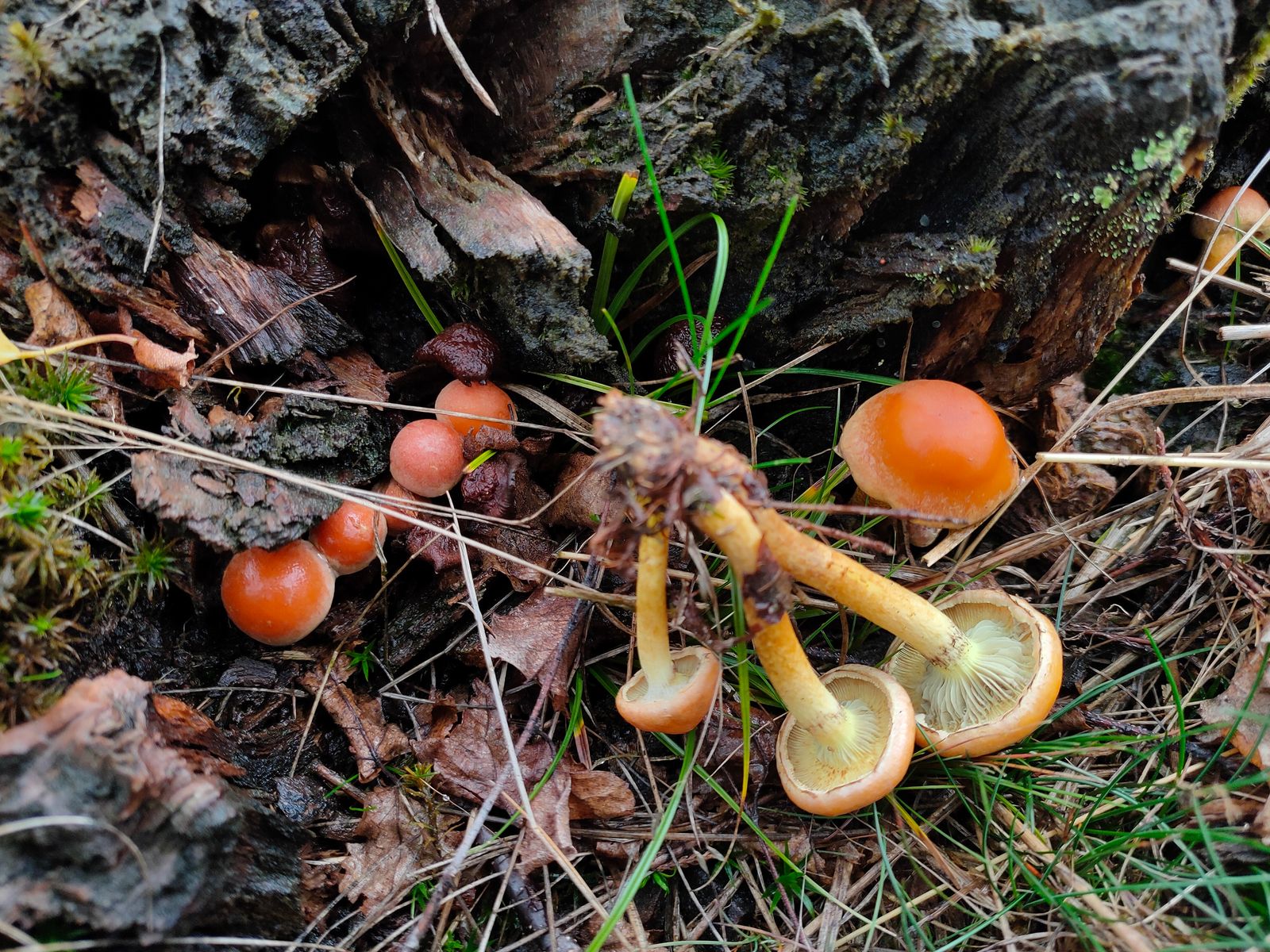 2. Hygrocybe: Direkt im Randbereich auf der Sauerwiese wurde diese rote Saftlinggruppe zu gefunden. Der Hut ist bis zur hälfte gerieft und es ist sowohl bei den den alten FK, als auch bei dem jungen FK eine Papille zu sehen. Der Hut war feucht aber nicht klebrig. Der Stiel feucht aber nicht schleimig. Es spricht vieles für Hygrocybe subpapillata. Bevorzugt diese Art einen sauren Standort?