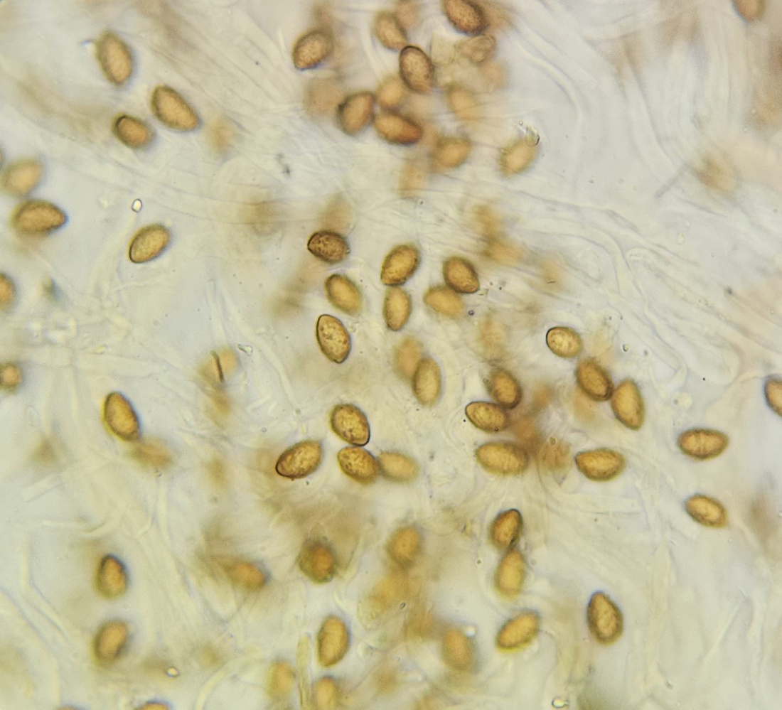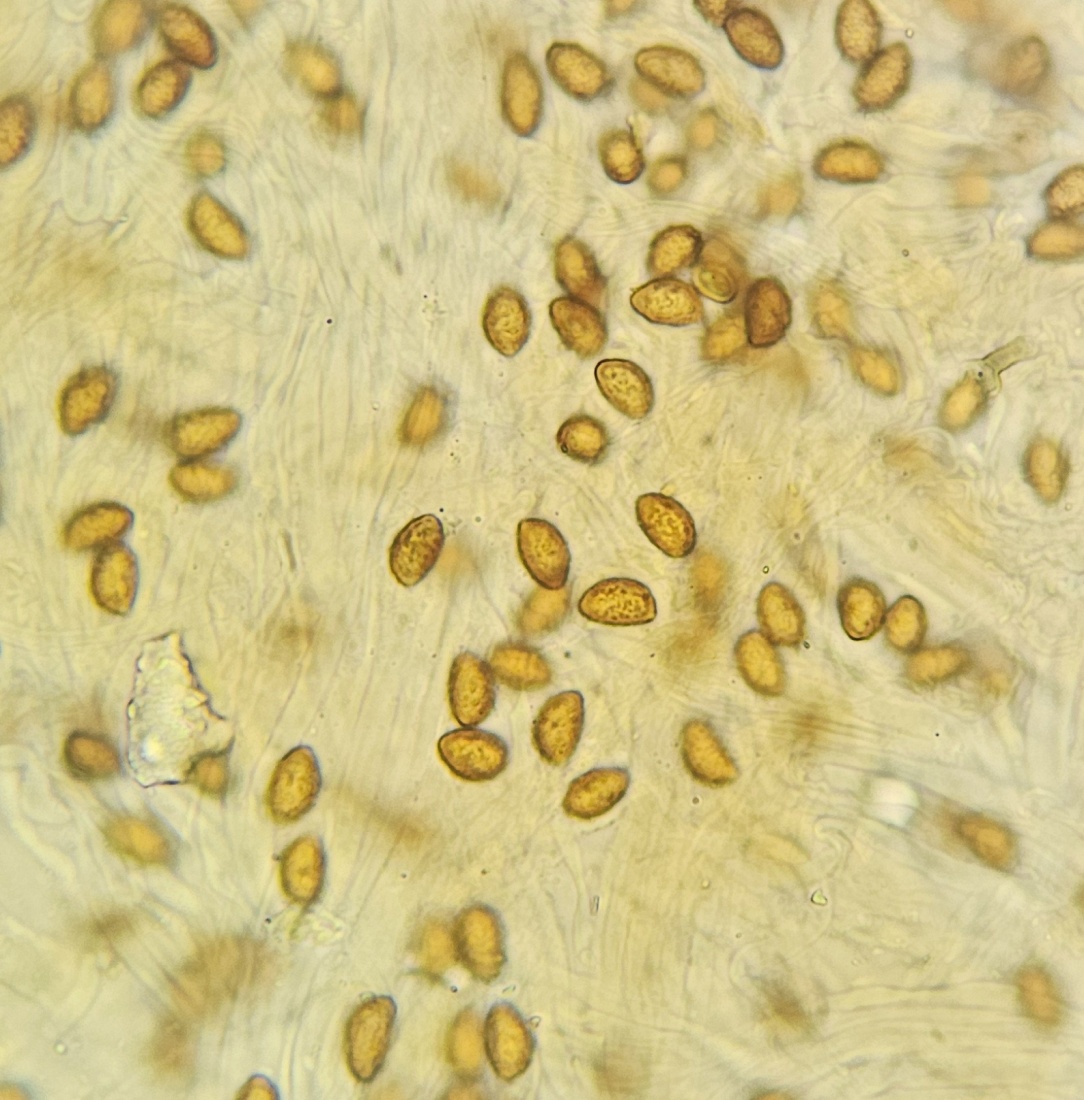 Der einzelne Fruchtkörper ist sehr schmächtig. Hut ca 4cm, blass ocker, mit dunkleren Striemen. Huthaut wenn dann nur minimal radialfaserig eingewachsen. Die Lamellen sind gräulichbraun lila gefärbt, ich vermute dass sie bei jungend Fruchtkörpern sehr viel kräftiger lila sind. Besonders auffällig der Stiel: im oberen Bereich freudig lila gefärbt, zu Basis hin dann weiß verblassend. Die zierliche Knolle gerandet. Fleisch im gesamten Fruchtkörper wässrig weiß, in der Stielrinde aber lila. Geruch +- nichtssagend, Geschmack unauffällig. KOH an/in allen Teilen völlig negativ. Sporen 10,2 x 6,3 μm; Q=1,62; mandelförmig bis leicht zitronenförmig, grobwarzig, nur gering gratig verbunden.