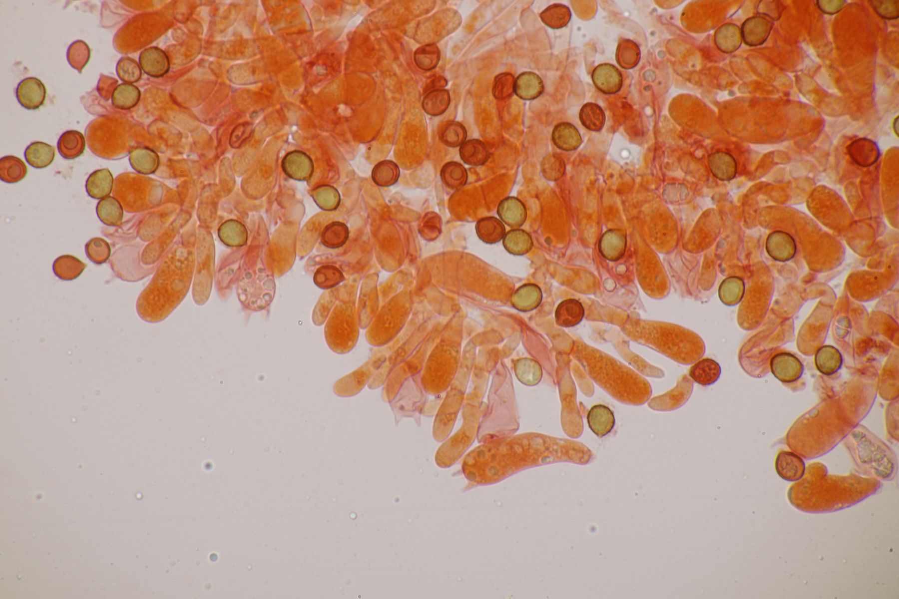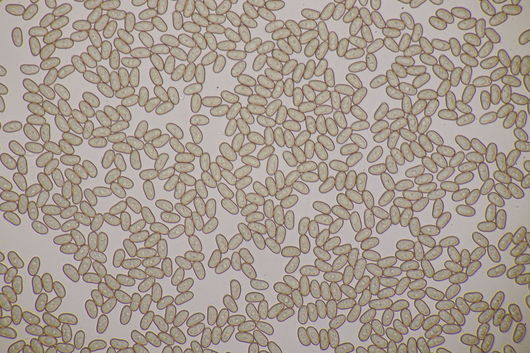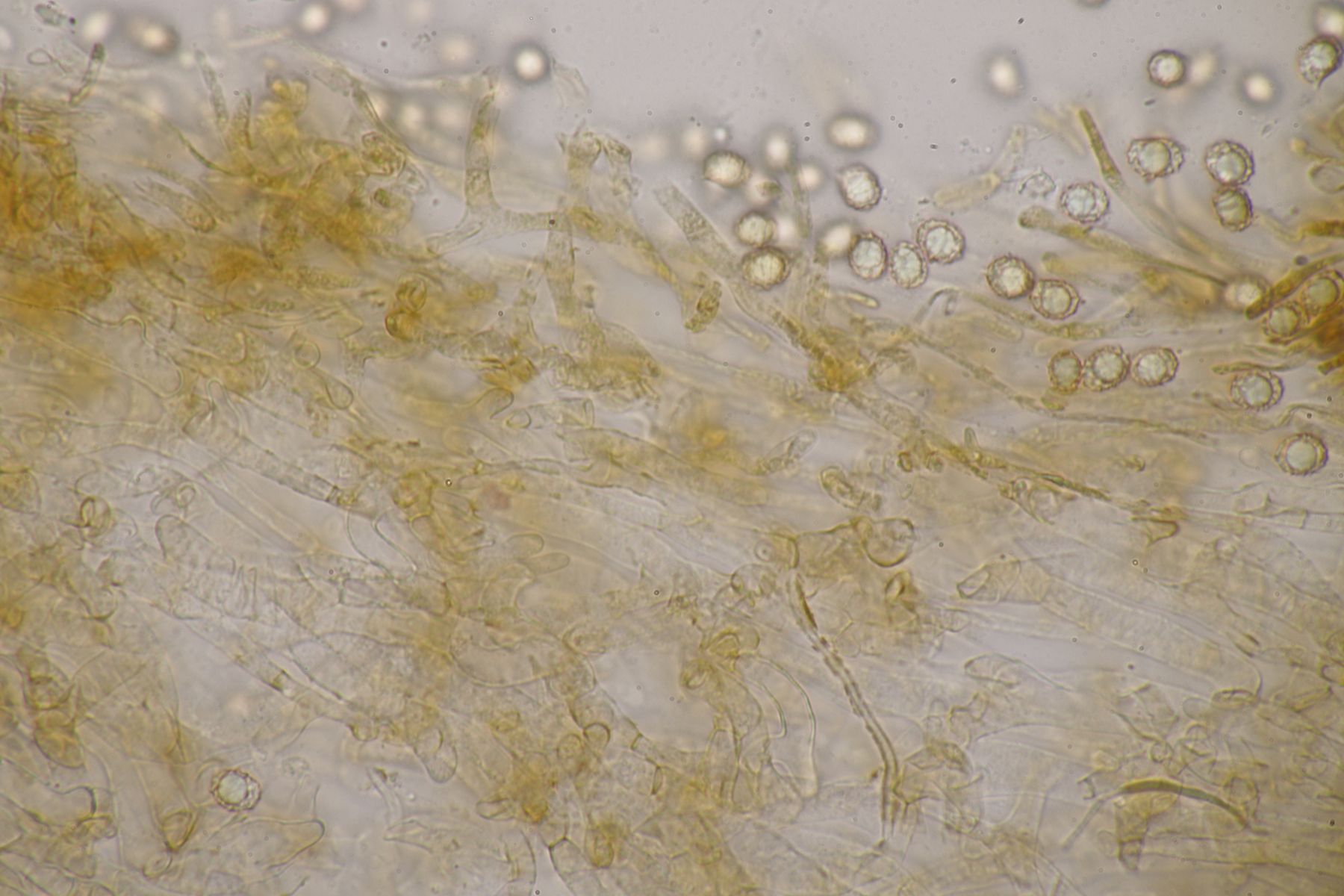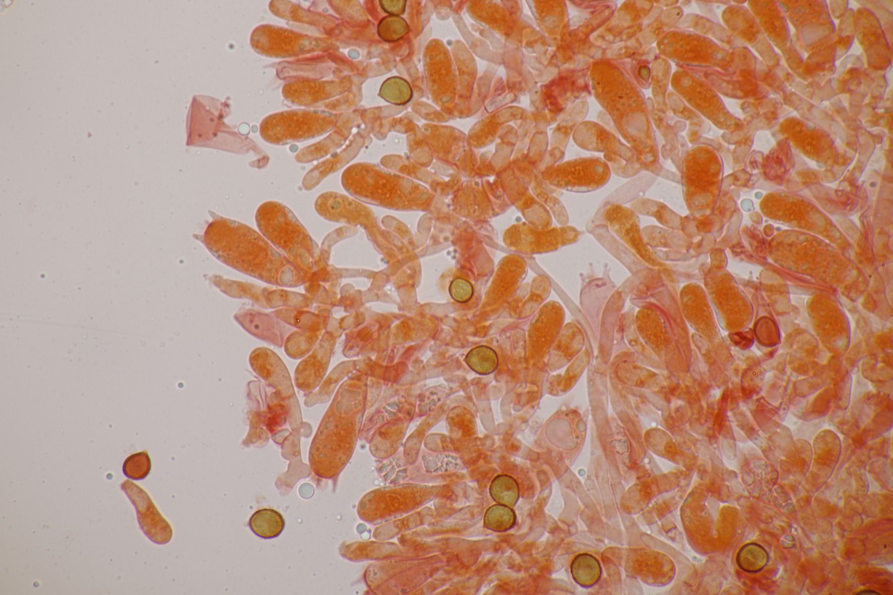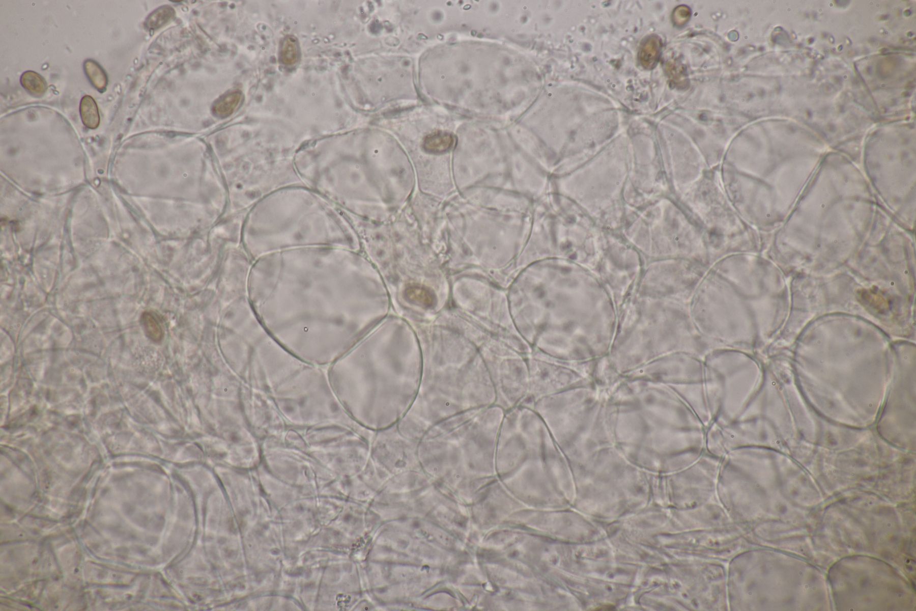 8. Eine Cyanula, die auf der Fläche eines ehemaligen Fischteichs wächst. Die Fläche ist jetzt nur noch im Frühling überflutet und den Rest des Jahres trockengefallen. Der Boden ist hier nicht super mager, da sich auf dem Sandboden im Laufe der Zeit auch etwas Teichschlamm abgelagert hat. Sporen messen 10,4±0,8 µm × 7,9±0,5 µm, Q=1,3±0,1; 9,1-11,6 µm × 6,8-8,8 µm, Q=1,1-1,4. Die Lamellenschneide ist fertil, eventuell sind dort einige sehr schmale Cheilozystiden - das könnten aber auch einfach Basidiolen sein.
