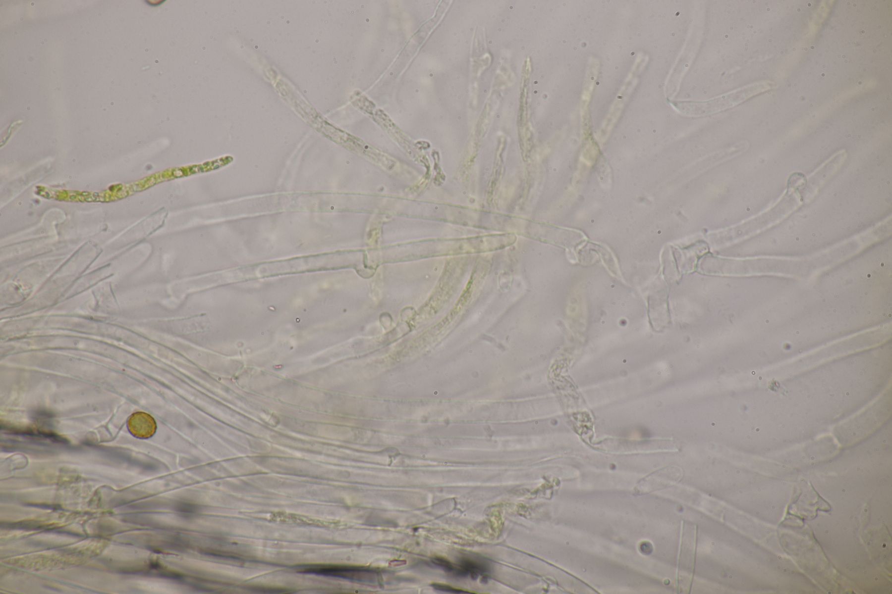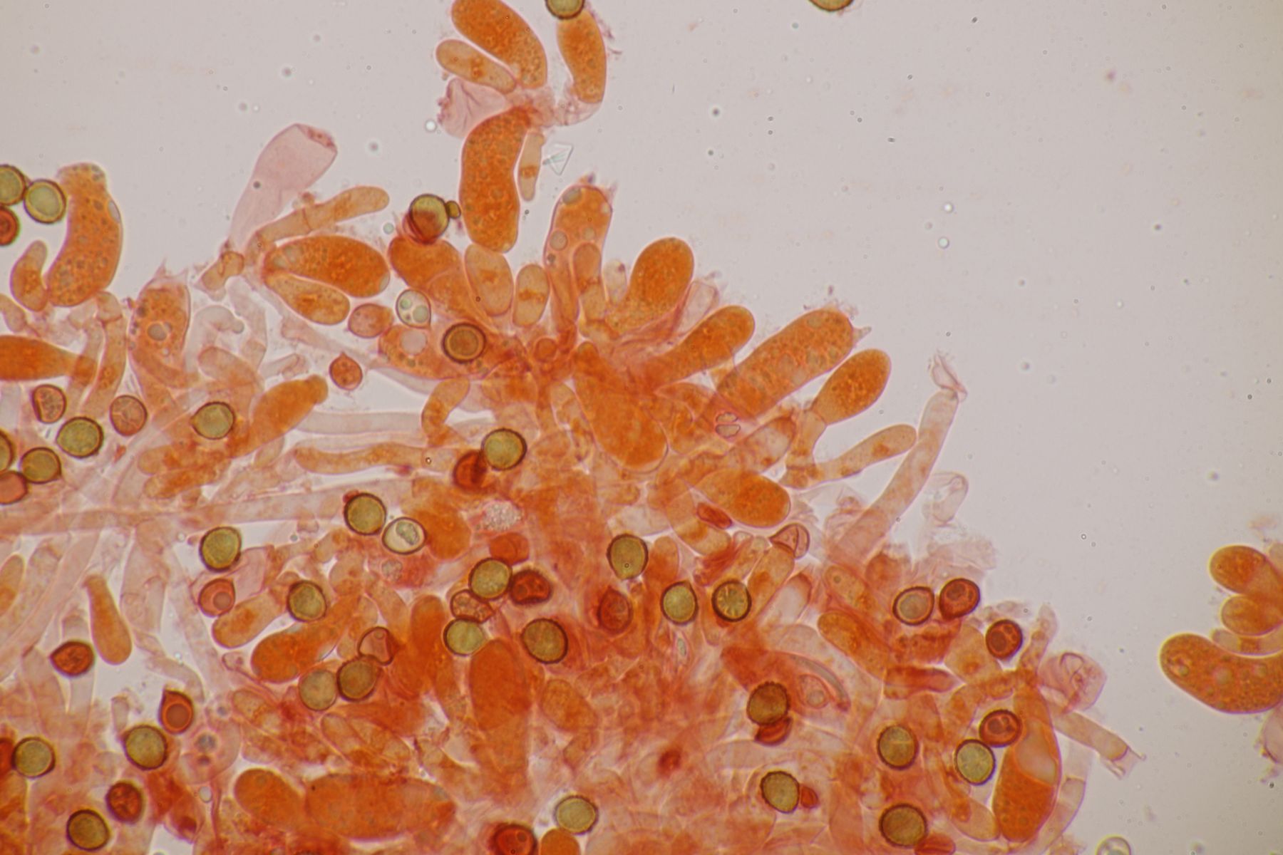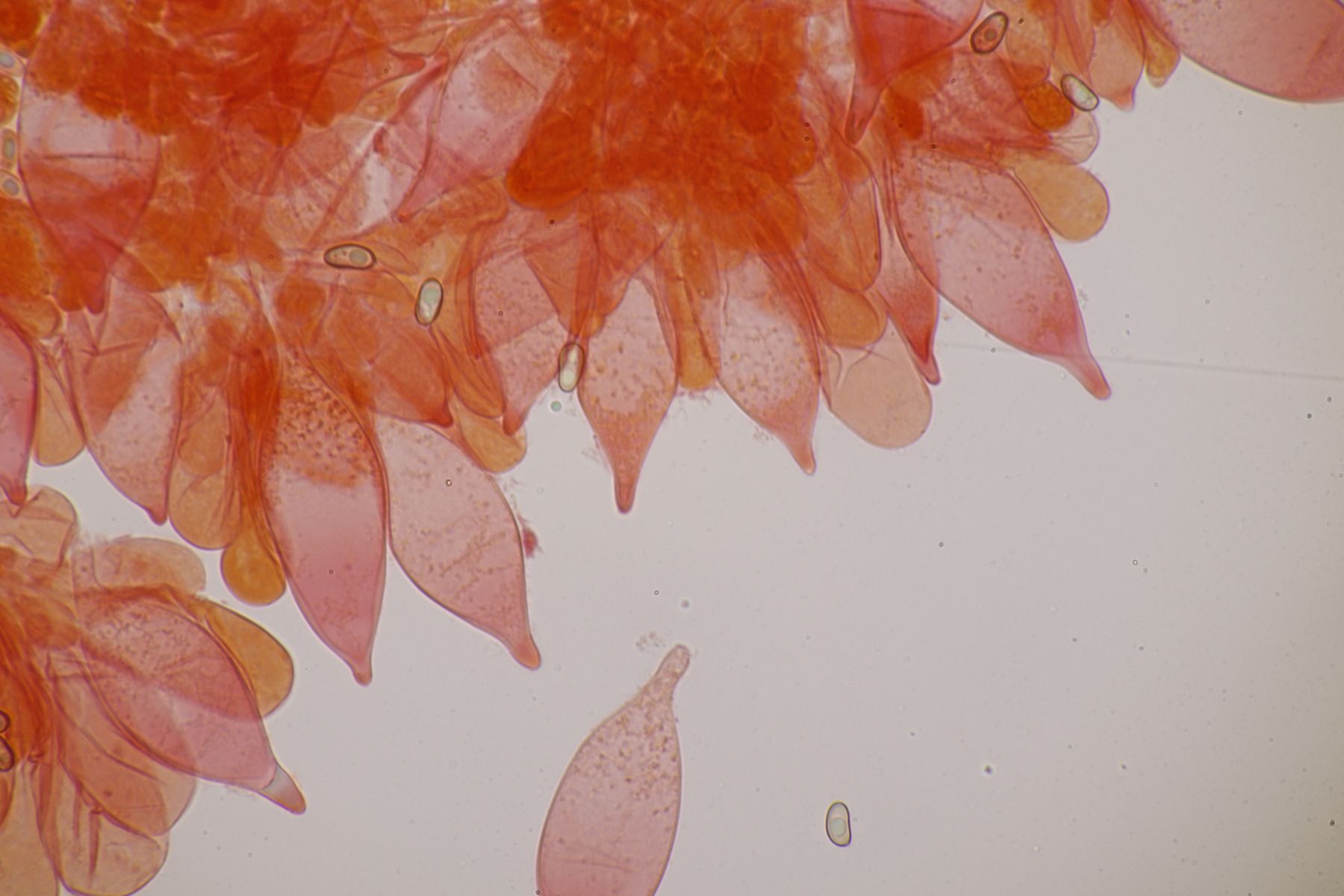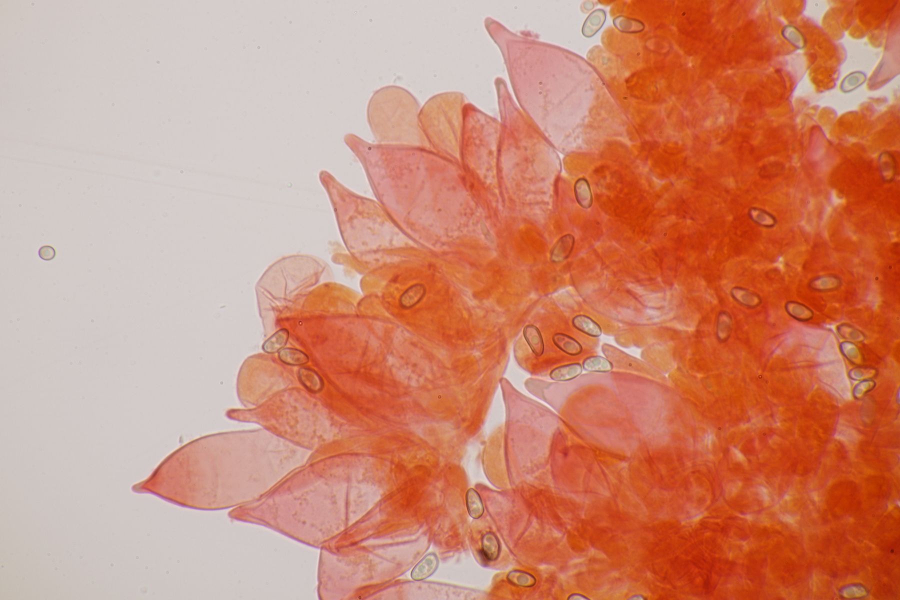 8. Eine Cyanula, die auf der Fläche eines ehemaligen Fischteichs wächst. Die Fläche ist jetzt nur noch im Frühling überflutet und den Rest des Jahres trockengefallen. Der Boden ist hier nicht super mager, da sich auf dem Sandboden im Laufe der Zeit auch etwas Teichschlamm abgelagert hat. Sporen messen 10,4±0,8 µm × 7,9±0,5 µm, Q=1,3±0,1; 9,1-11,6 µm × 6,8-8,8 µm, Q=1,1-1,4. Die Lamellenschneide ist fertil, eventuell sind dort einige sehr schmale Cheilozystiden - das könnten aber auch einfach Basidiolen sein.