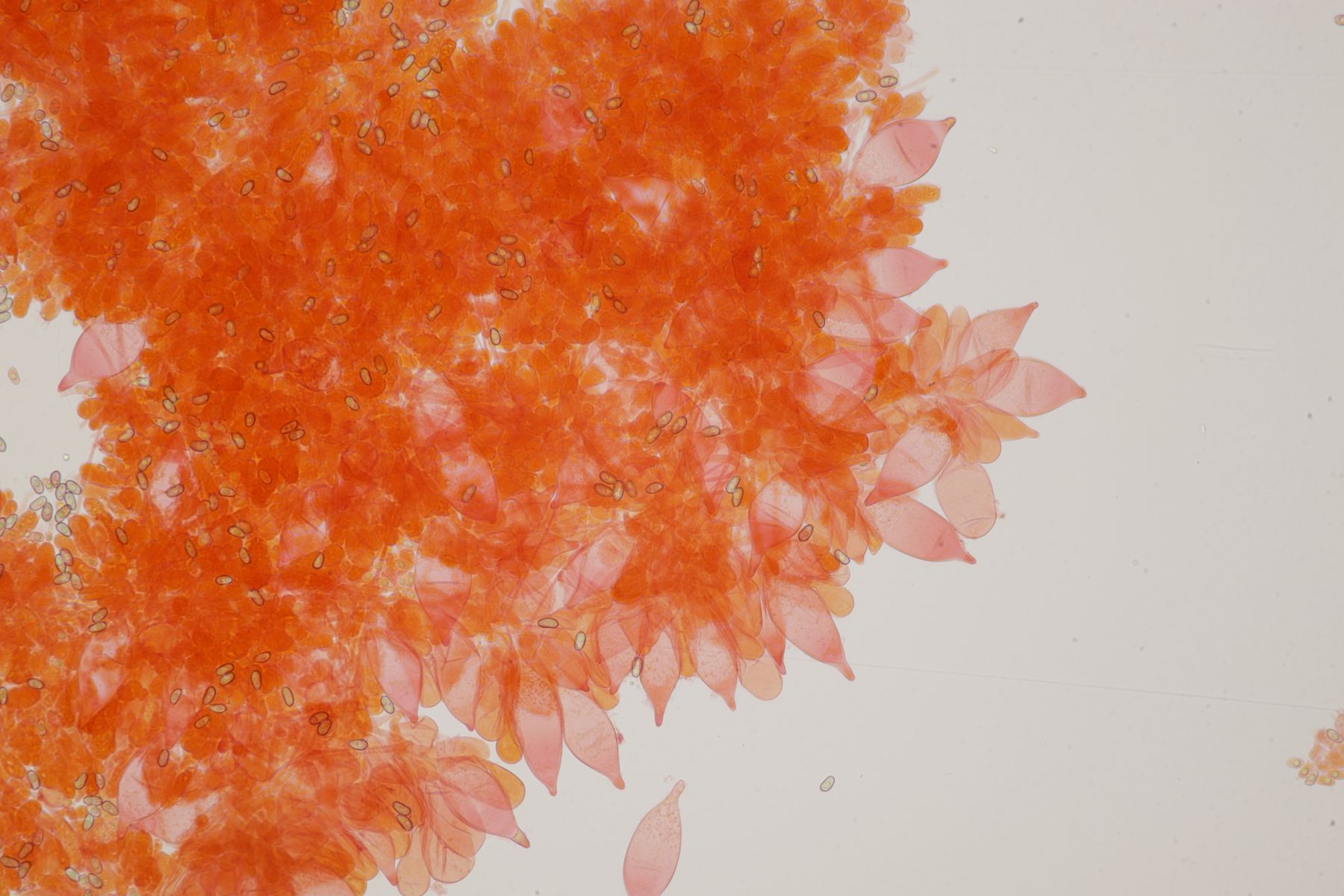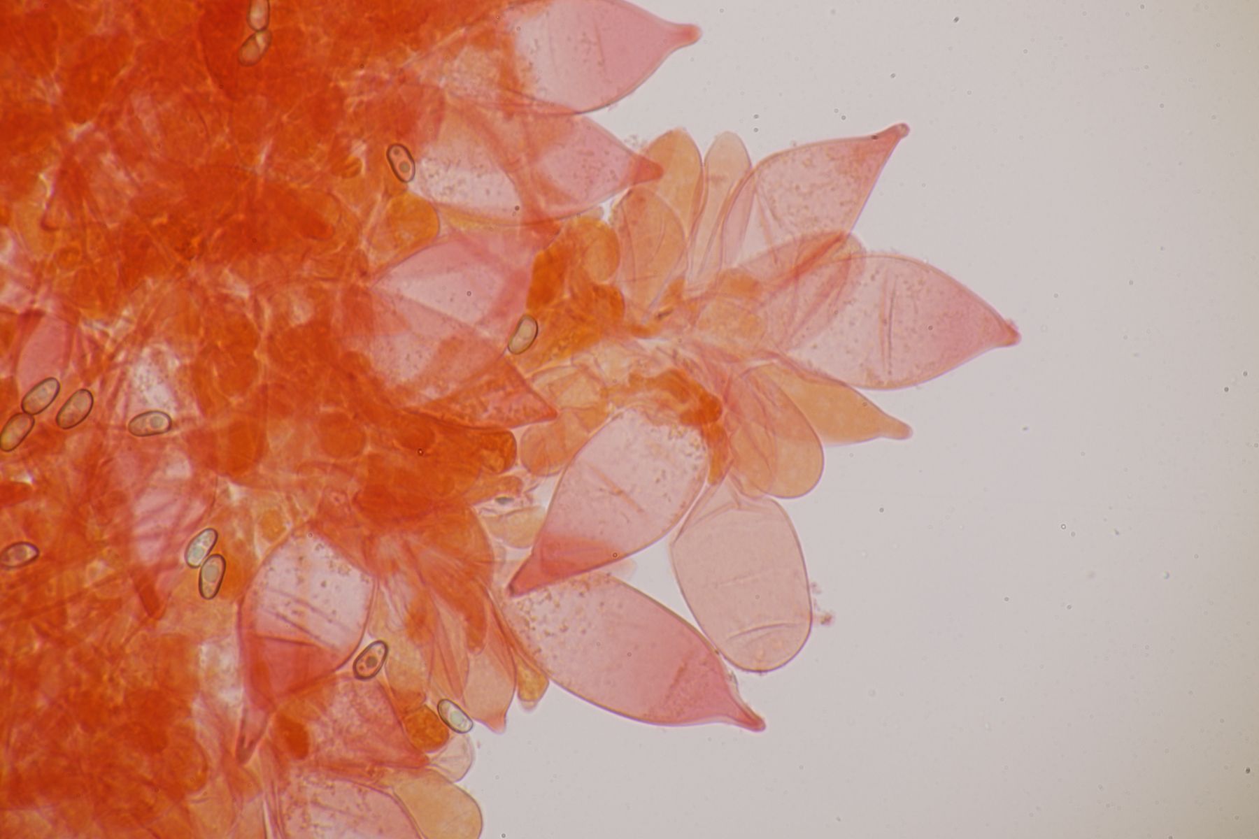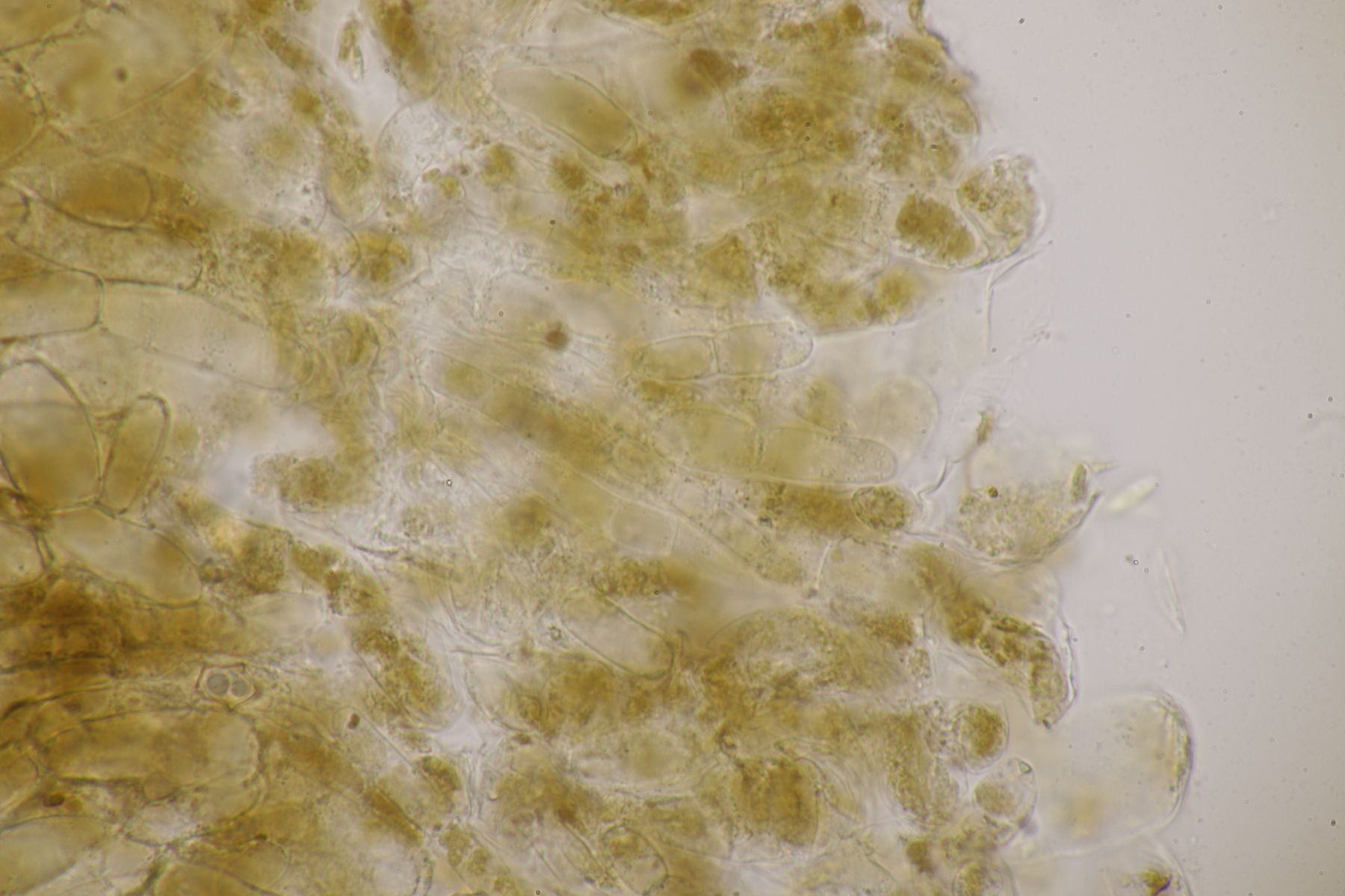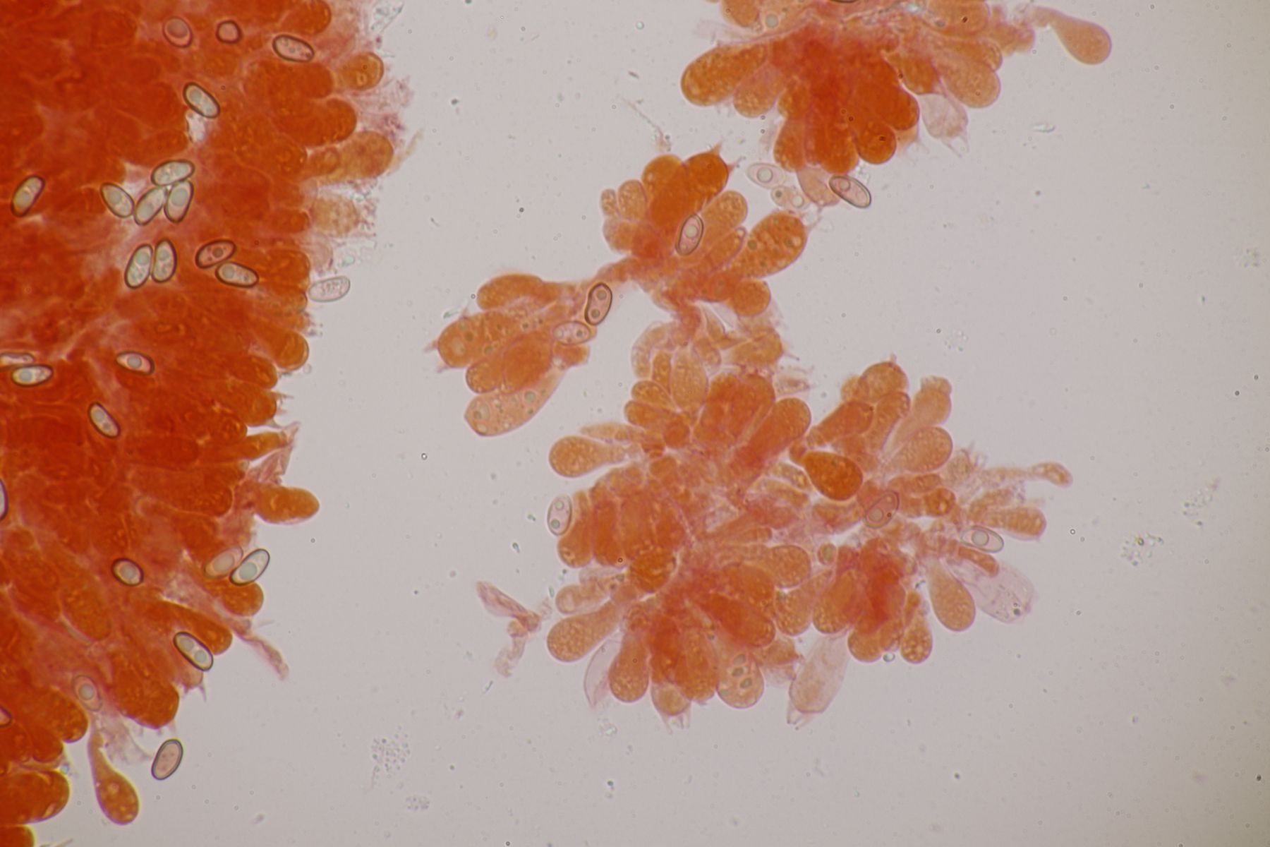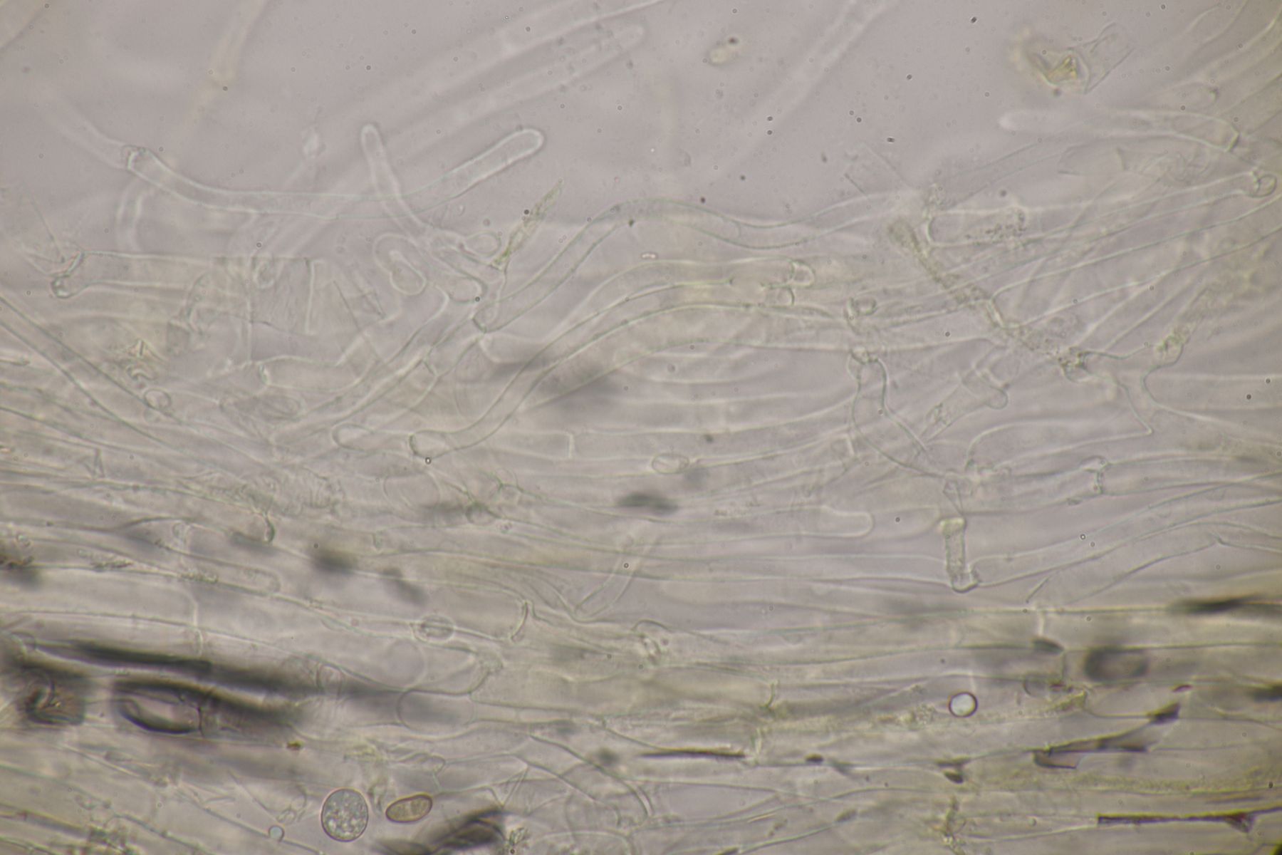 8. Eine Cyanula, die auf der Fläche eines ehemaligen Fischteichs wächst. Die Fläche ist jetzt nur noch im Frühling überflutet und den Rest des Jahres trockengefallen. Der Boden ist hier nicht super mager, da sich auf dem Sandboden im Laufe der Zeit auch etwas Teichschlamm abgelagert hat. Sporen messen 10,4±0,8 µm × 7,9±0,5 µm, Q=1,3±0,1; 9,1-11,6 µm × 6,8-8,8 µm, Q=1,1-1,4. Die Lamellenschneide ist fertil, eventuell sind dort einige sehr schmale Cheilozystiden - das könnten aber auch einfach Basidiolen sein.