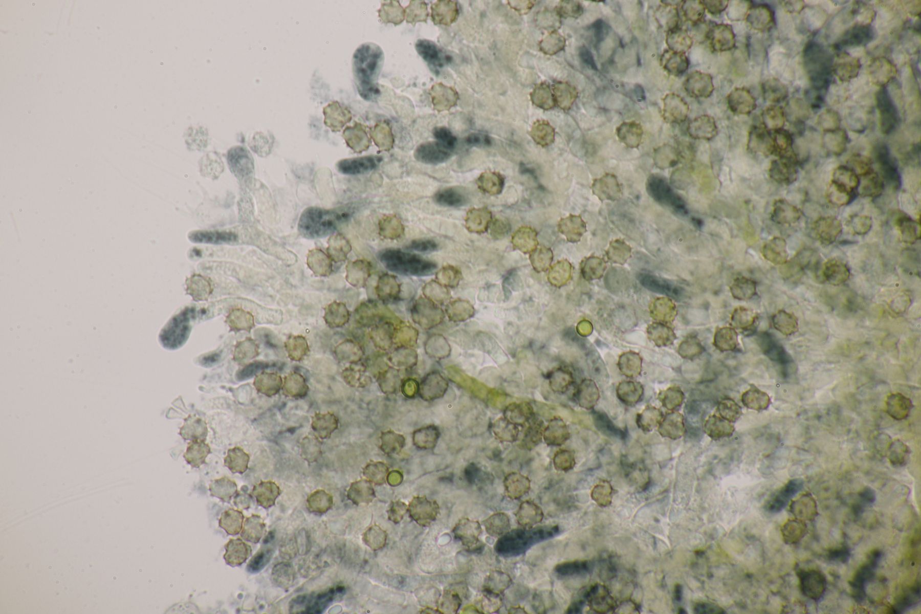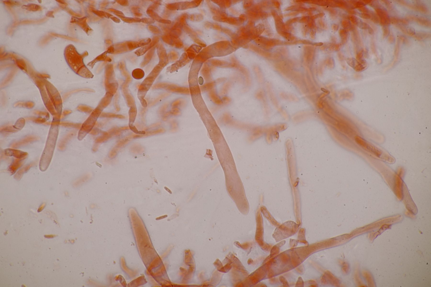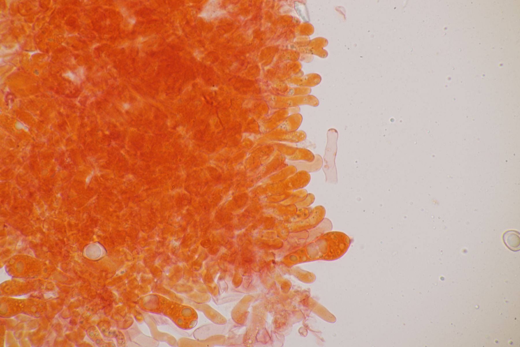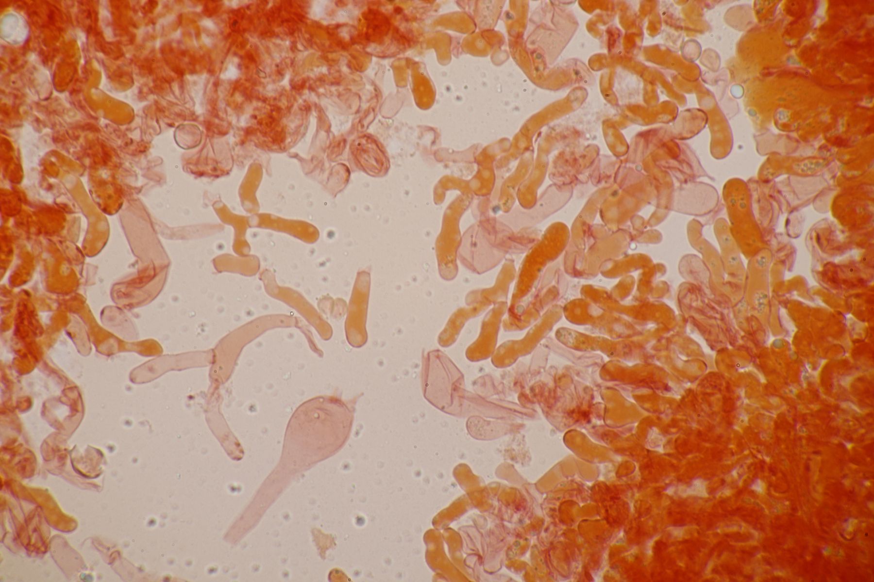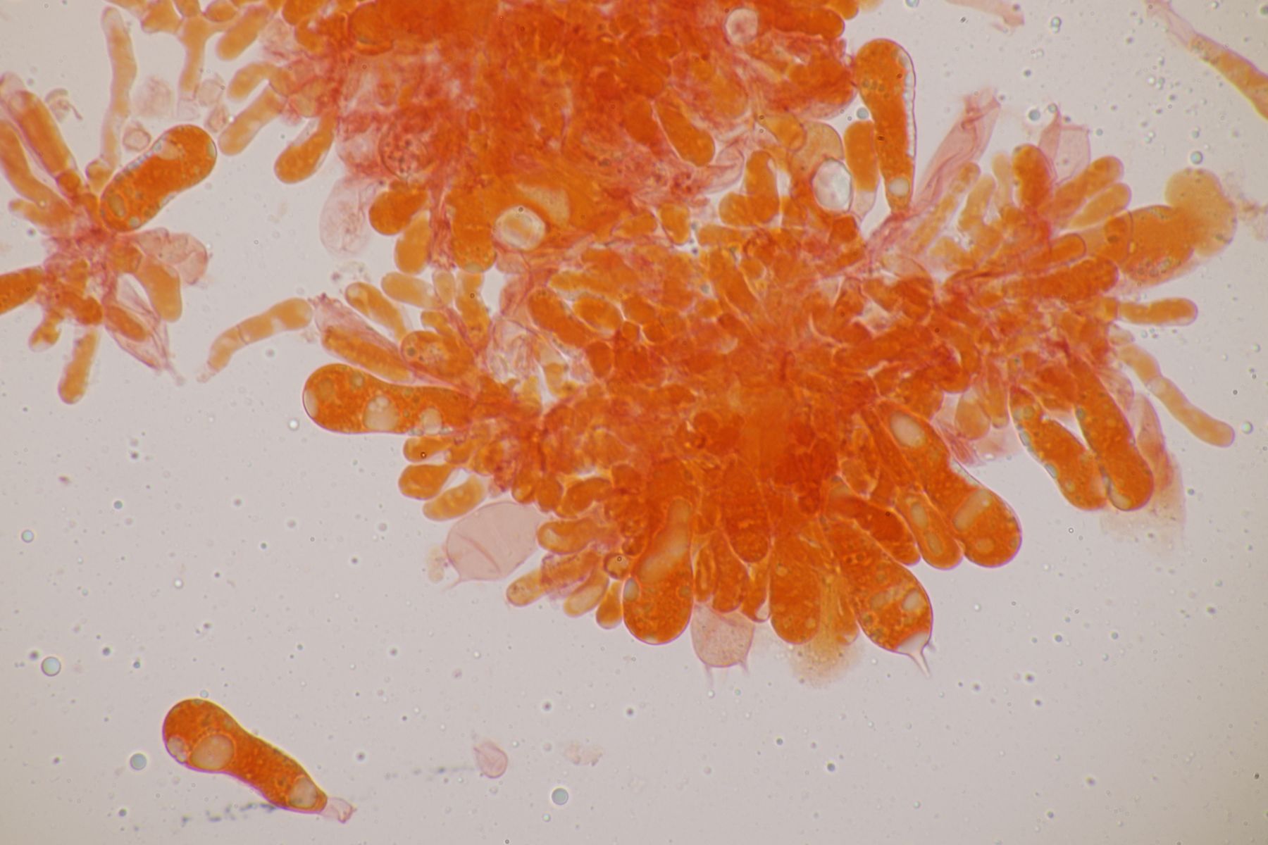 8. Eine Cyanula, die auf der Fläche eines ehemaligen Fischteichs wächst. Die Fläche ist jetzt nur noch im Frühling überflutet und den Rest des Jahres trockengefallen. Der Boden ist hier nicht super mager, da sich auf dem Sandboden im Laufe der Zeit auch etwas Teichschlamm abgelagert hat. Sporen messen 10,4±0,8 µm × 7,9±0,5 µm, Q=1,3±0,1; 9,1-11,6 µm × 6,8-8,8 µm, Q=1,1-1,4. Die Lamellenschneide ist fertil, eventuell sind dort einige sehr schmale Cheilozystiden - das könnten aber auch einfach Basidiolen sein.