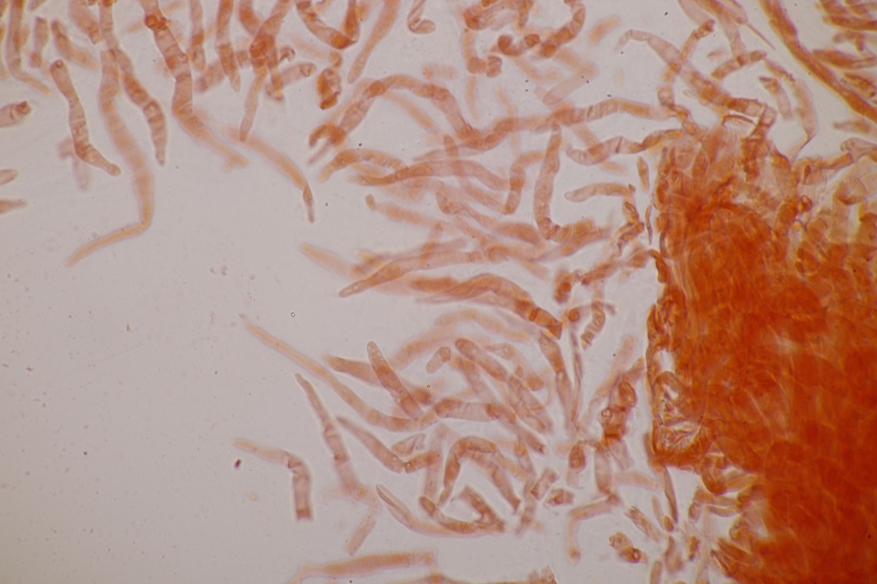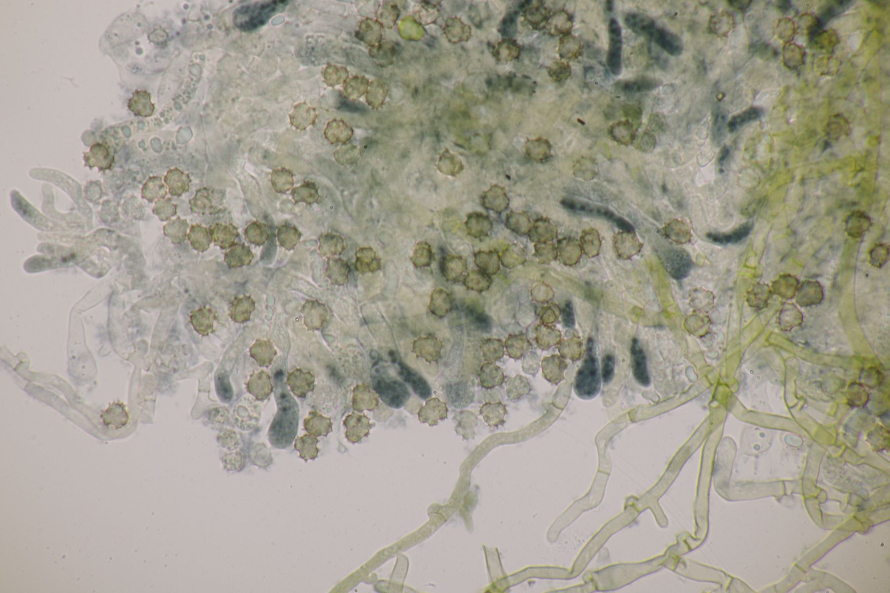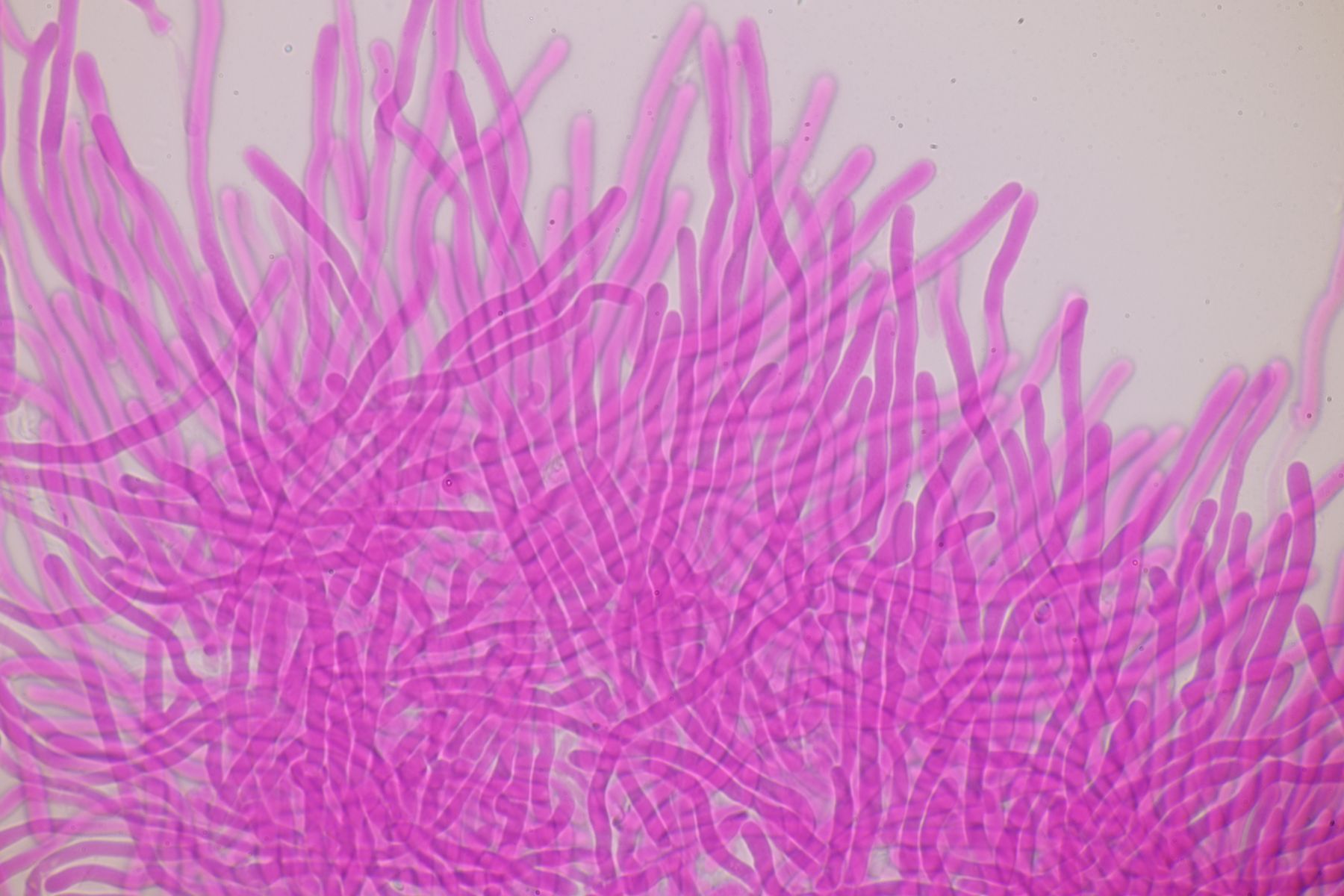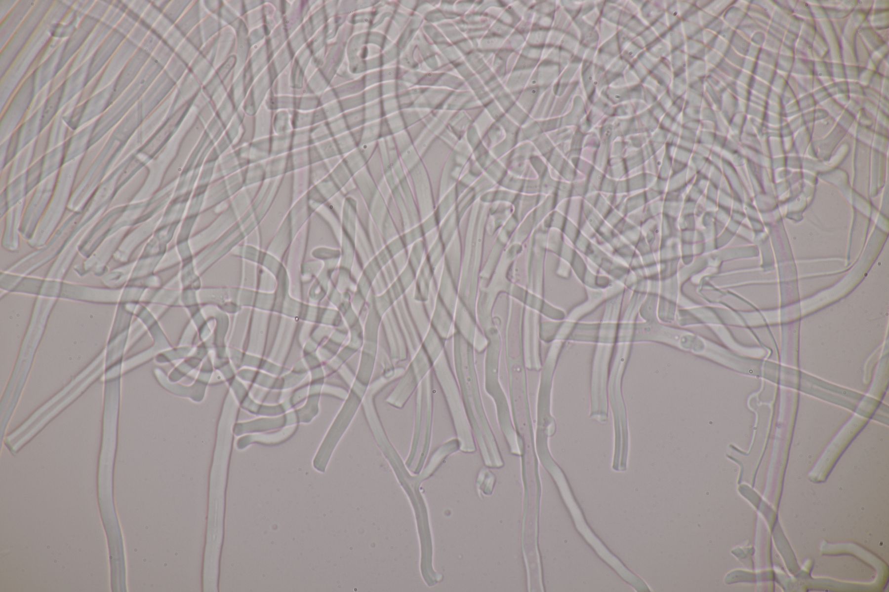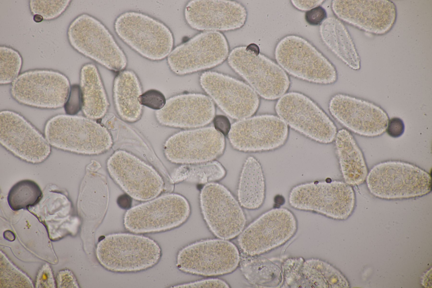 8. Eine Cyanula, die auf der Fläche eines ehemaligen Fischteichs wächst. Die Fläche ist jetzt nur noch im Frühling überflutet und den Rest des Jahres trockengefallen. Der Boden ist hier nicht super mager, da sich auf dem Sandboden im Laufe der Zeit auch etwas Teichschlamm abgelagert hat. Sporen messen 10,4±0,8 µm × 7,9±0,5 µm, Q=1,3±0,1; 9,1-11,6 µm × 6,8-8,8 µm, Q=1,1-1,4. Die Lamellenschneide ist fertil, eventuell sind dort einige sehr schmale Cheilozystiden - das könnten aber auch einfach Basidiolen sein.