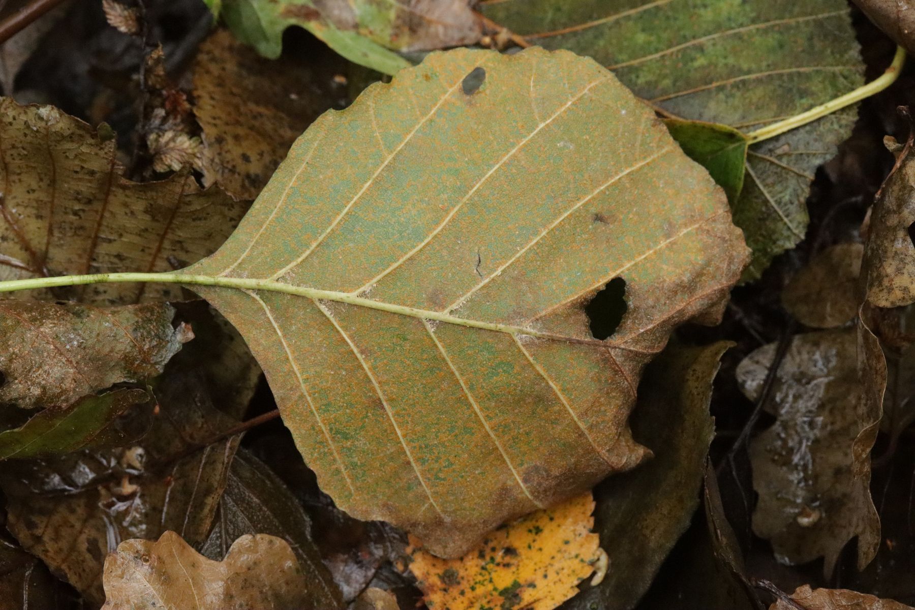 16. Und zum Schluß noch ein Lactarius, der an einer feuchten Stelle unter Salix wuchs, wobei aber auch Alnus und Quercus in Reichweite waren. Die Sporen messen 7,3±0,4 µm × 5,9±0,3 µm, Q=1,3±0,1; 6,4-8 µm × 5,2-6,6 µm, Q=1,1-1,5. Damit ist L. lacunarum raus und es kommen eigentlich nur die Erlenmilchlinge in Frage. Die Sporengröße paßt dann am besten zu L. omphaliformis und auch die Huthaut scheint dem nicht zu widersprechen.