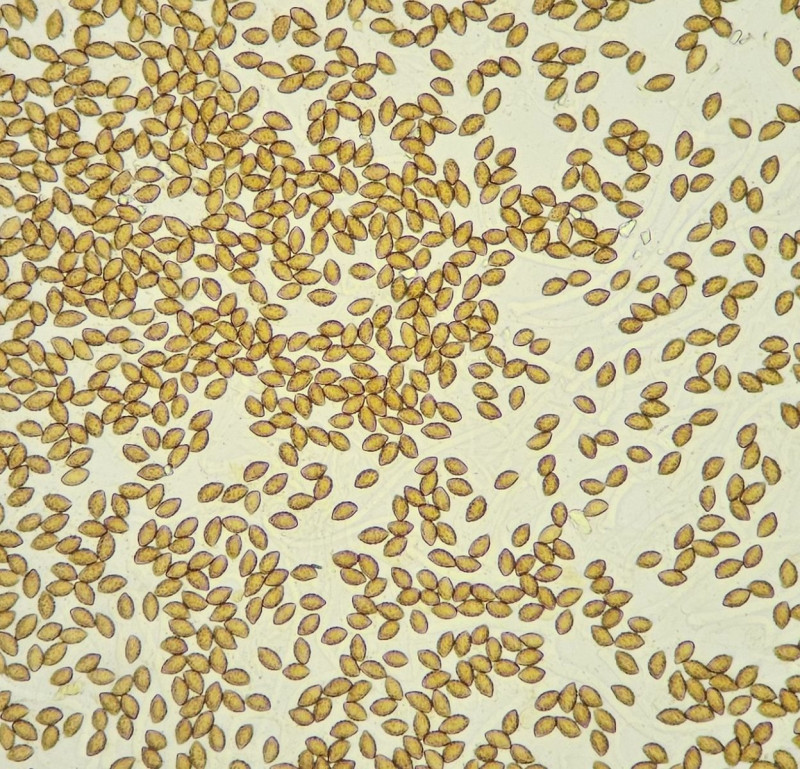 Kräftiger Habitus. Hut ocker-/olive-farben, am Hutrand heller; keine dunklere Hutmitte oder schorfige Flecken, ordentlich schleimig (aber es war klatschnass im Wald, da ist wohl alles schleimig). Lamellen schmutzig olive bis leicht bräunlich. Weißlicher Stiel, der in eine hart gerandete Knolle übergeht. Knollenrand ockerfarben, Knollenunterseite weiß. Fleisch weißlich. Geruch nicht stark aber dennoch wahrnehmbar rettichartig; Geschmack ebenso, wobei die Beschreibung "nach Petersilie" etwas besser passt (ich finde es schwierig beide Gerüche/Geschmäcker sauber voneinander abzugrenzen). KOH auf dem Hut undeutlich bräunlich, sonst in allen Teilen negativ. Sporen 11,1 x 6,5μm; Q=1,71; zitronenförmig bis leicht mandelförmig, sehr grob und isoliert warzig.
