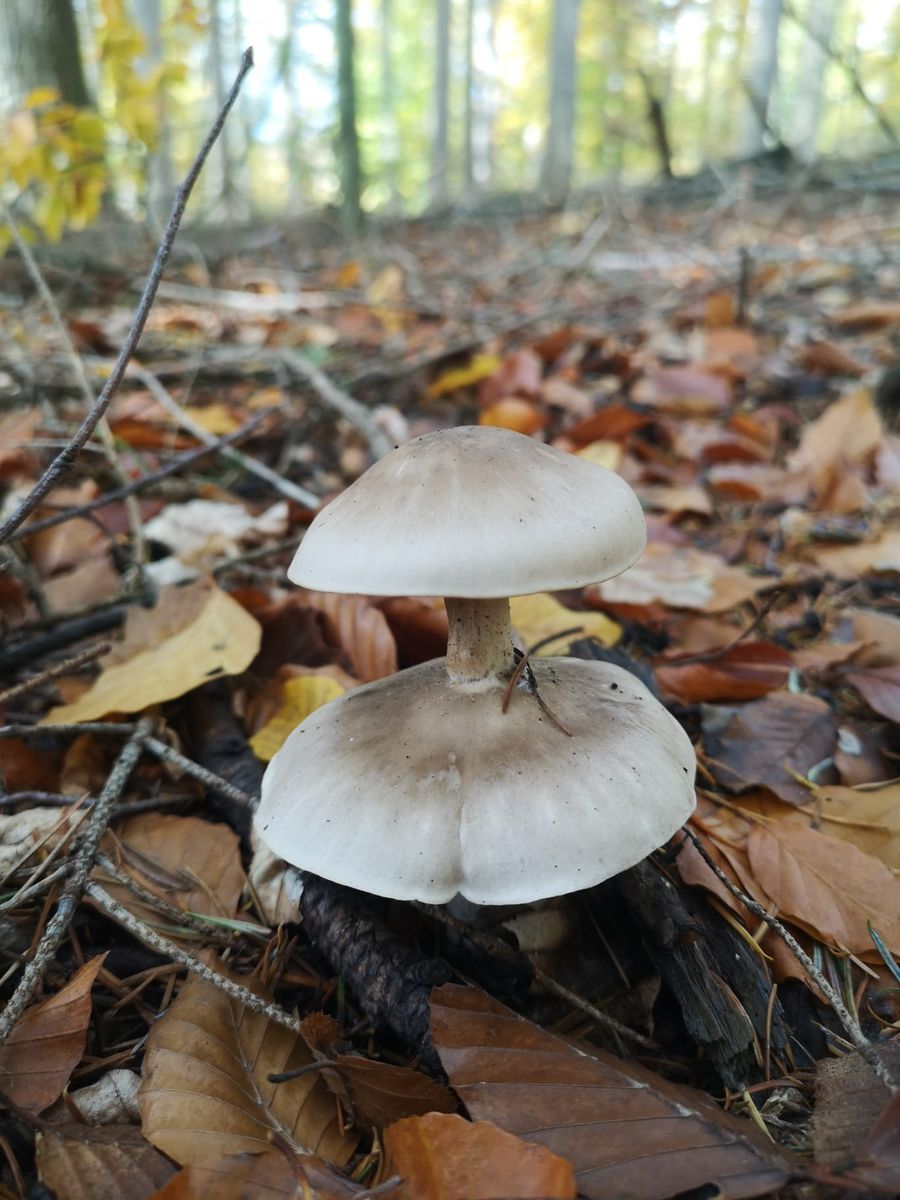 Das ist nicht so selten. Die sind Folgezersetzer und wenn in einer dicken Laubschicht zufällig zwei Fruchtkörper übereinander gebildet werden, dann hebt der Untere den Oberen hoch.